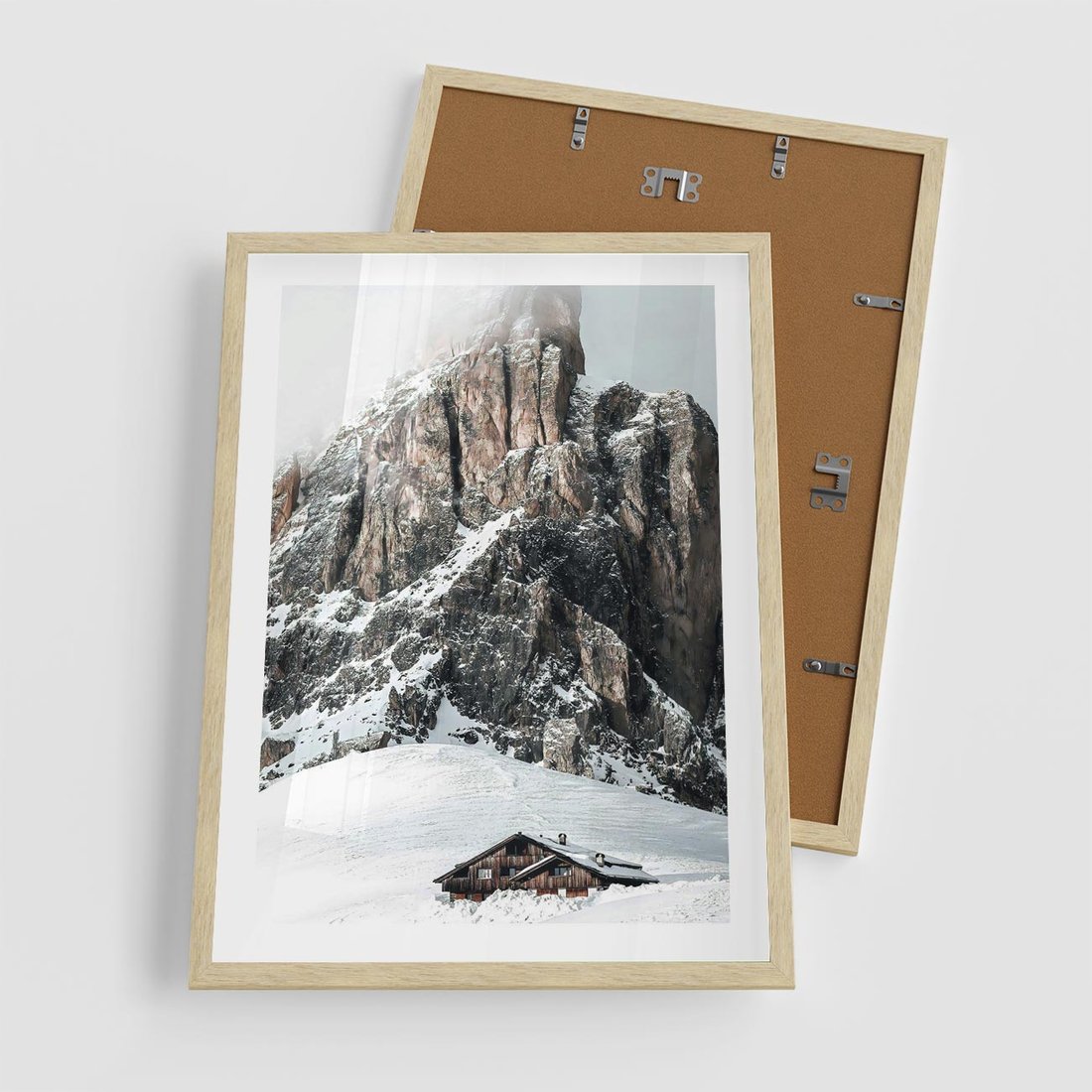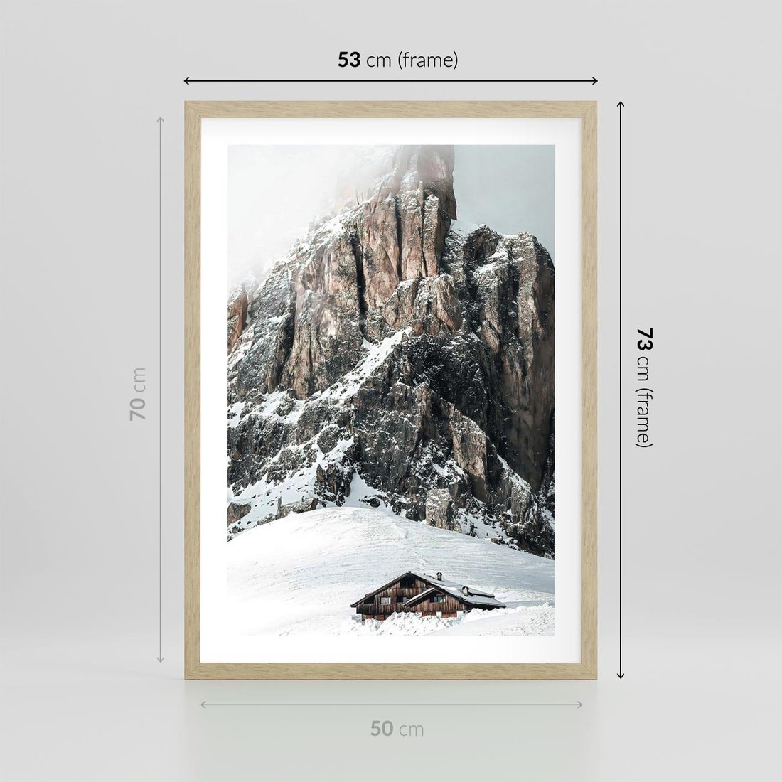 Plakat w ramie 50x70 - Górski Raj z Chatką - górskie szczyty, ośnieżone góry - rama drewno