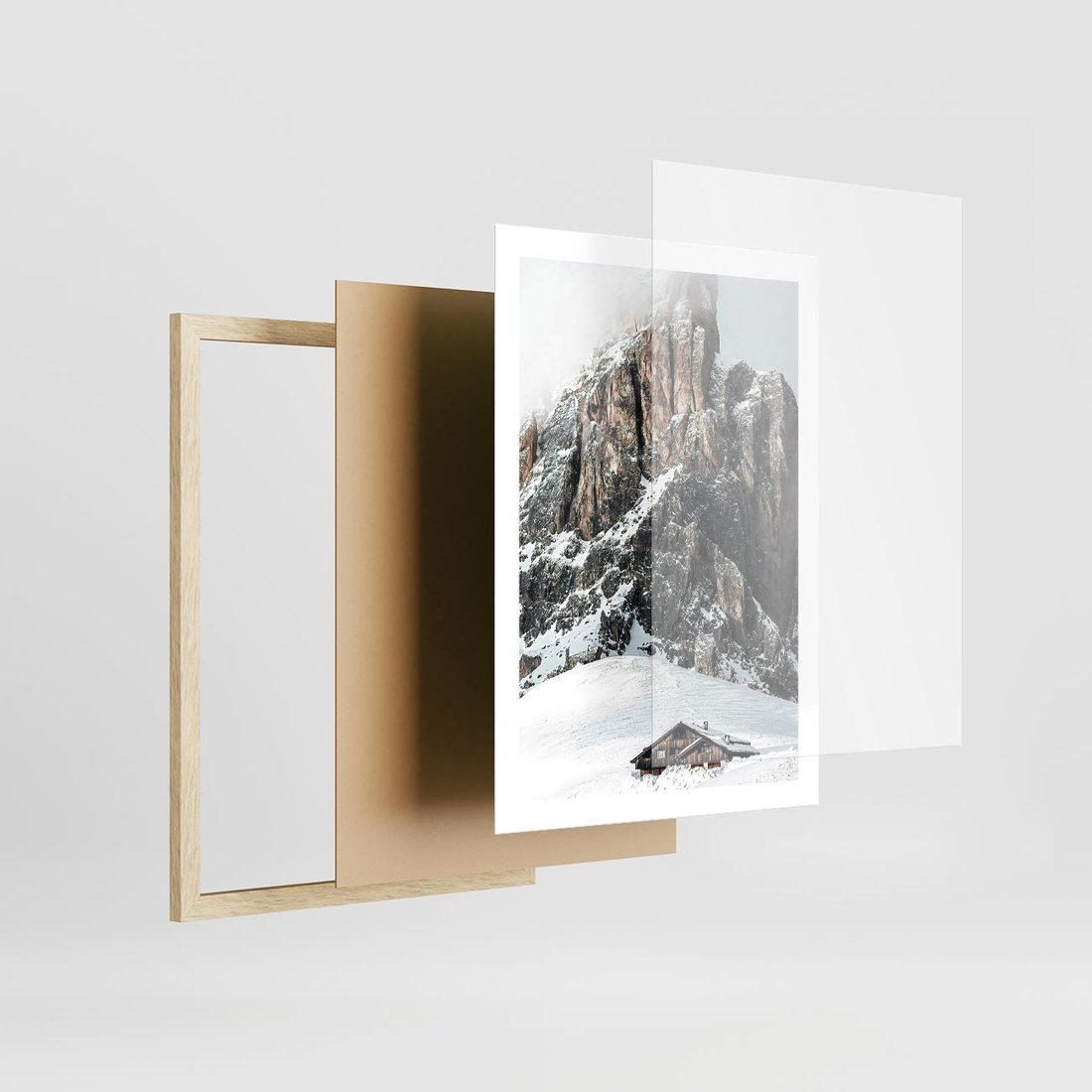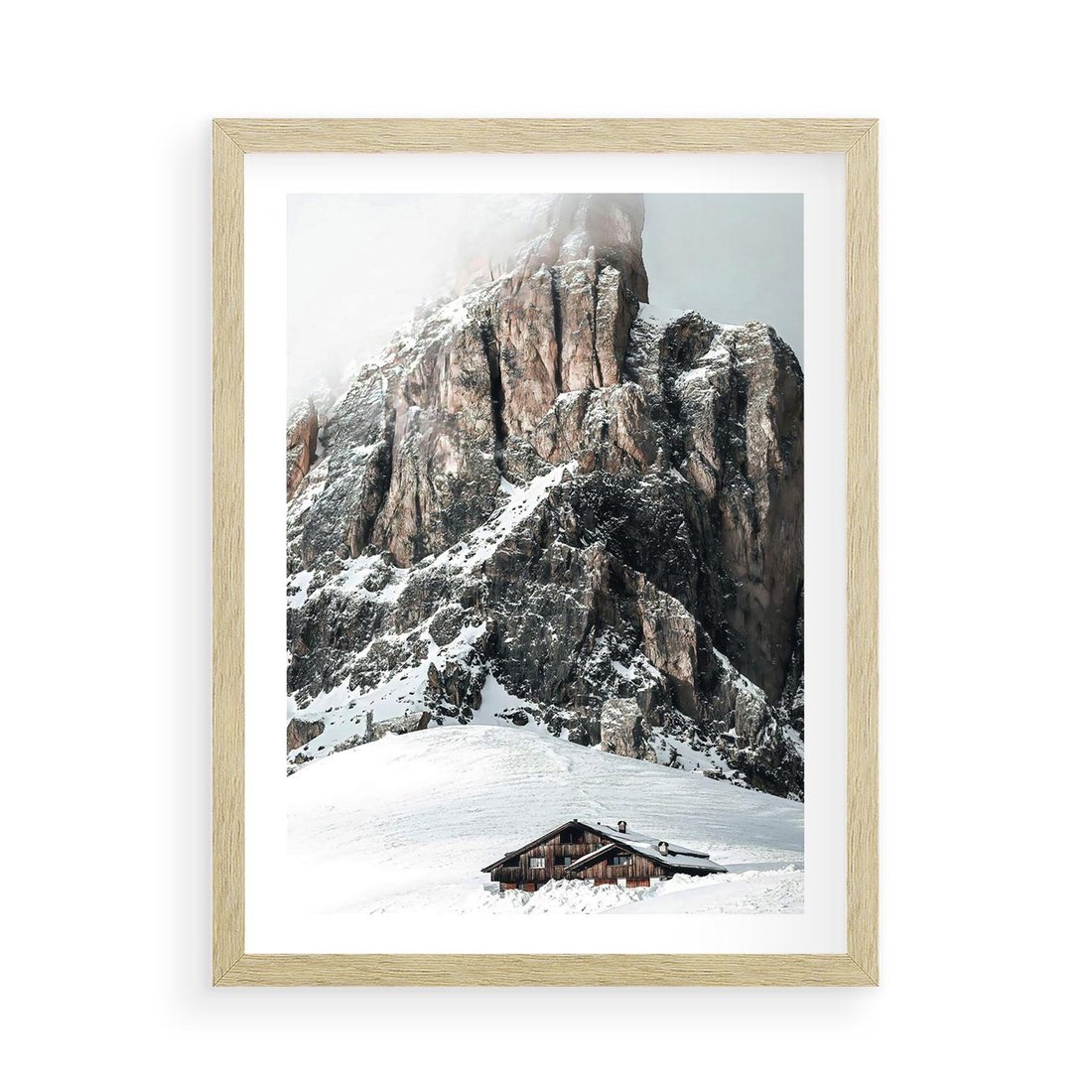 Obraz przedstawia majestatyczne górskie szczyty pokryte śniegiem, a wśród nich uroczą chatkę w górach. Ta sceneria doskonale pasuje do wnętrz utrzymanych w stylu górskim lub chalet, dodając im atmosferycznego uroku.