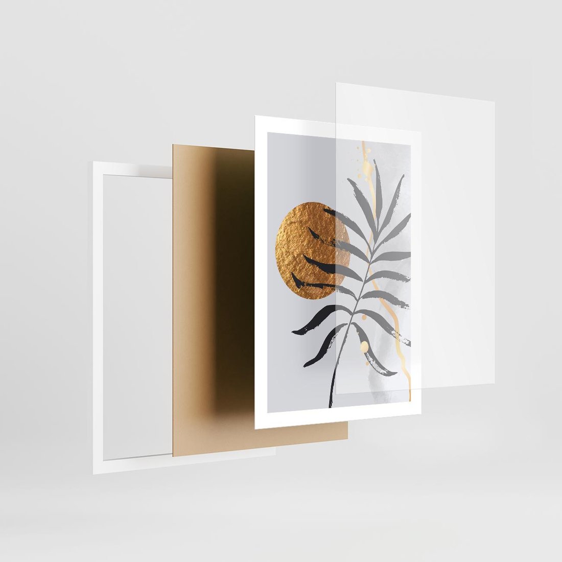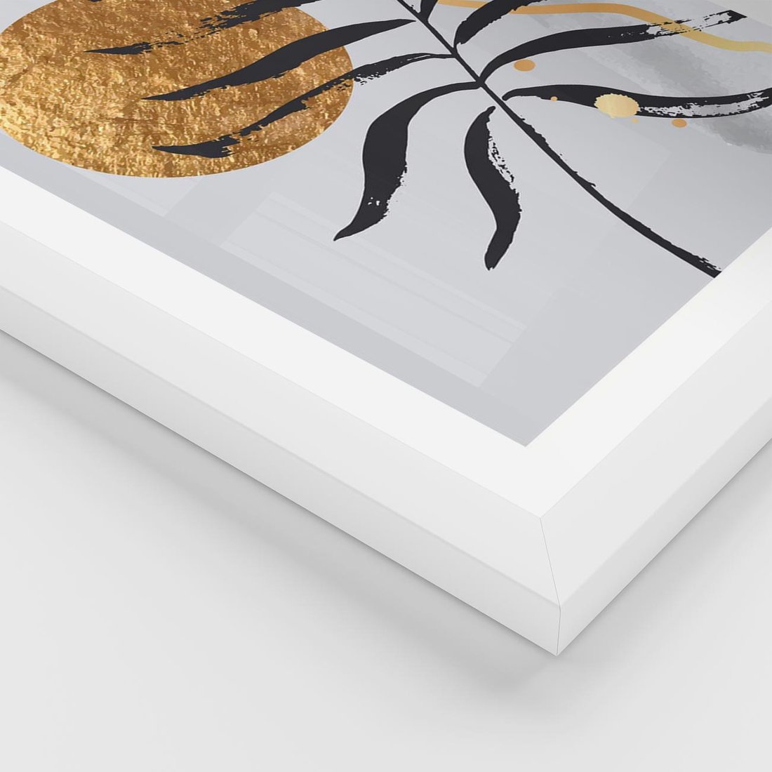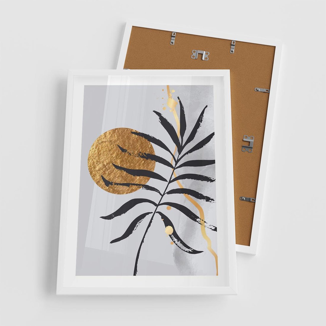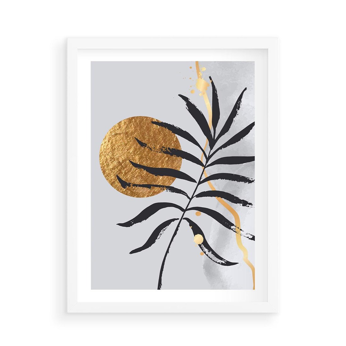 Plakat w ramie 50x70 - Grafika z Czarnym Liściem Palmy - czarny liść palmy, złóte kołó - rama biała