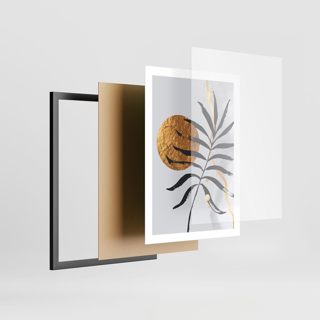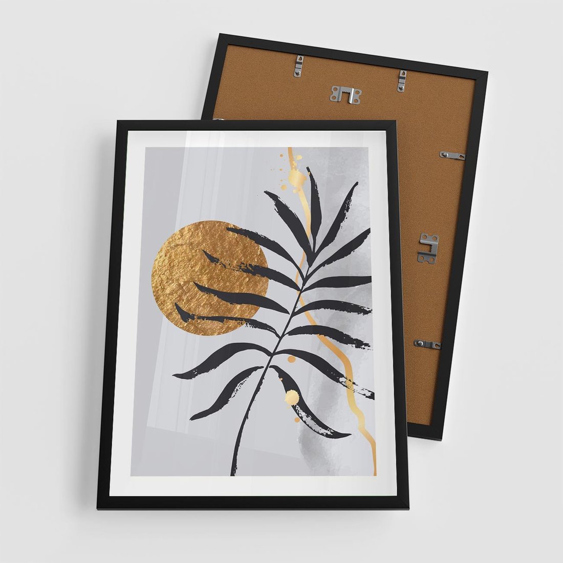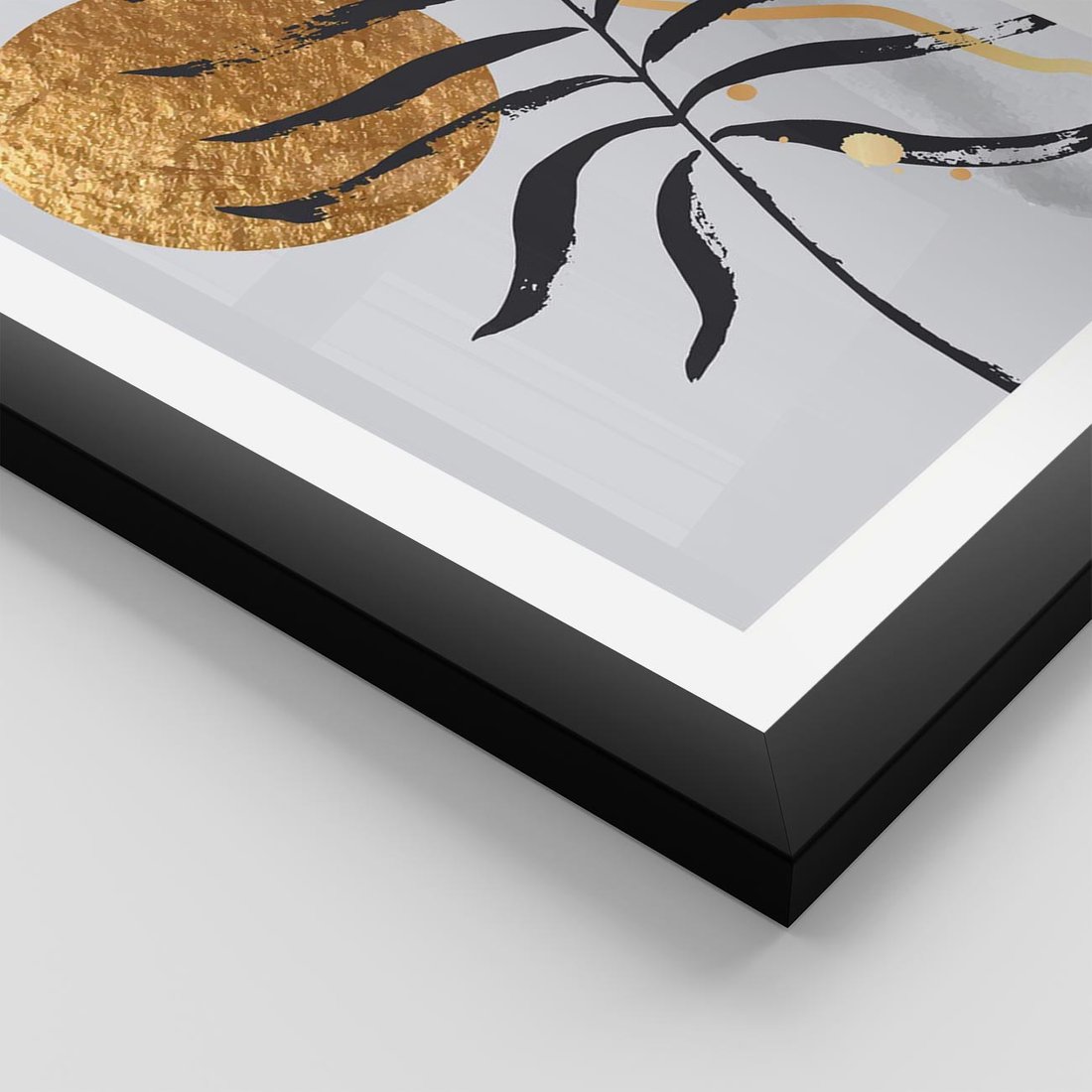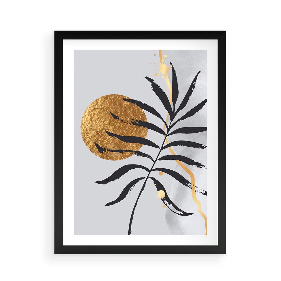 Plakat w ramie 50x70 - Grafika z Czarnym Liściem Palmy - czarny liść palmy, złóte kołó - rama czarna
