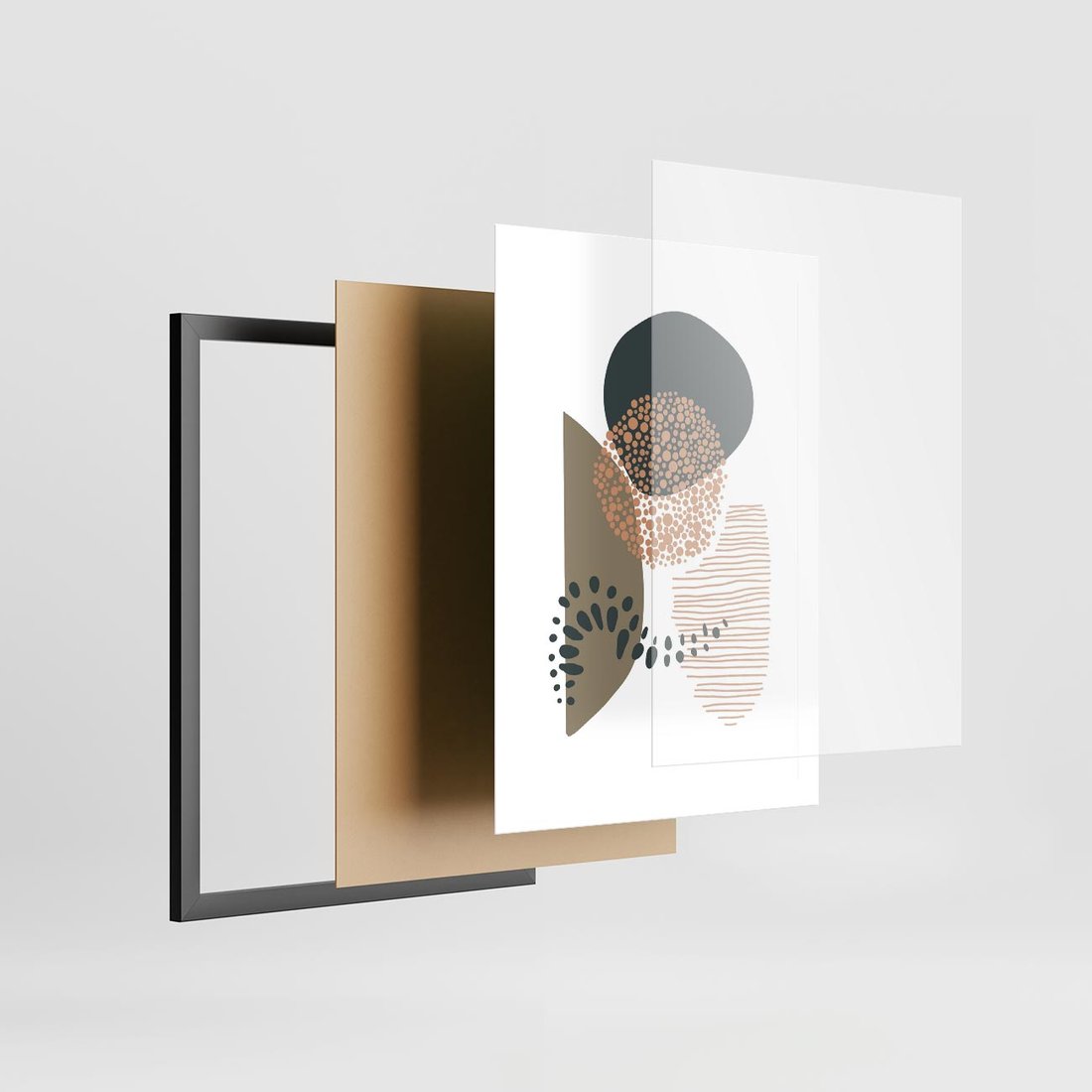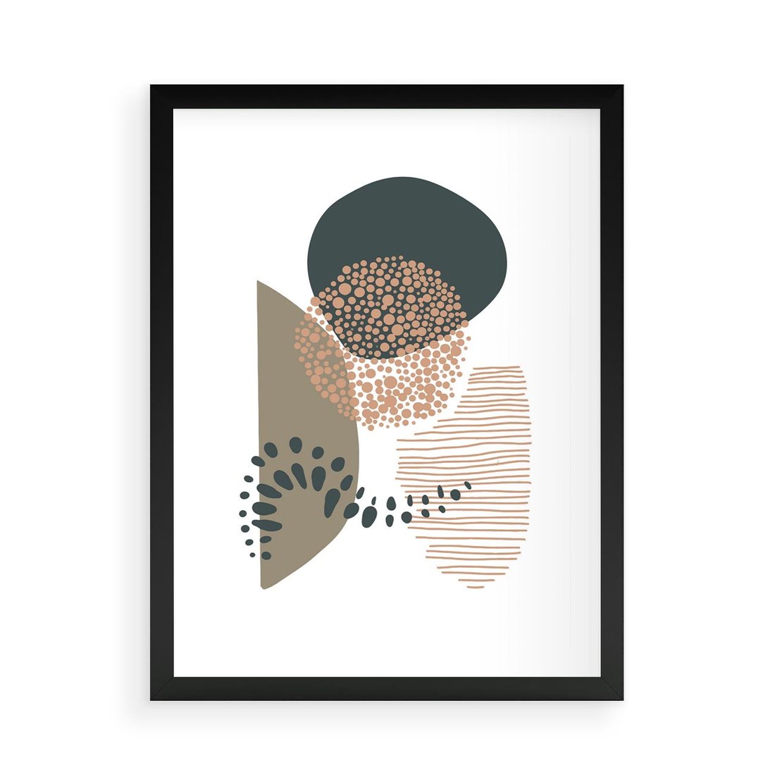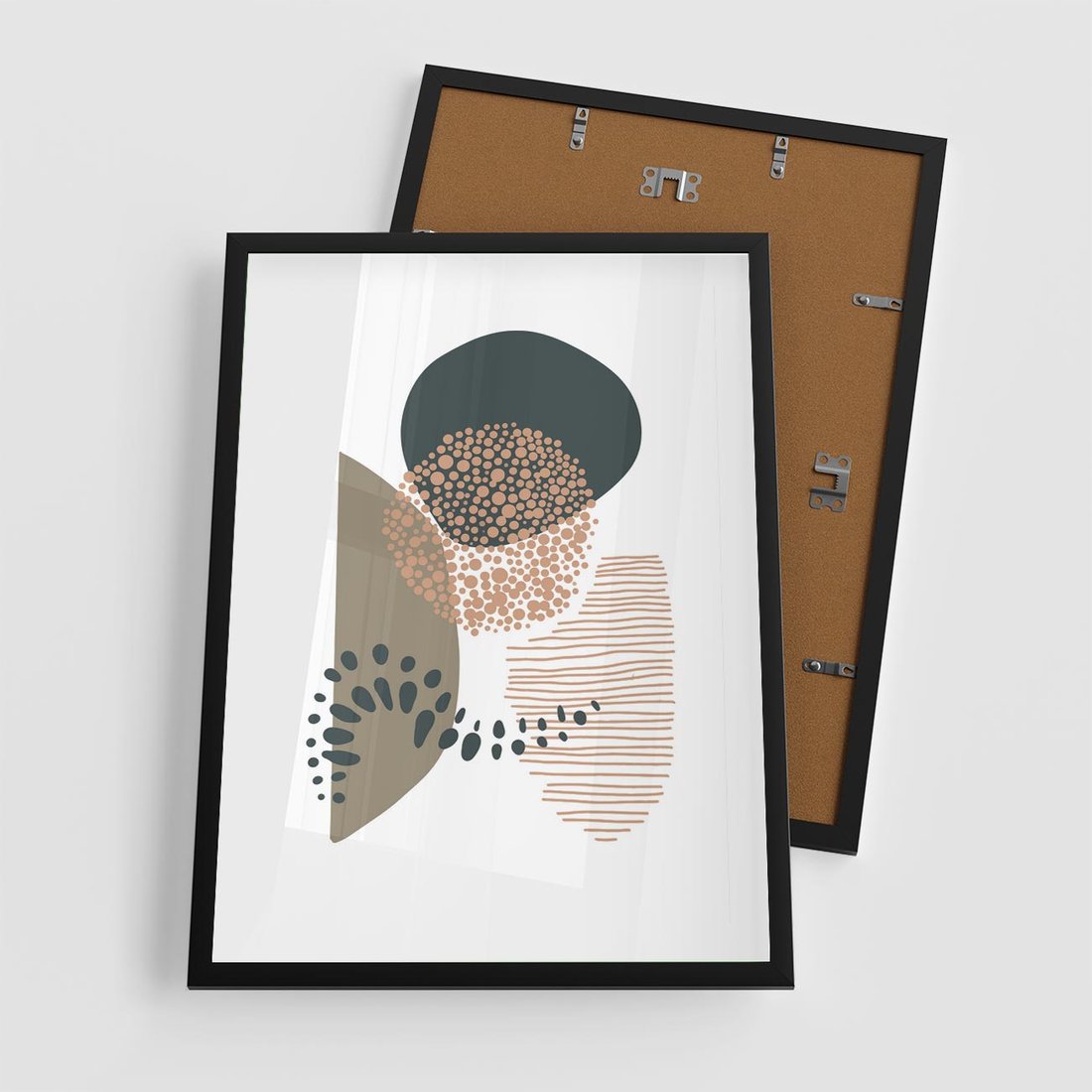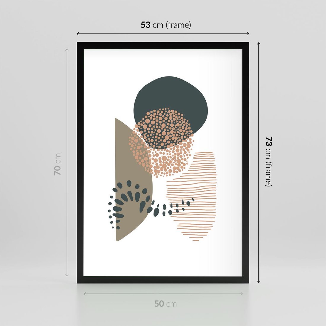 Ta abstrakcyjna kompozycja składa się z delikatnych kropek, kresek i kółek, w stonowanych odcieniach brązu i beżu. Przenosi spokój i harmonię, emanując minimalistycznym pięknem do każdego wnętrza.