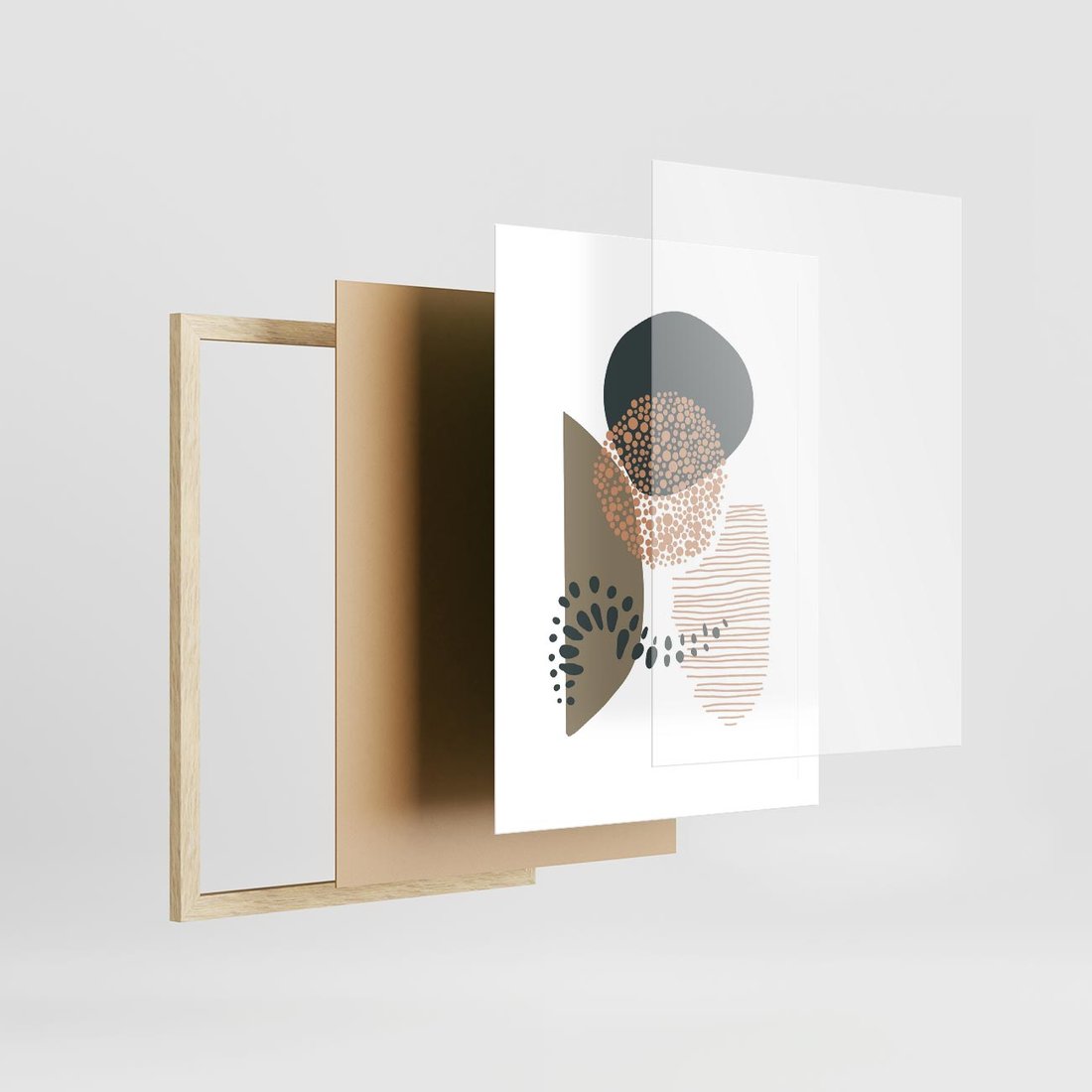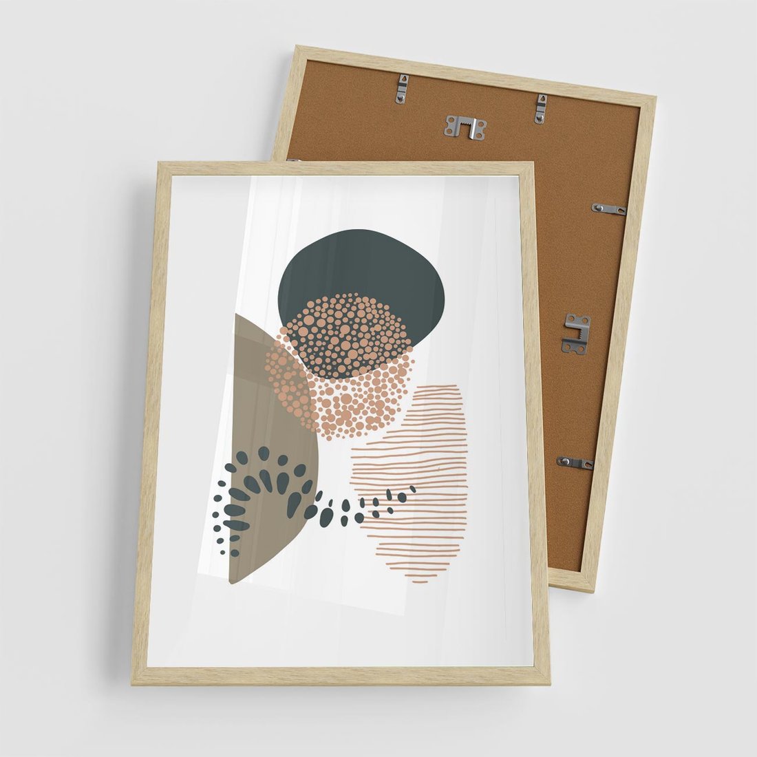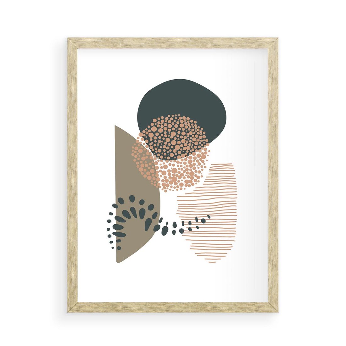 Ta abstrakcyjna kompozycja składa się z delikatnych kropek, kresek i kółek, w stonowanych odcieniach brązu i beżu. Przenosi spokój i harmonię, emanując minimalistycznym pięknem do każdego wnętrza.