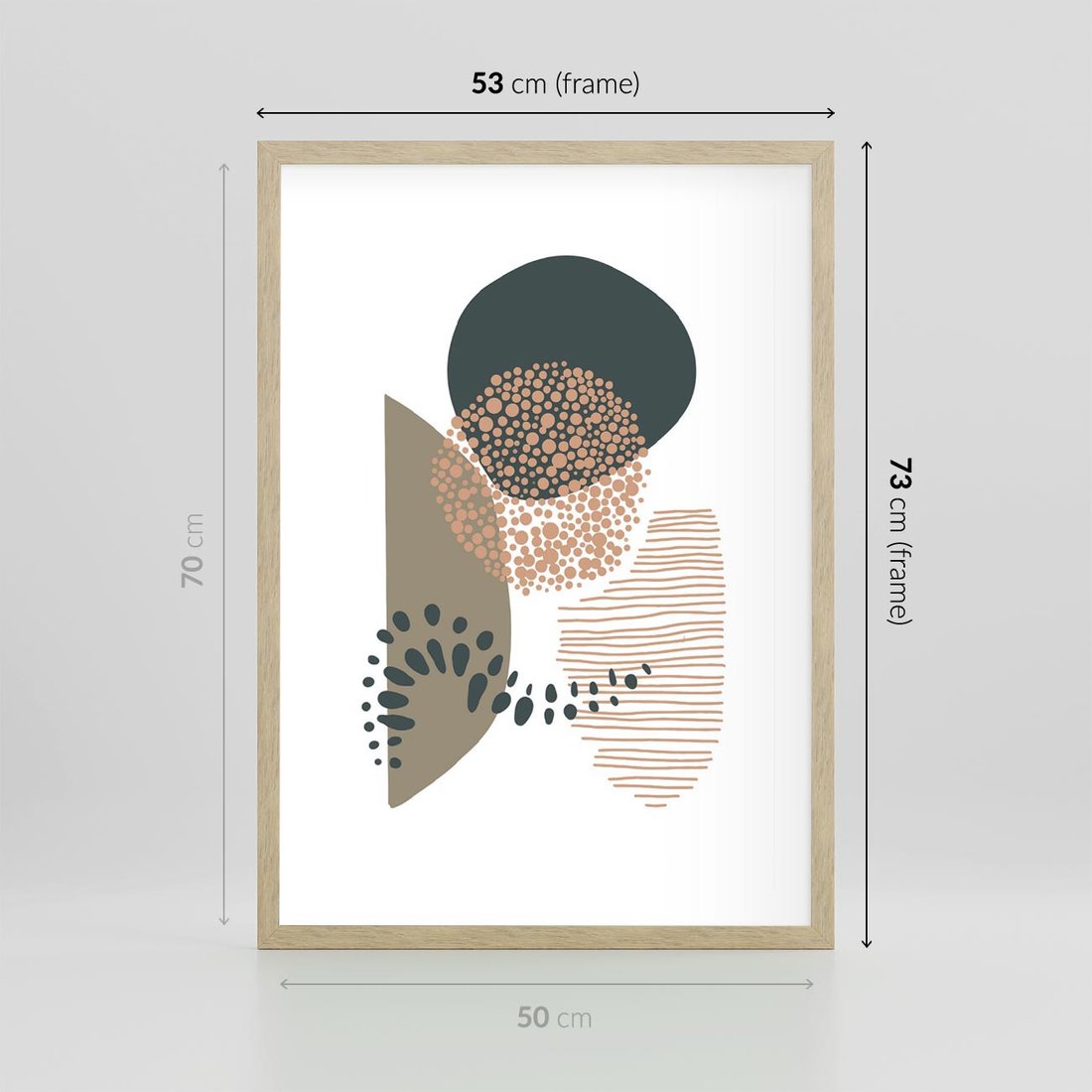 Plakat w ramie 50x70 - Harmonia Akwarelowych Przestrzeni - abstrakcyjna kompozycja z kropek kresek i kółek, odcienie brązu i beżu - rama drewno