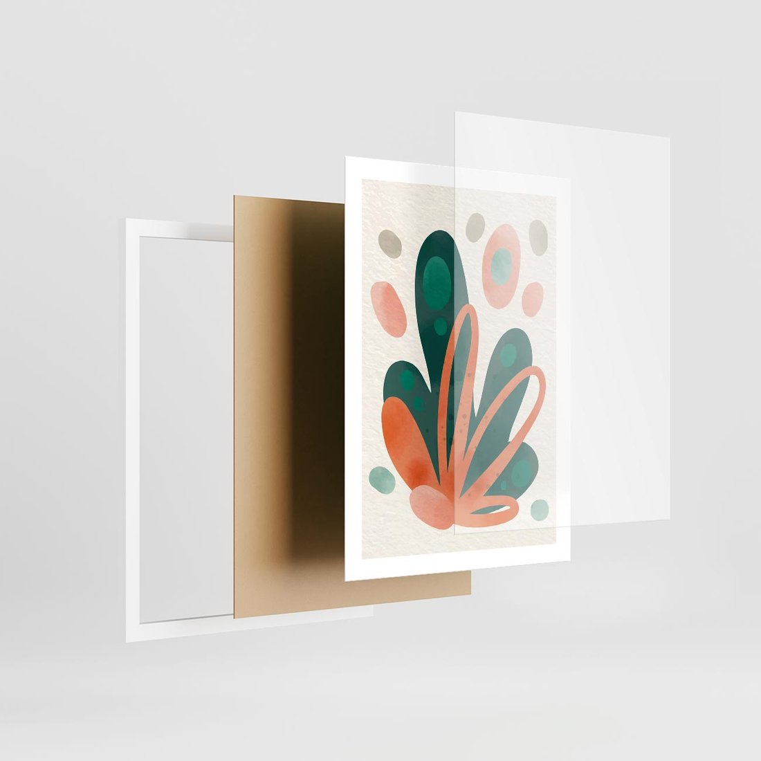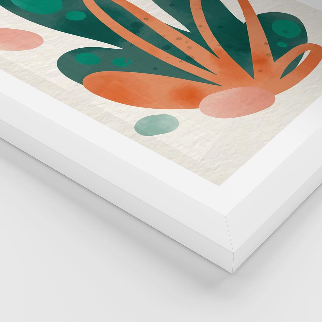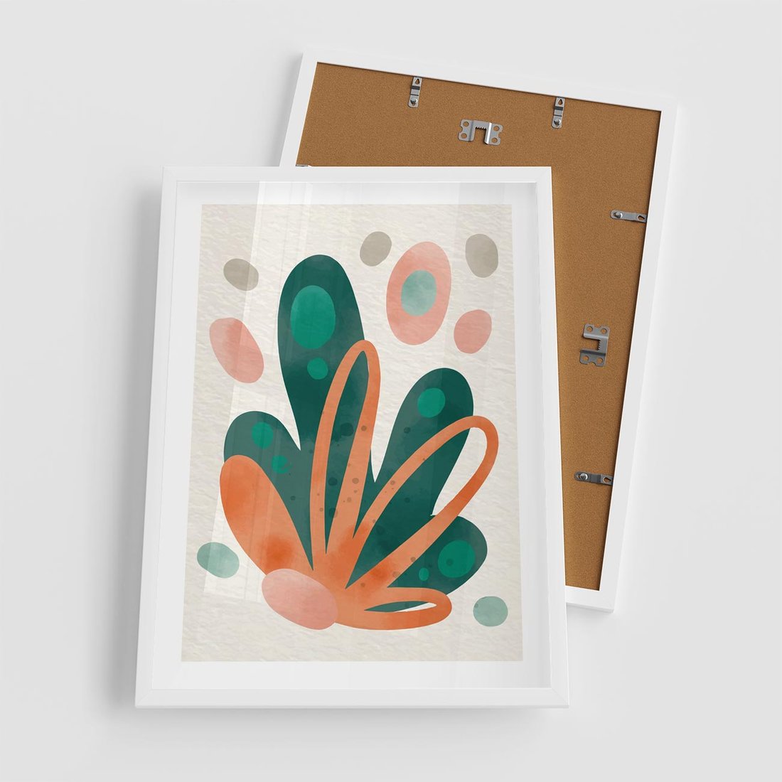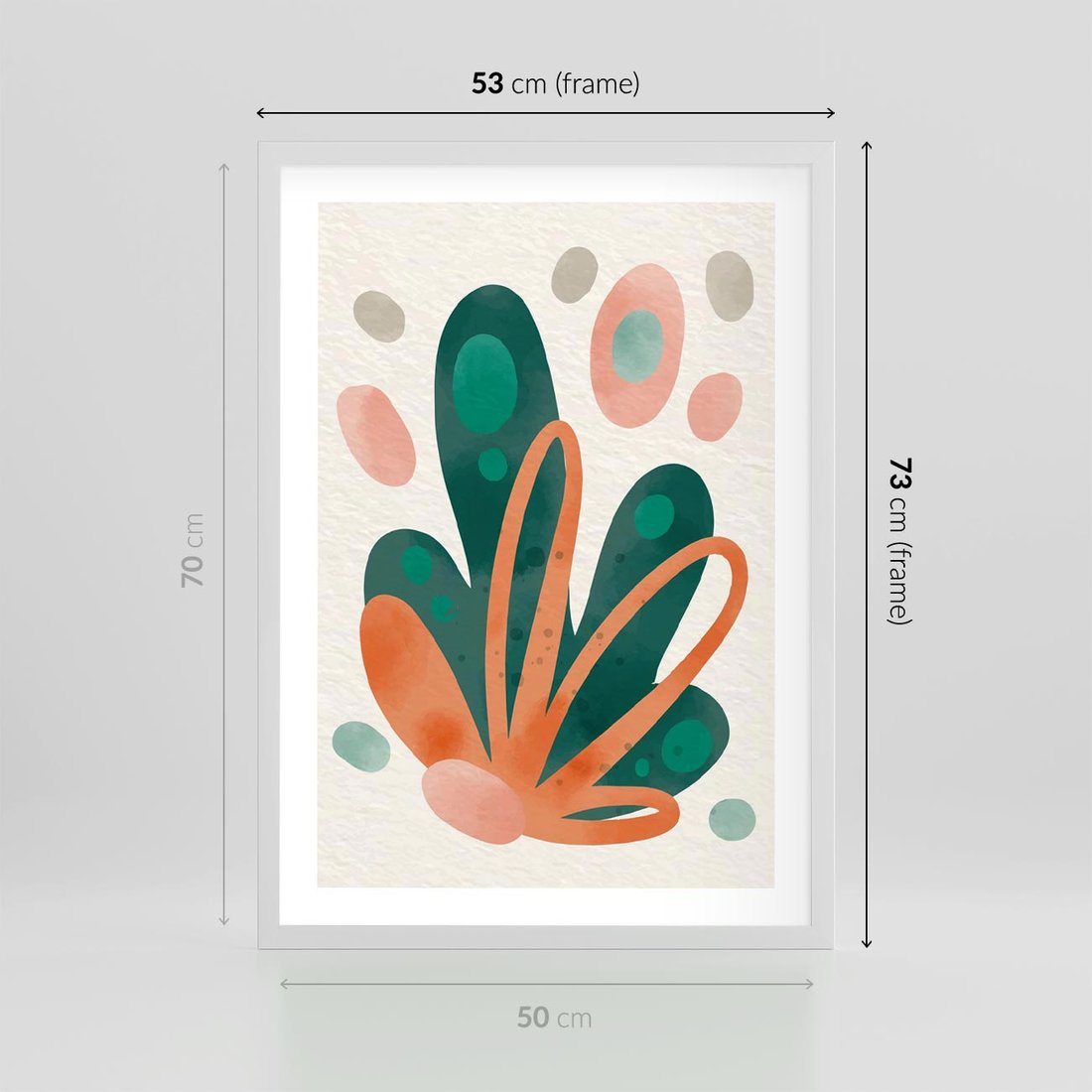 Plakat w ramie 50x70 - Harmonia bez Harmonii - akwarelowe abstrakcyjne kształty, zieleń i pomarańcz - rama biała