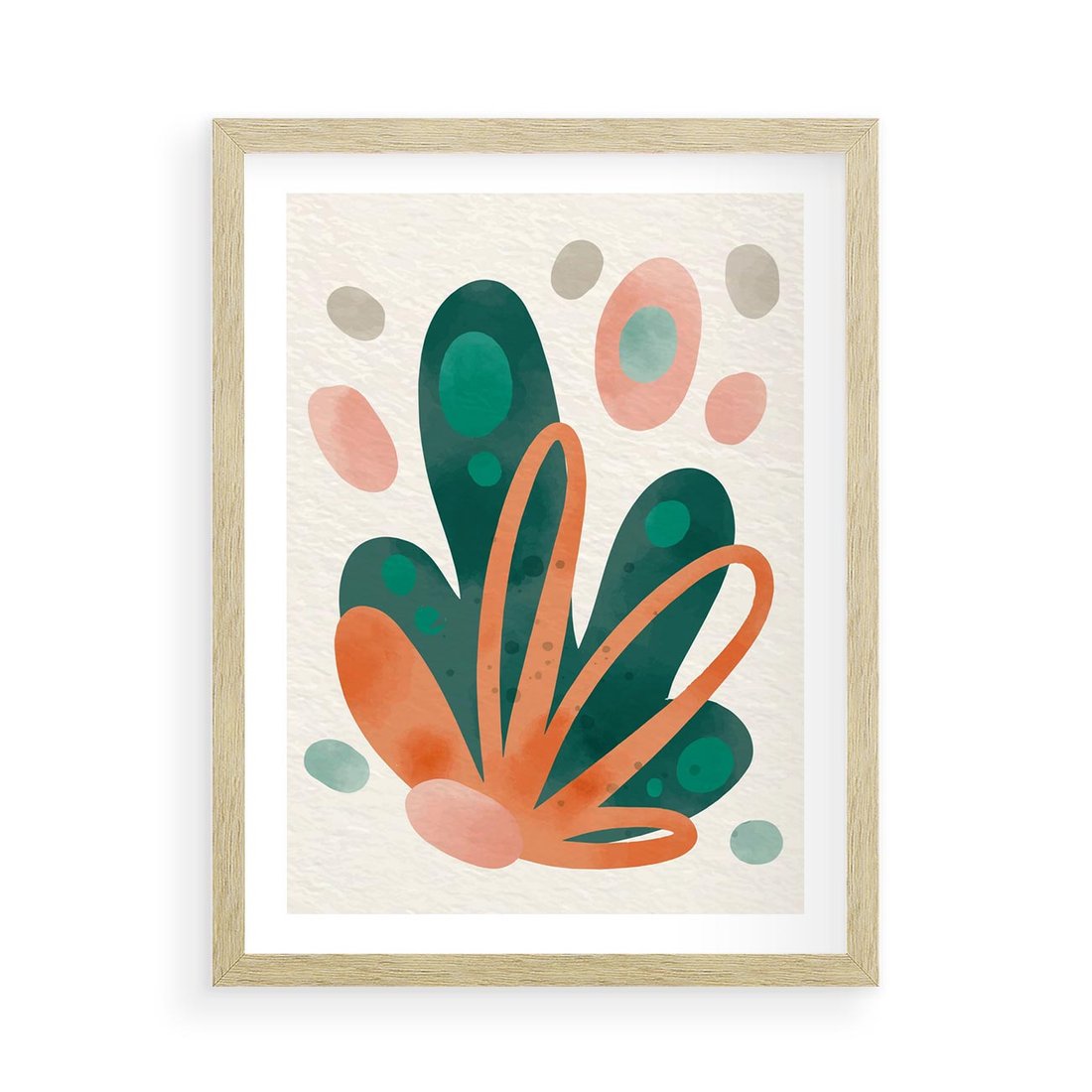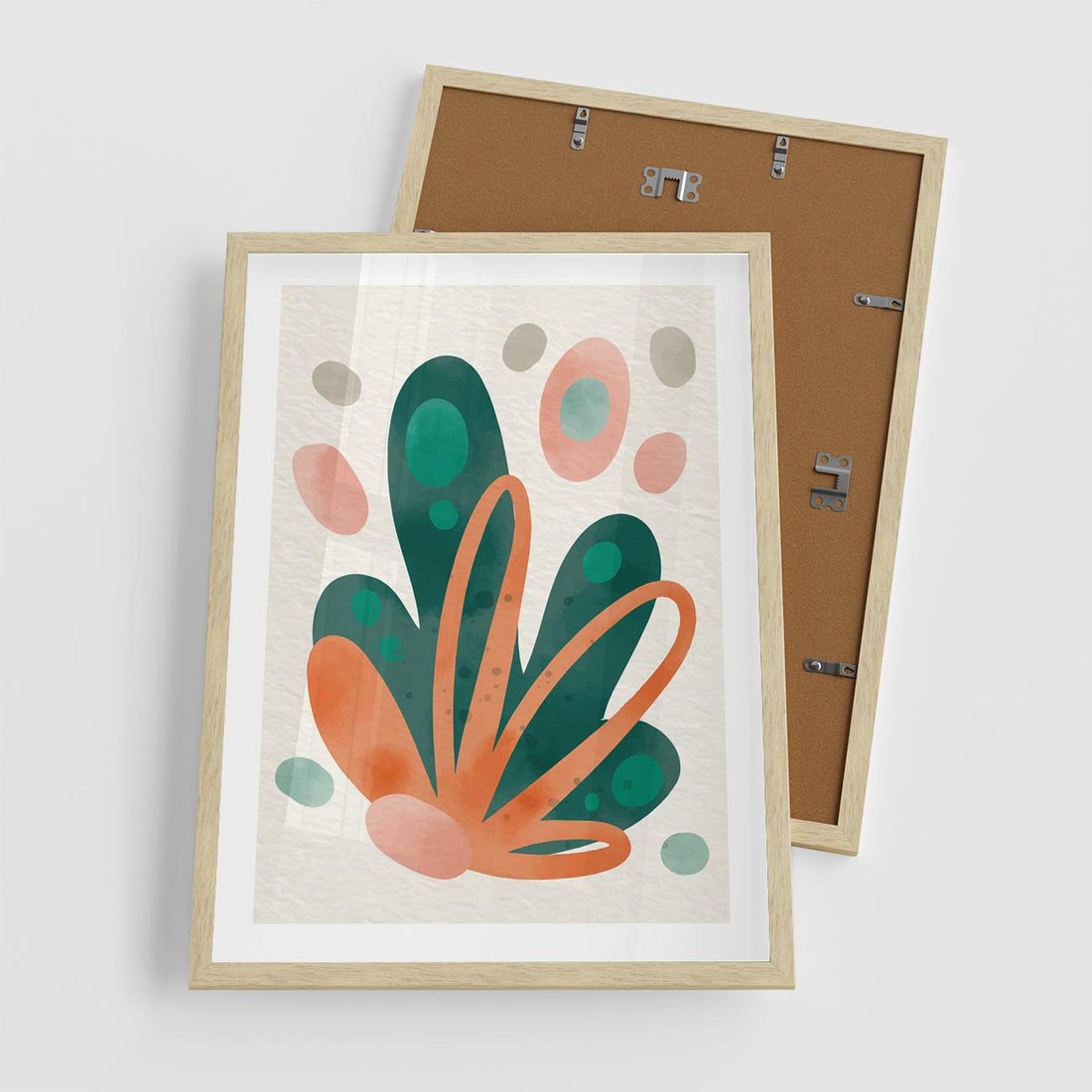 Plakat w ramie 50x70 - Harmonia bez Harmonii - akwarelowe abstrakcyjne kształty, zieleń i pomarańcz - rama drewno