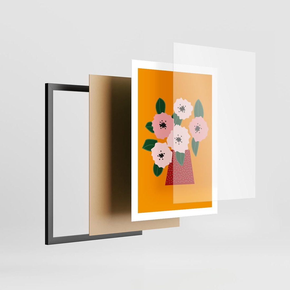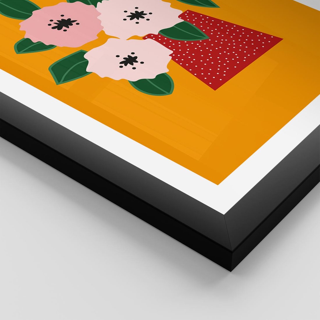 Plakat w ramie 50x70 - Harmonijne Granice - abstrakcyjne kwiaty, żółte tło - rama czarna