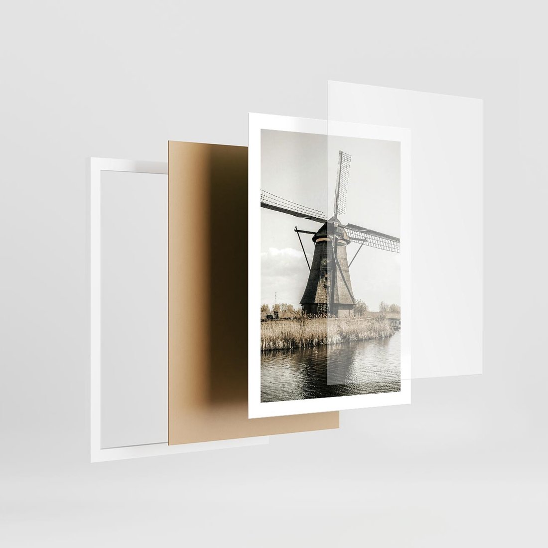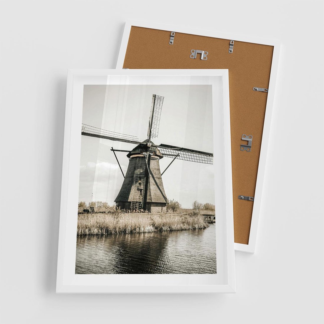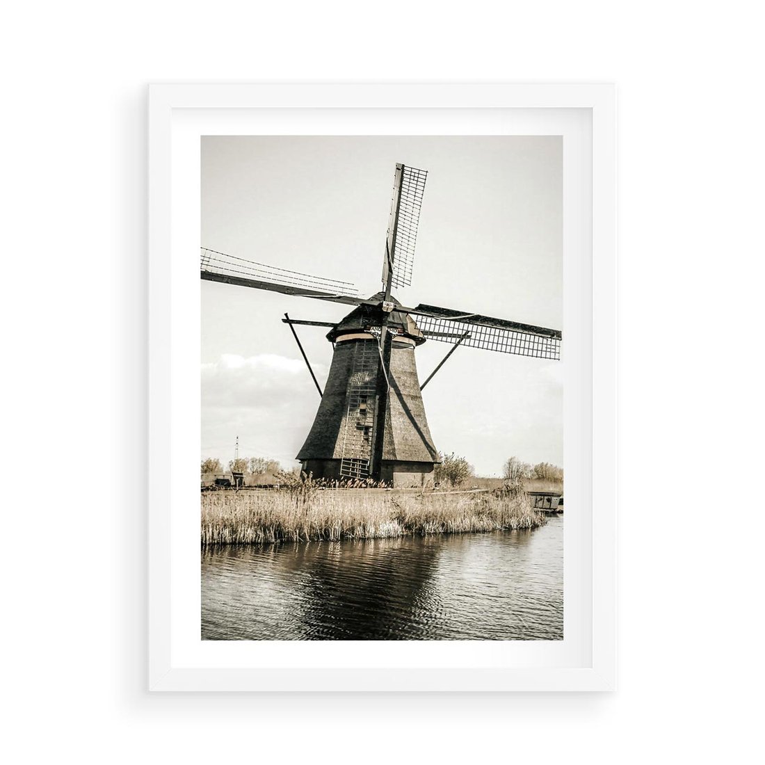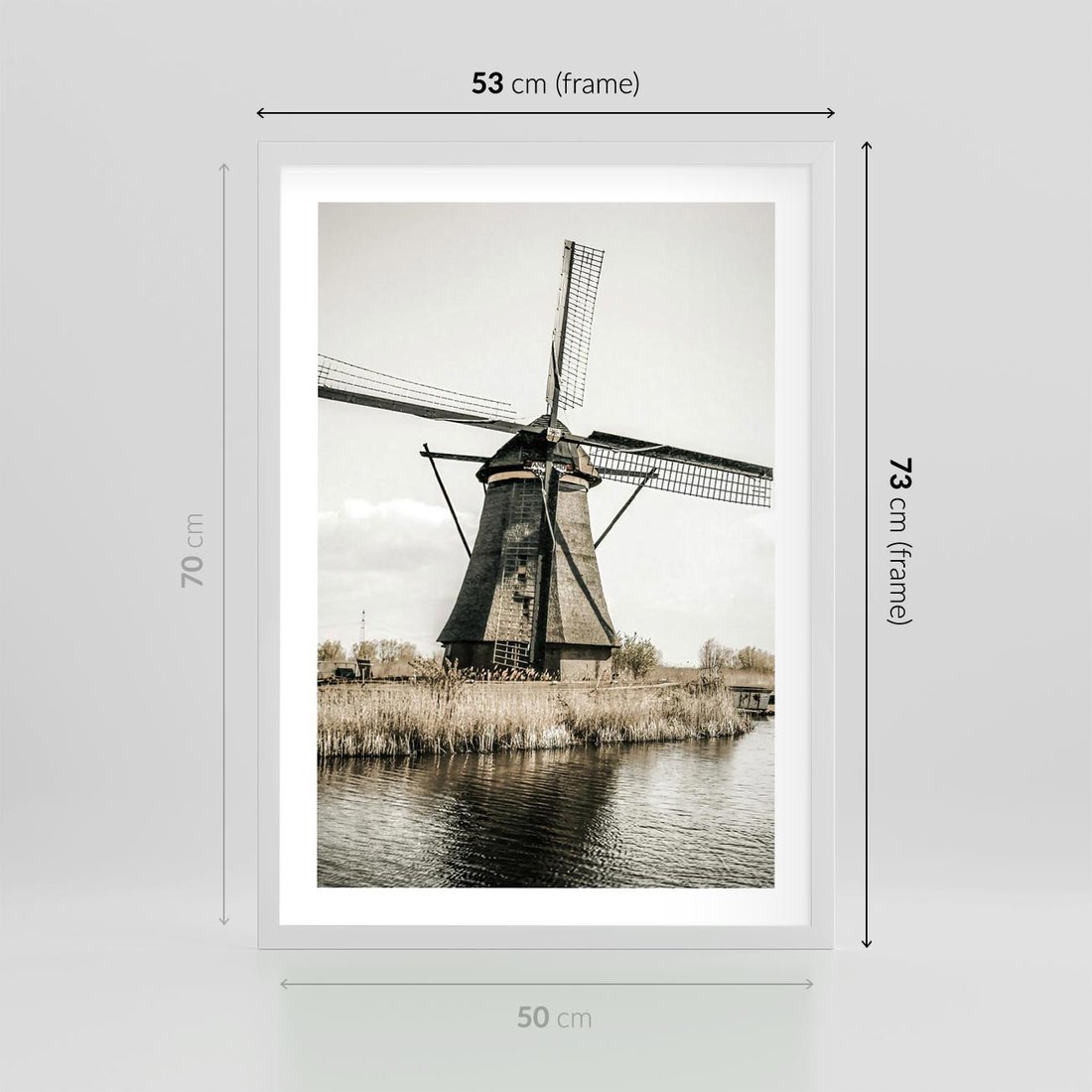 Plakat w ramie 50x70 - Holenderski Wiatrak w Sepii - holenderski wiatrak, młyn - rama biała