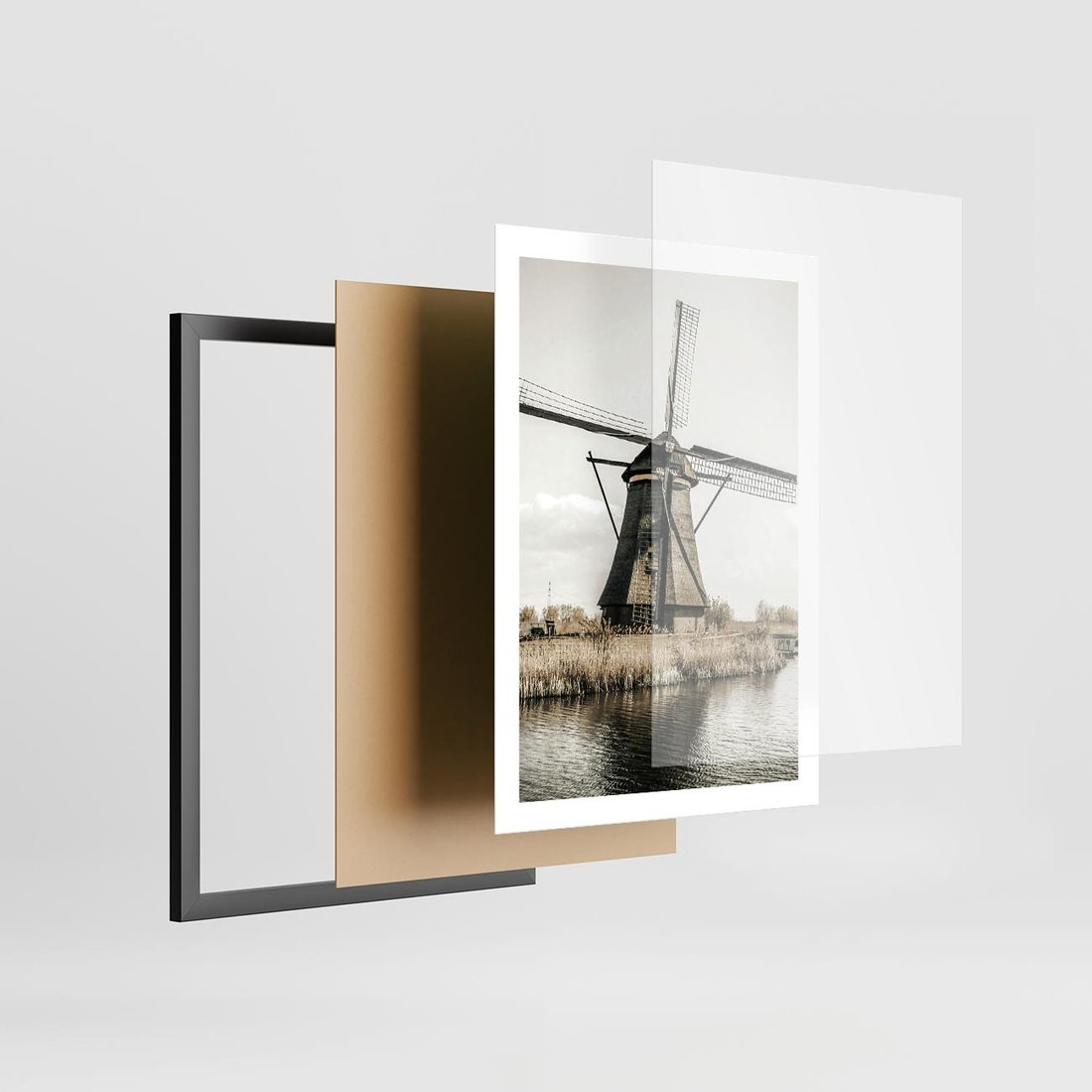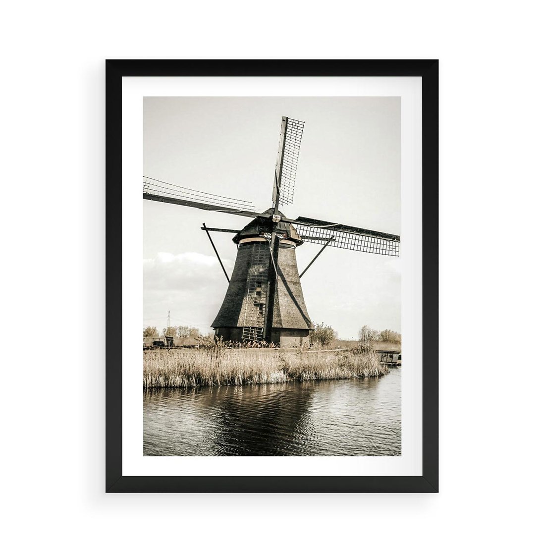 Plakat w ramie 50x70 - Holenderski Wiatrak w Sepii - holenderski wiatrak, młyn - rama czarna