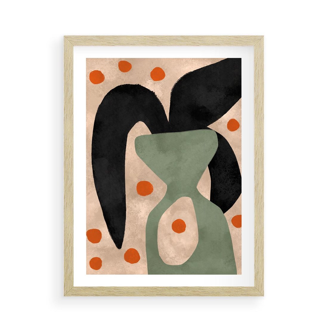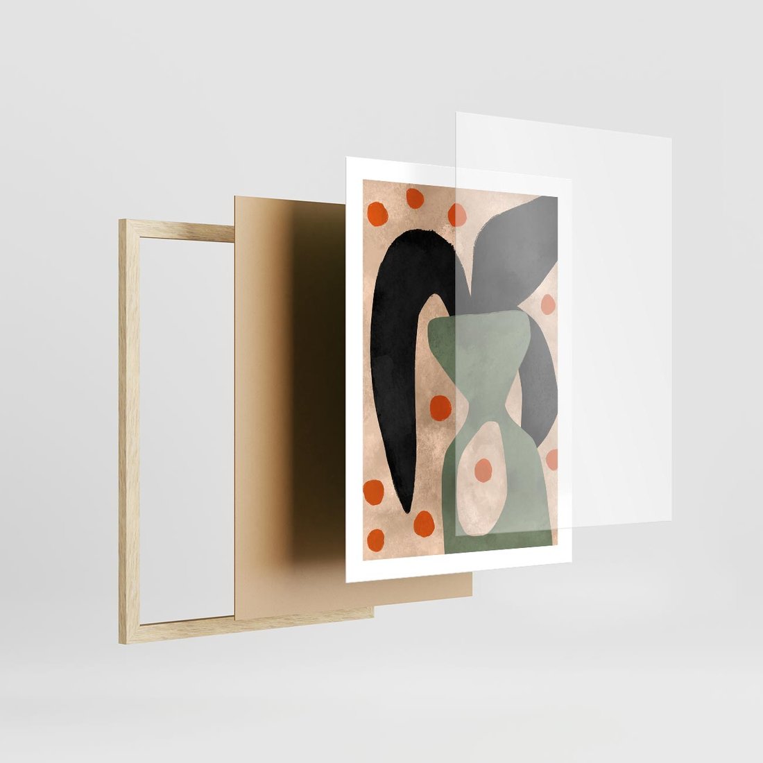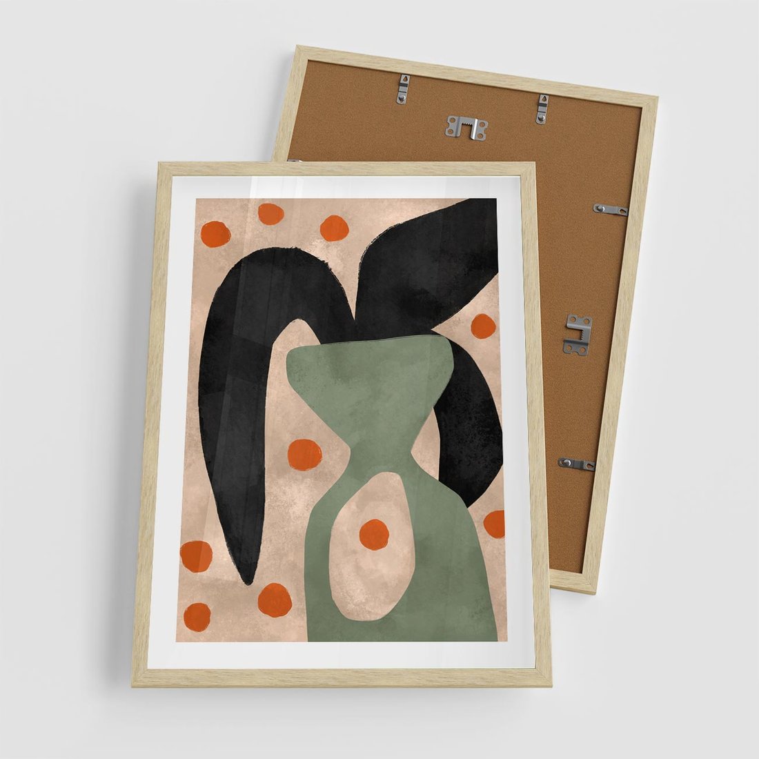 Ten abstrakcyjny obraz-plakat prezentuje dziwne i intrygujące kształty na delikatnym beżowym tle, wprowadzając do wnętrza charakterystyczny boho klimat.