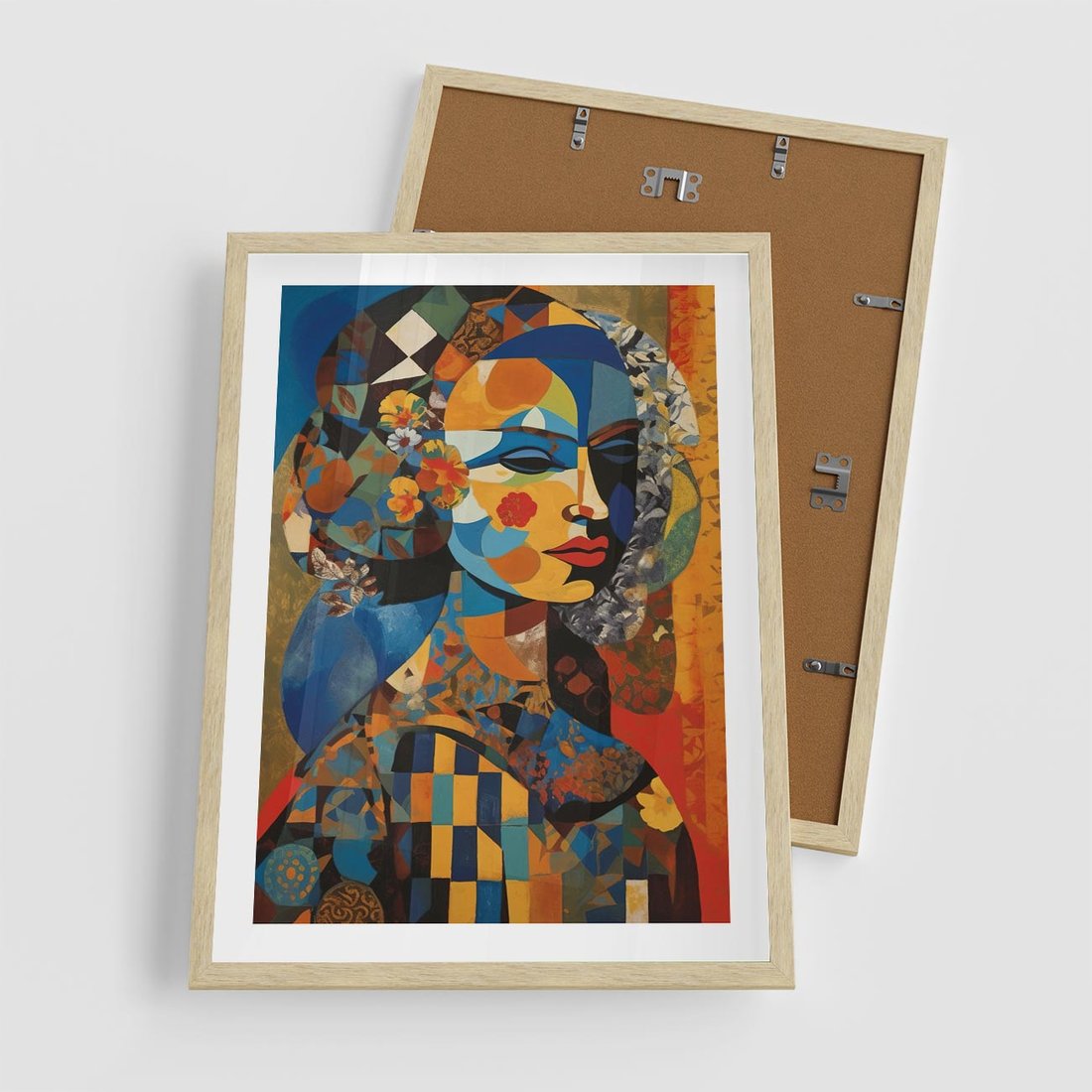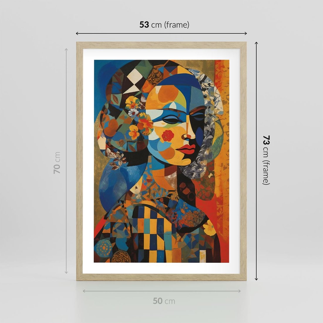 Ten abstrakcyjny obraz przedstawia portret kobiety w stylu przypominającym dzieła Picassa. Wyraziste, kolorowe plamy tworzą unikalną interpretację, oddającą charakter i piękno modelki w niekonwencjonalny sposób.