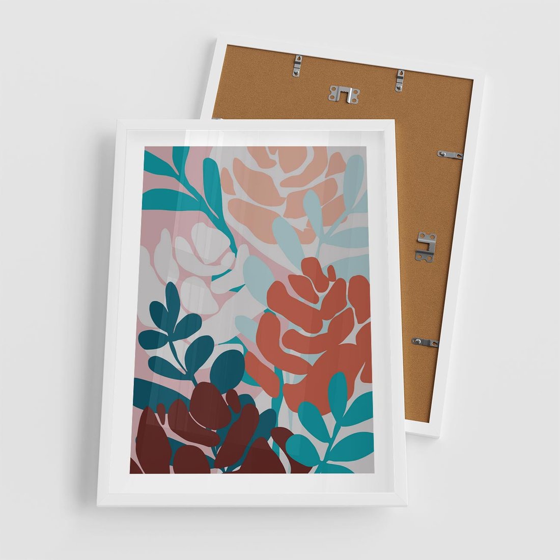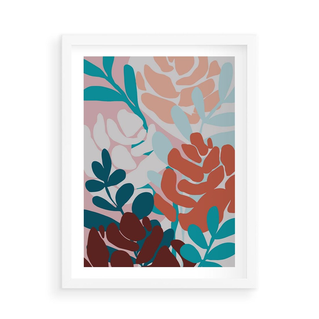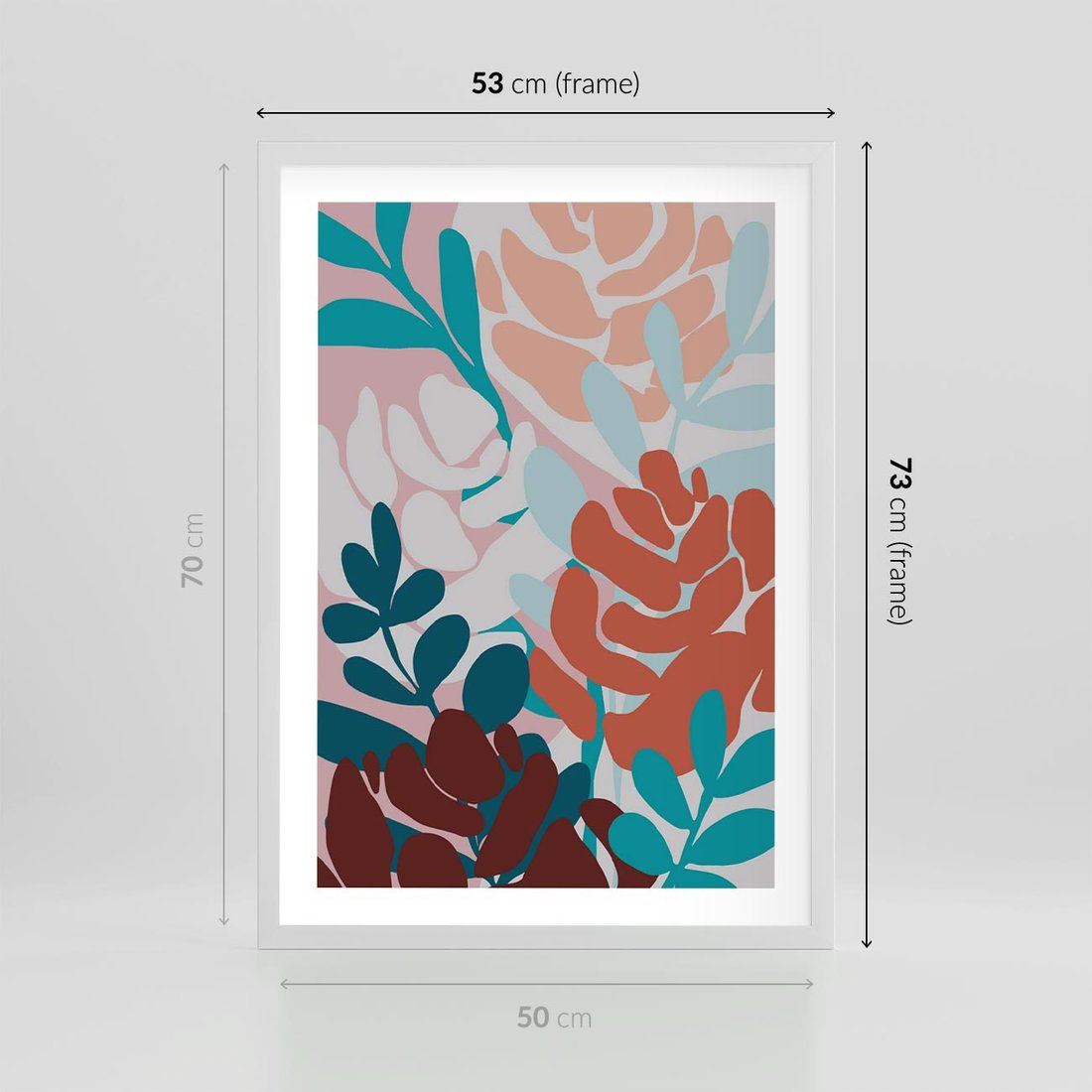 Plakat w ramie 50x70 - Impresje Kształtów - abstrakcyjna kompozycja kwiatowych form, kolor zgaszone - rama biała