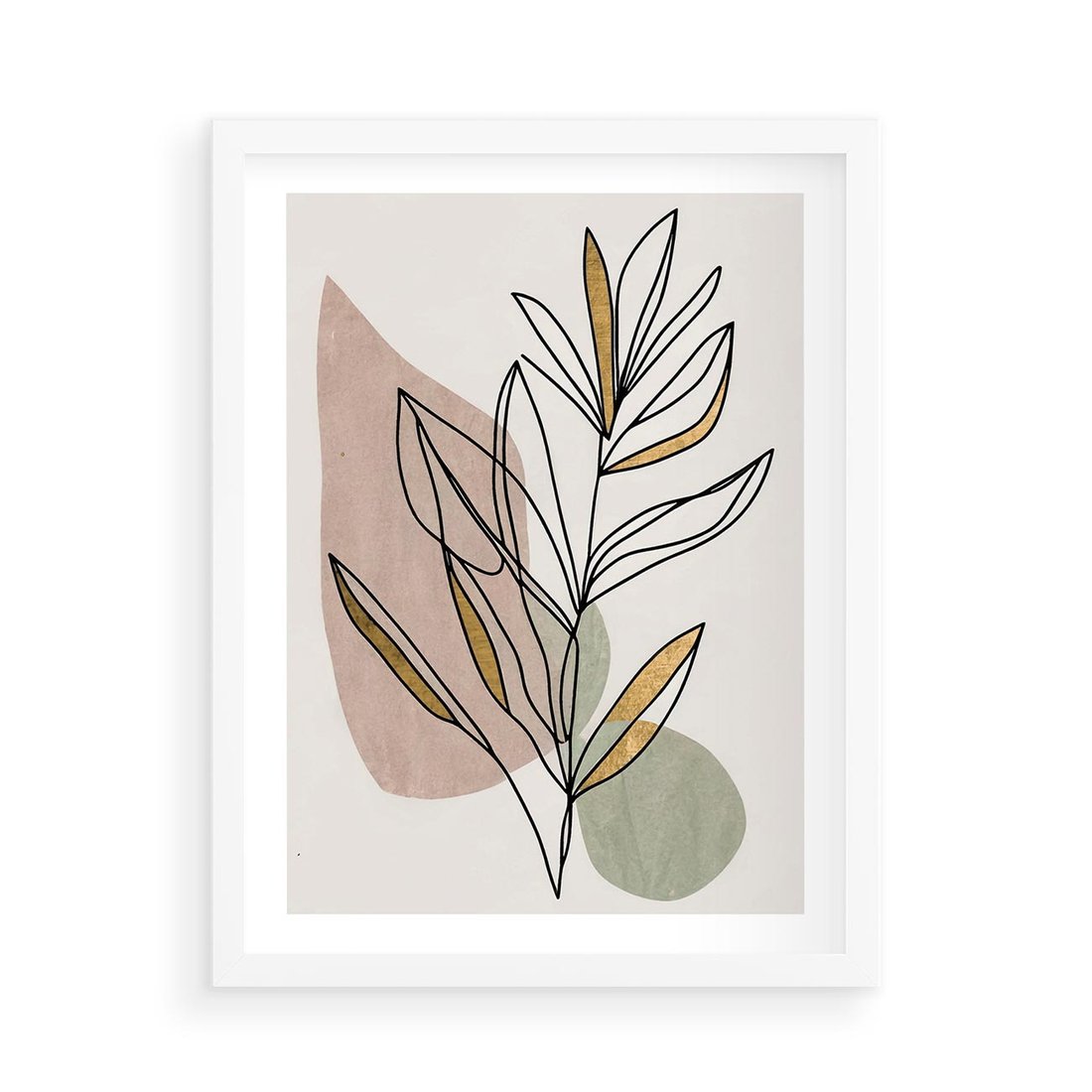 Plakat w ramie 50x70 - Impulsy Subtelnej Harmonii - abstrakcyjny obraz boho, liście - rama biała