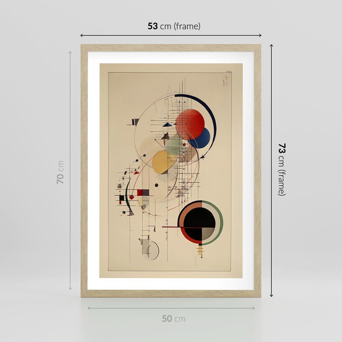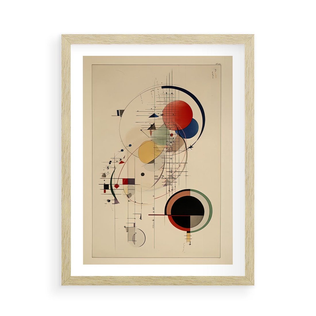 Ta abstrakcyjna geometryczna kompozycja, inspirowana stylem Wassily'ego Kandinsky'ego, używa kół i linii, aby tworzyć dynamiczną harmonię kształtów i kolorów. To wizualne doświadczenie przenosi widza w emocjonalną podróż przez abstrakcyjne światy.
