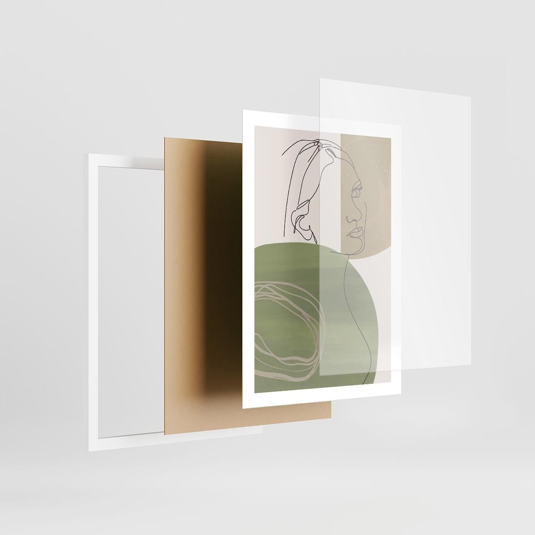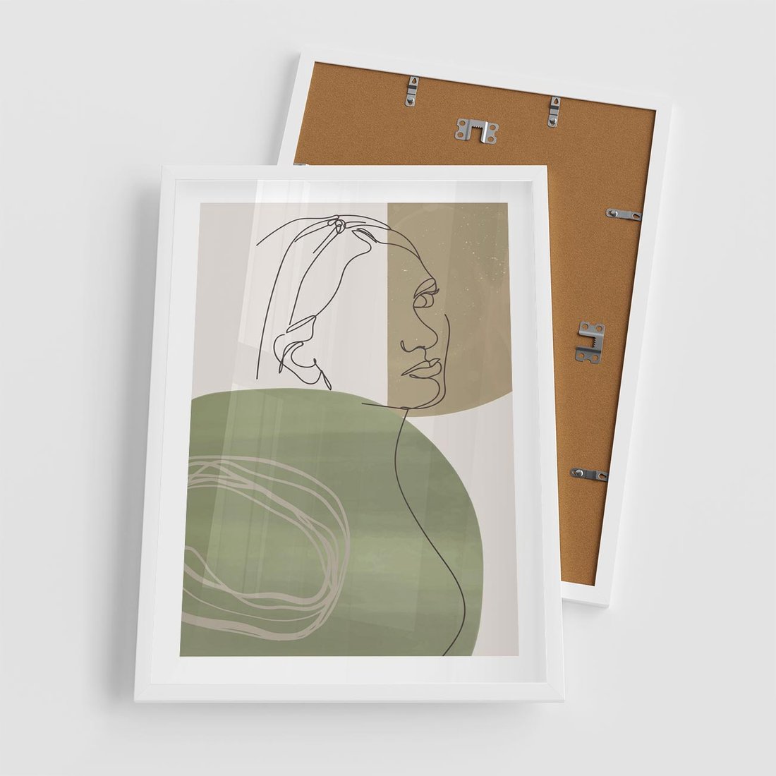 Plakat w ramie 50x70 - Jedna Linia, Wiele Emocji - akwarelowe plamy, na nich szkic postaci kobiety jedną linią - rama biała