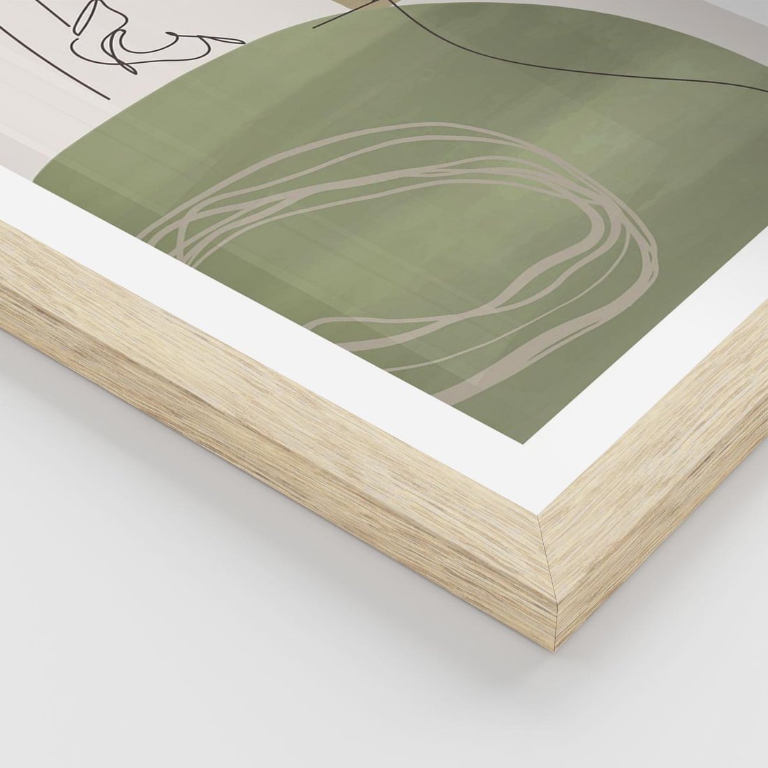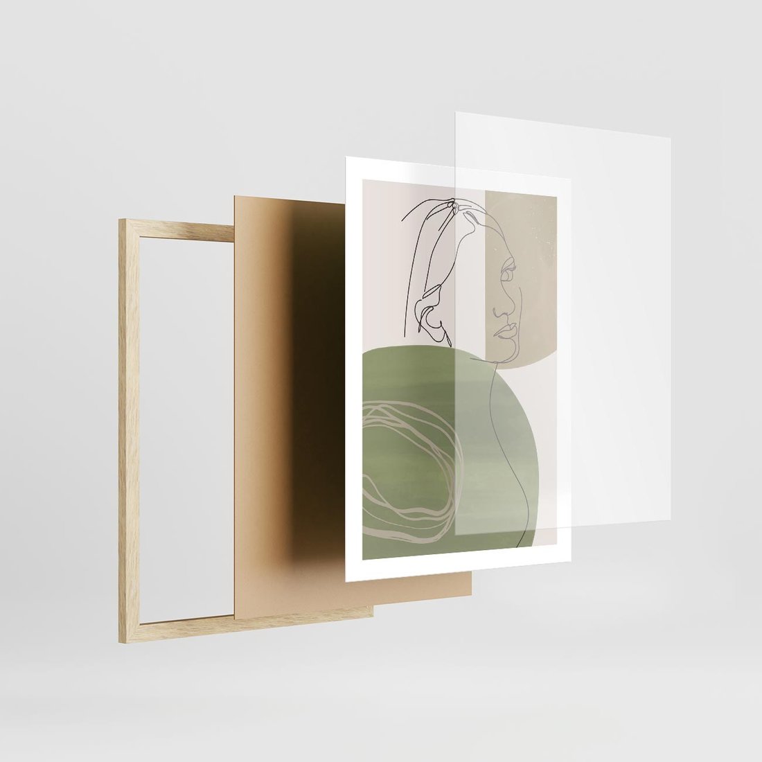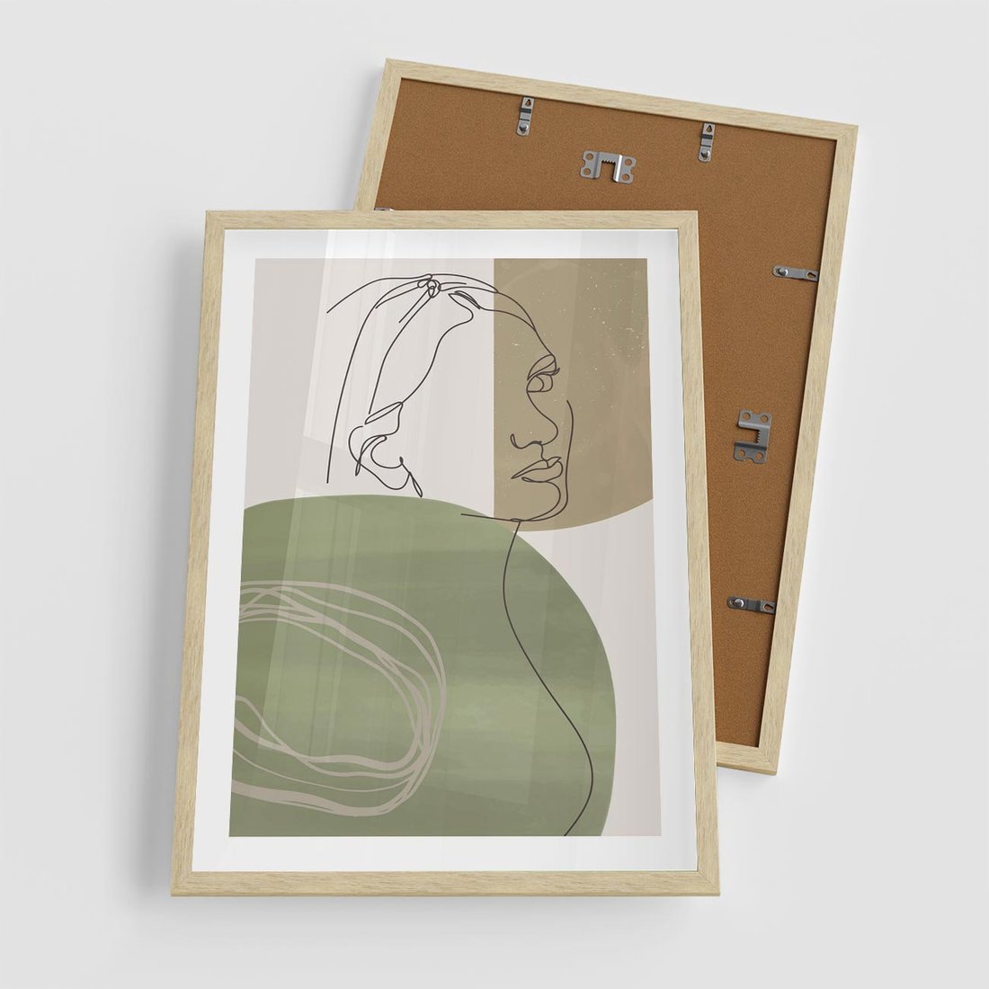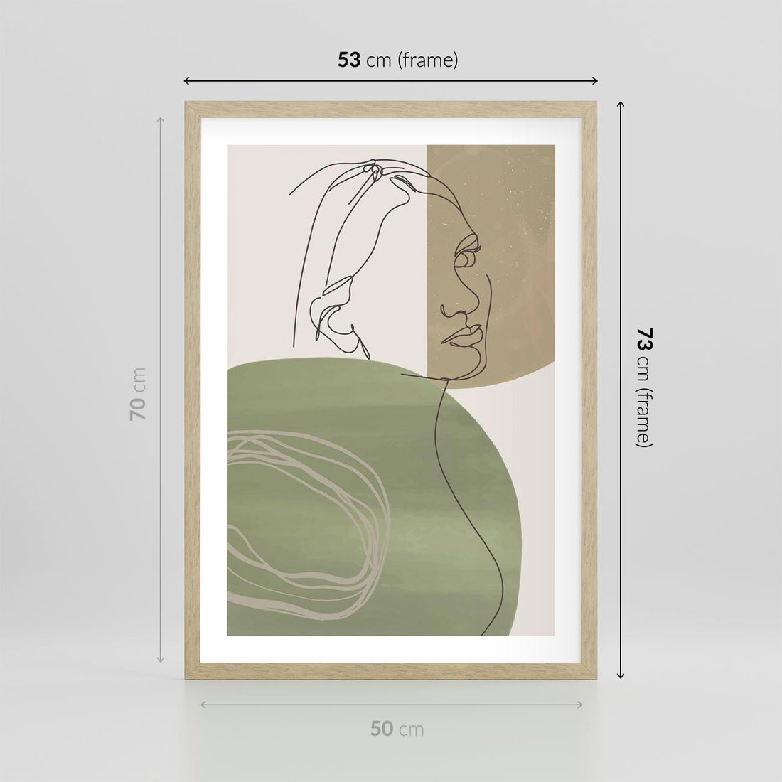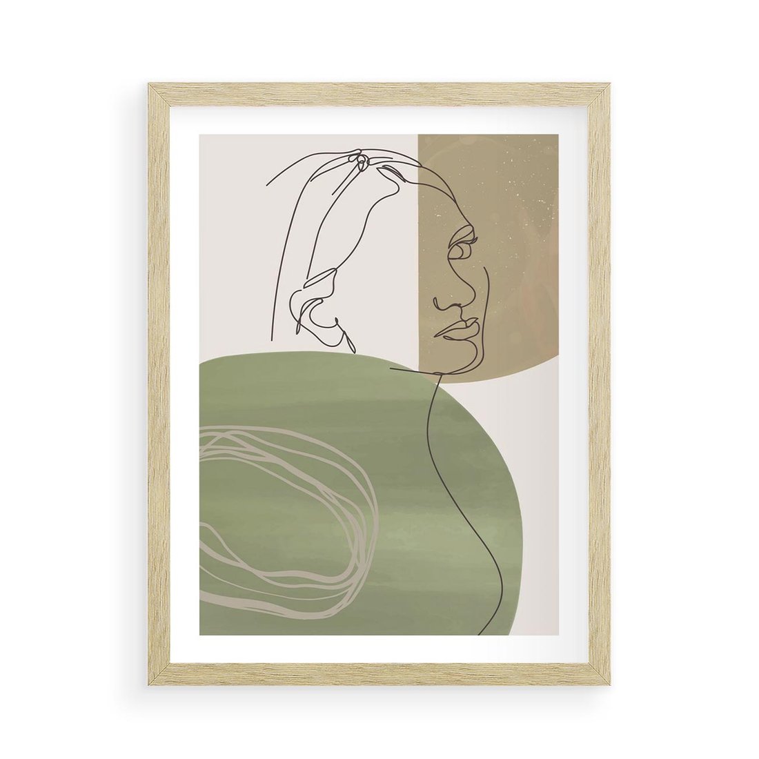 Plakat w ramie 50x70 - Jedna Linia, Wiele Emocji - akwarelowe plamy, na nich szkic postaci kobiety jedną linią - rama drewno