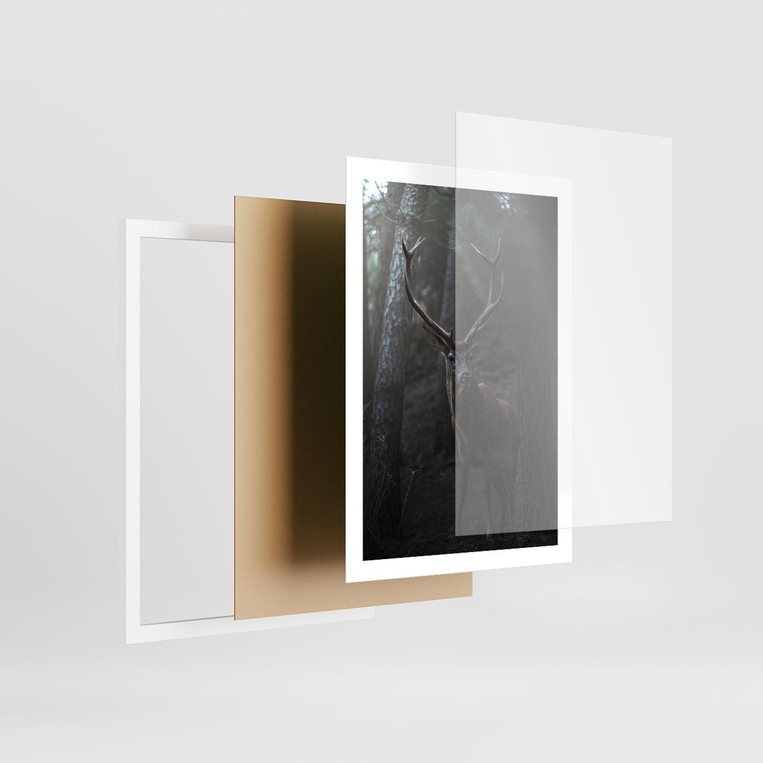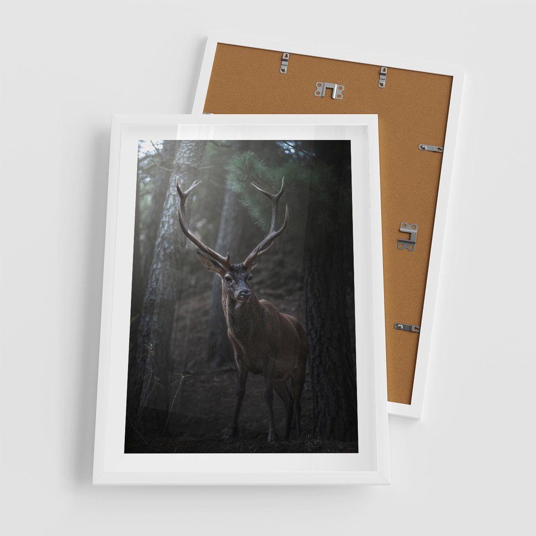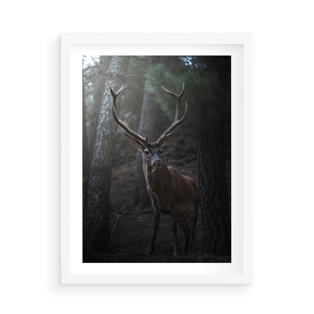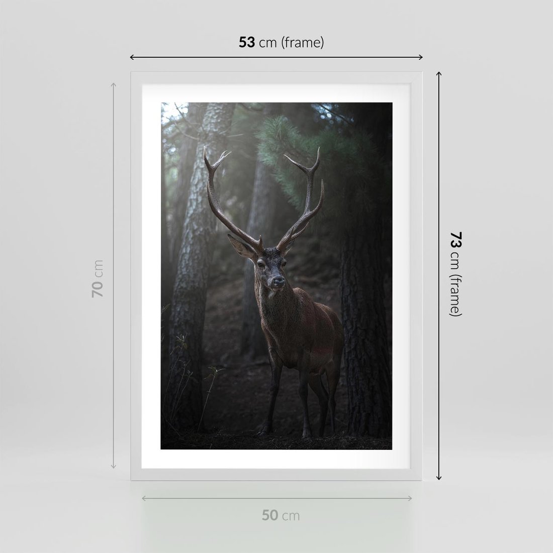 Plakat w ramie 50x70 - Jeleń wśród lasu - jeleń, las - rama biała