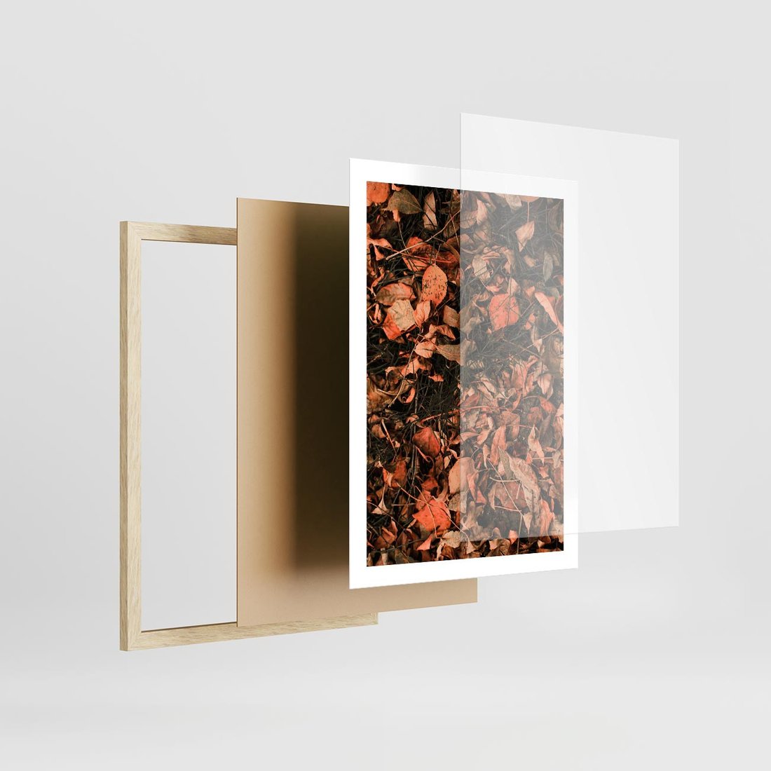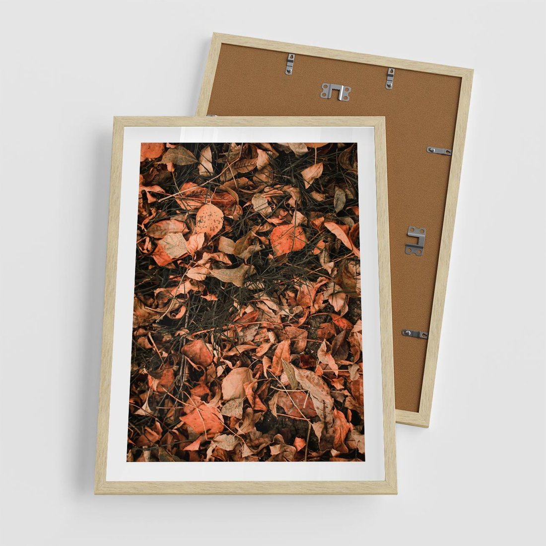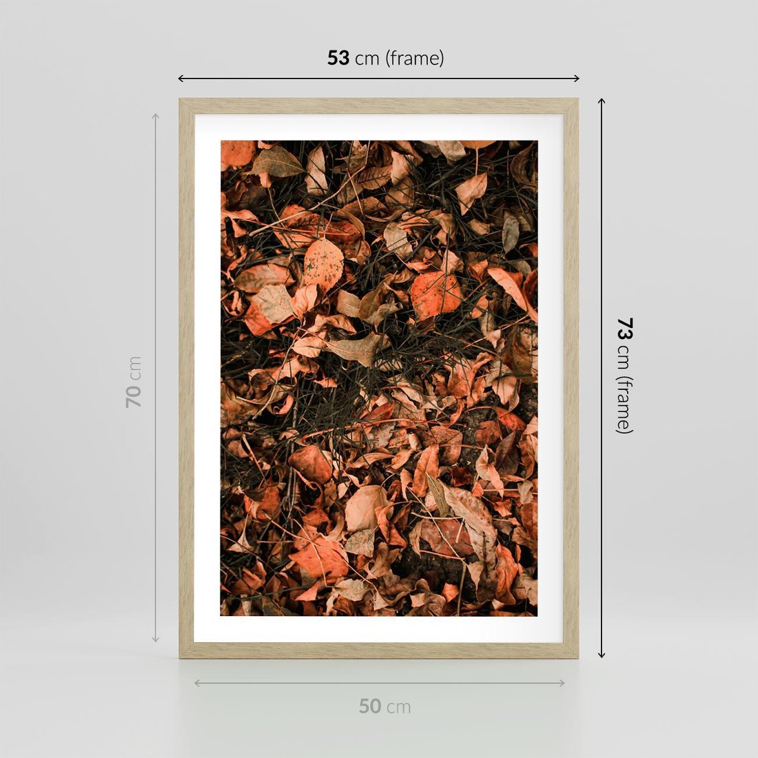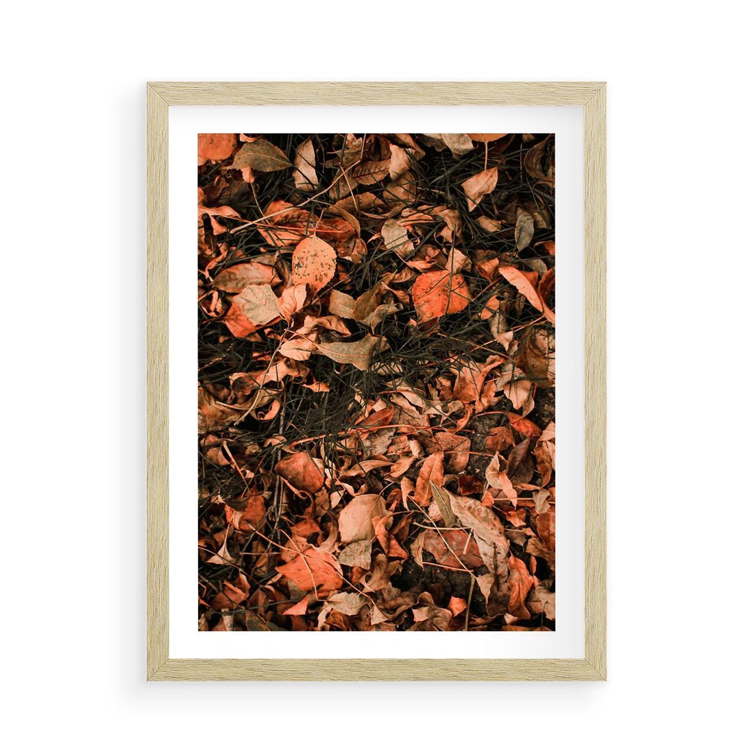 Plakat w ramie 50x70 - Jesienny Splot: Pomarańczowe Liście - liście, pomarańczowe suche liście - rama drewno