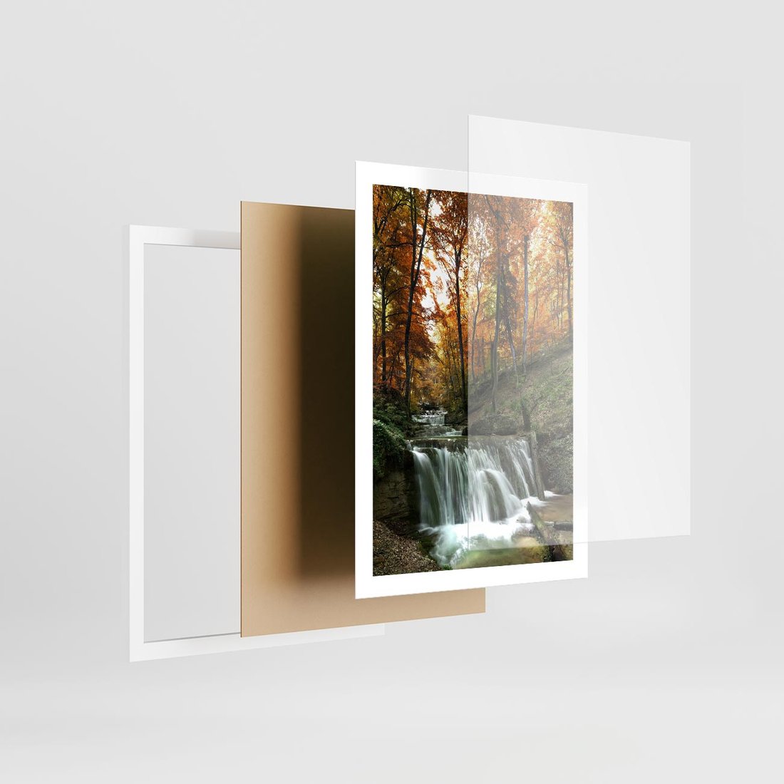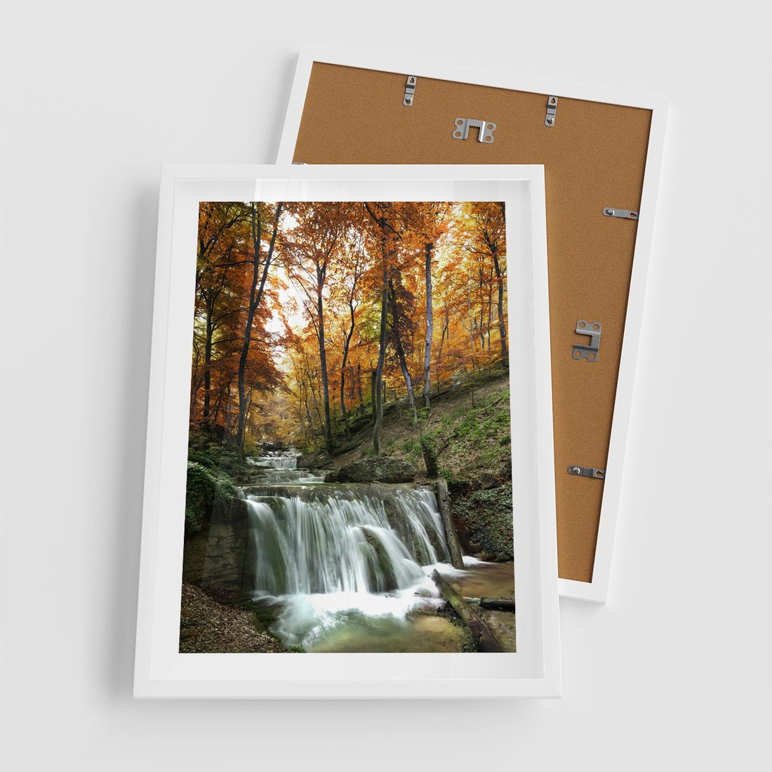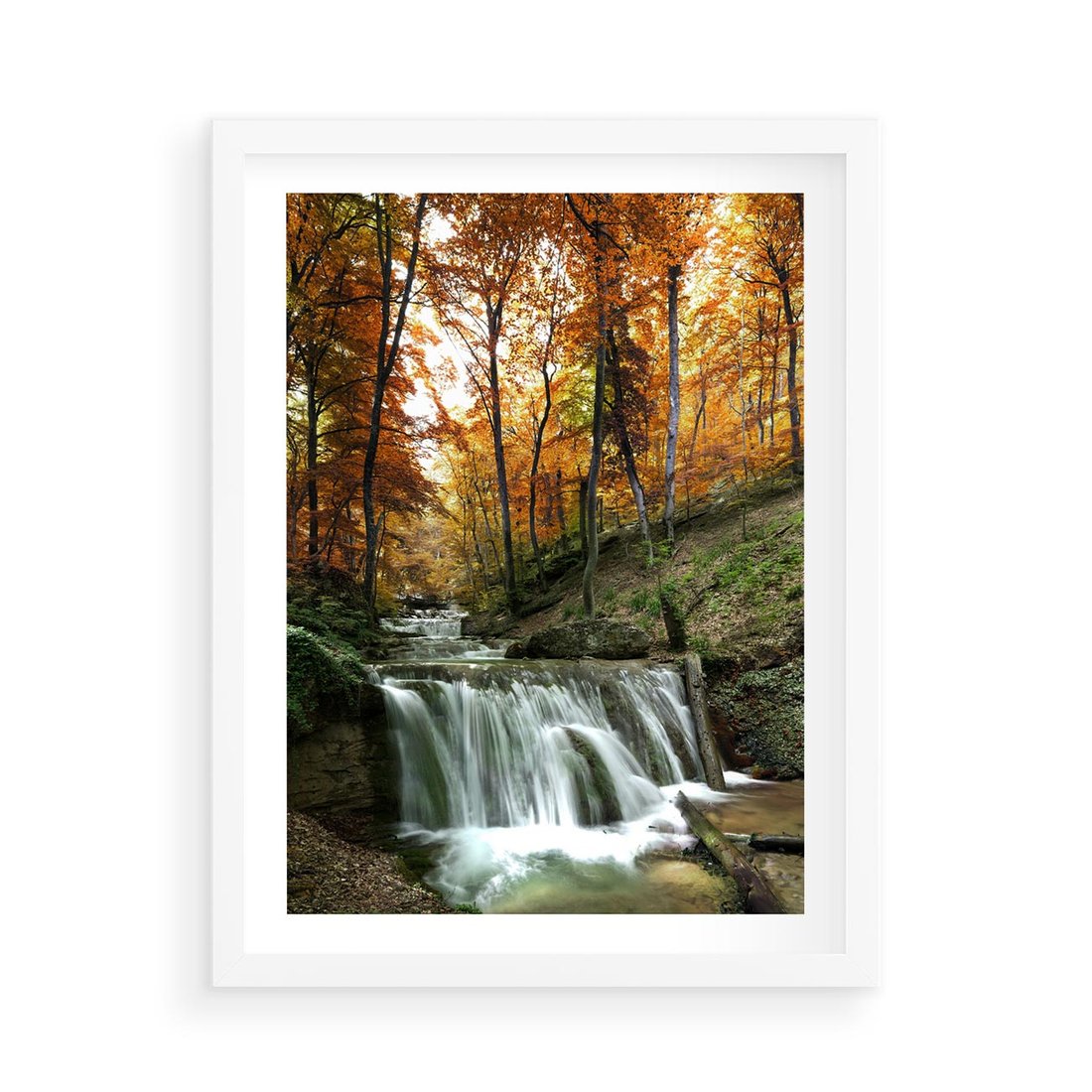 Plakat w ramie 50x70 - Jesienny wodospad w lesie - wodospad, las - rama biała