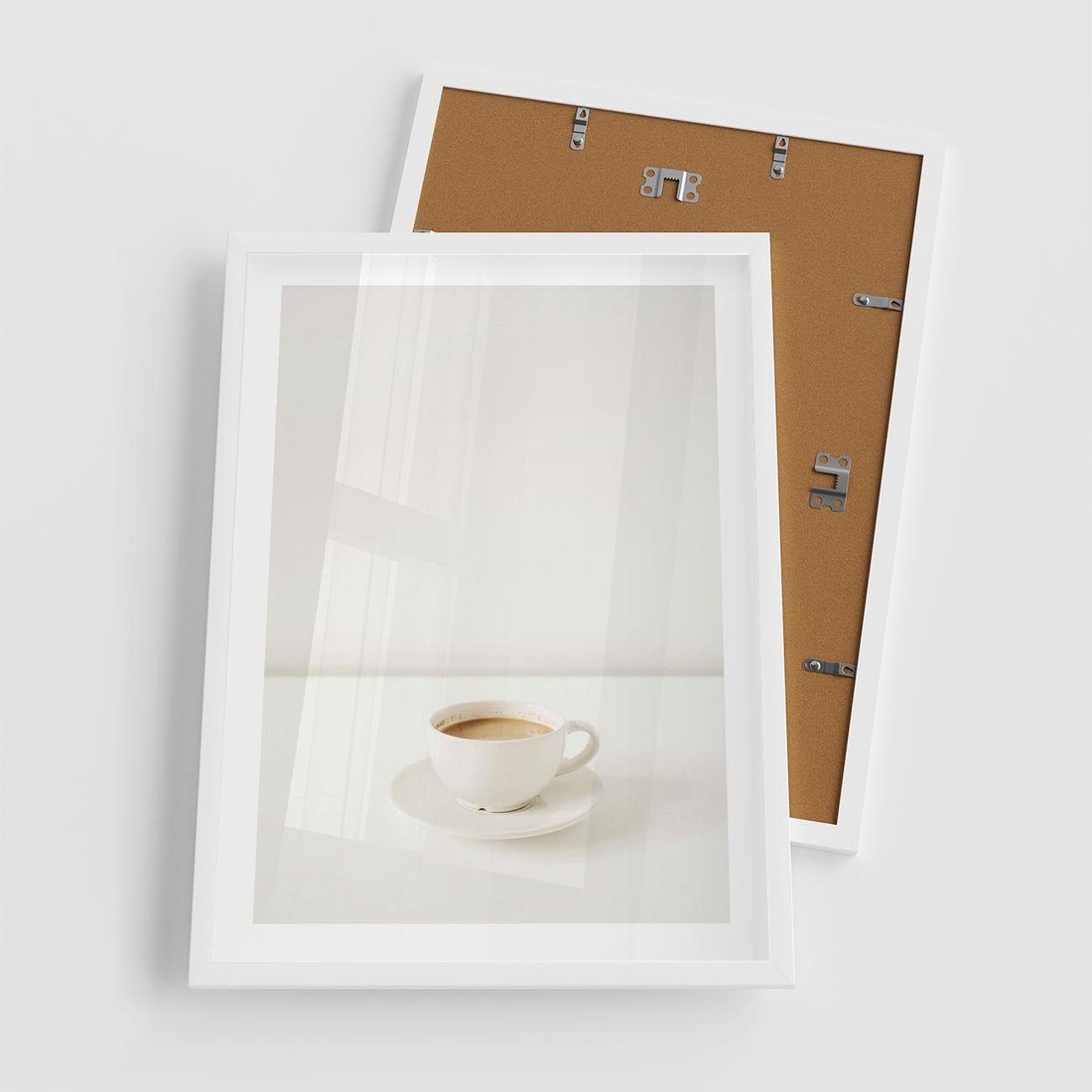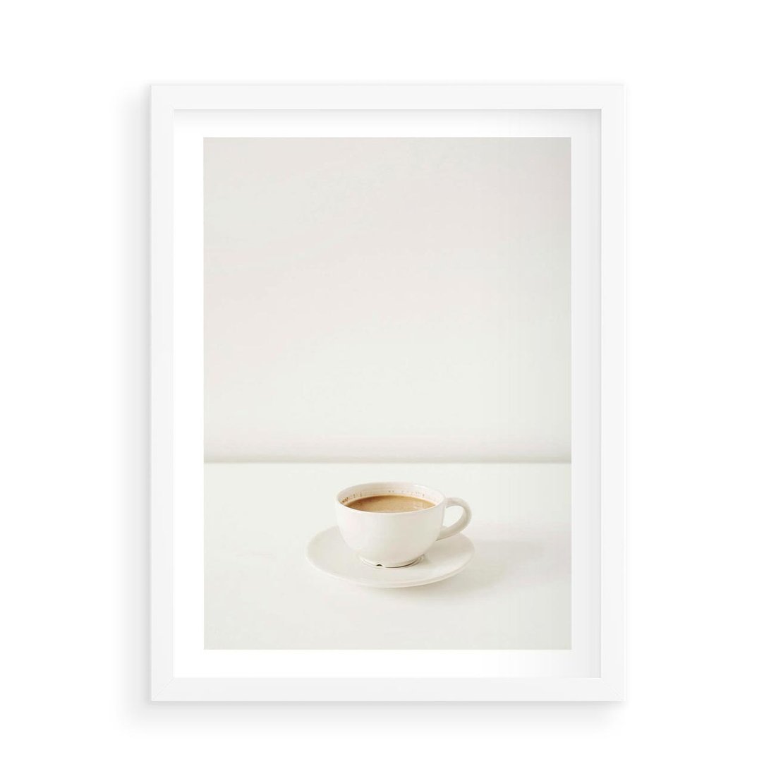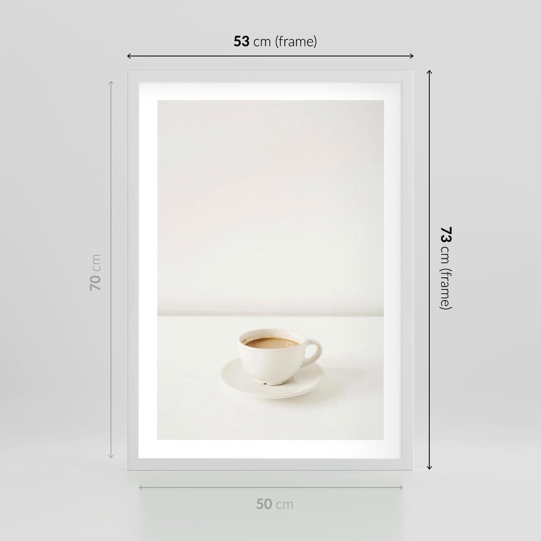 Plakat w ramie 50x70 - Kawa w Prostocie - kawa w filizance, białe tłó - rama biała