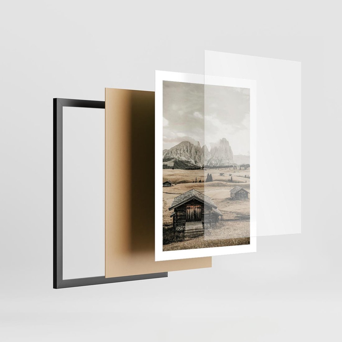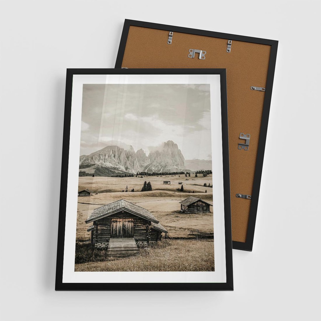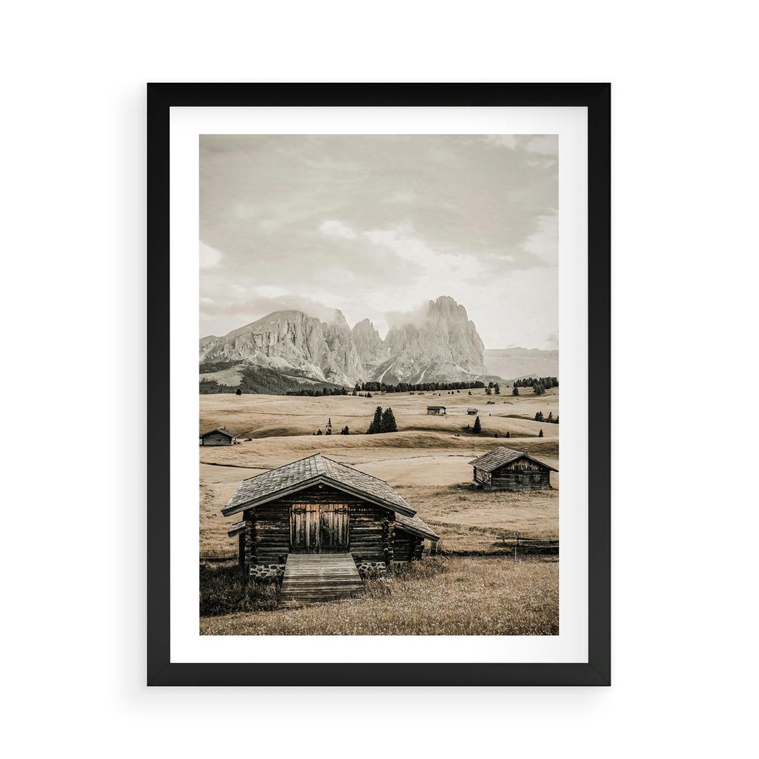 Obraz przedstawia urokliwe domki w górach utrzymane w odcieniach sepii, co nadaje im nostalgiczny i klasyczny charakter.