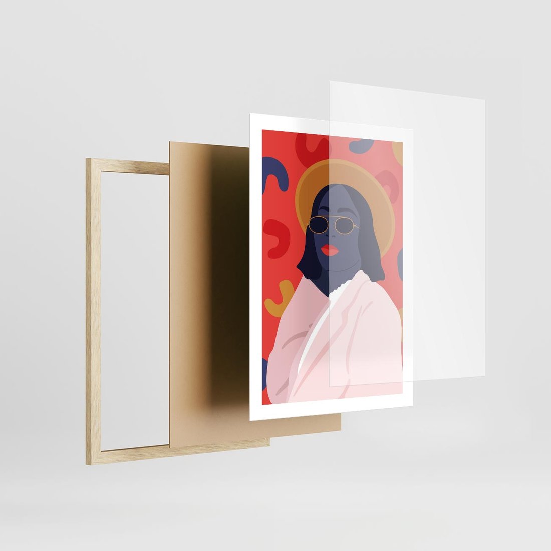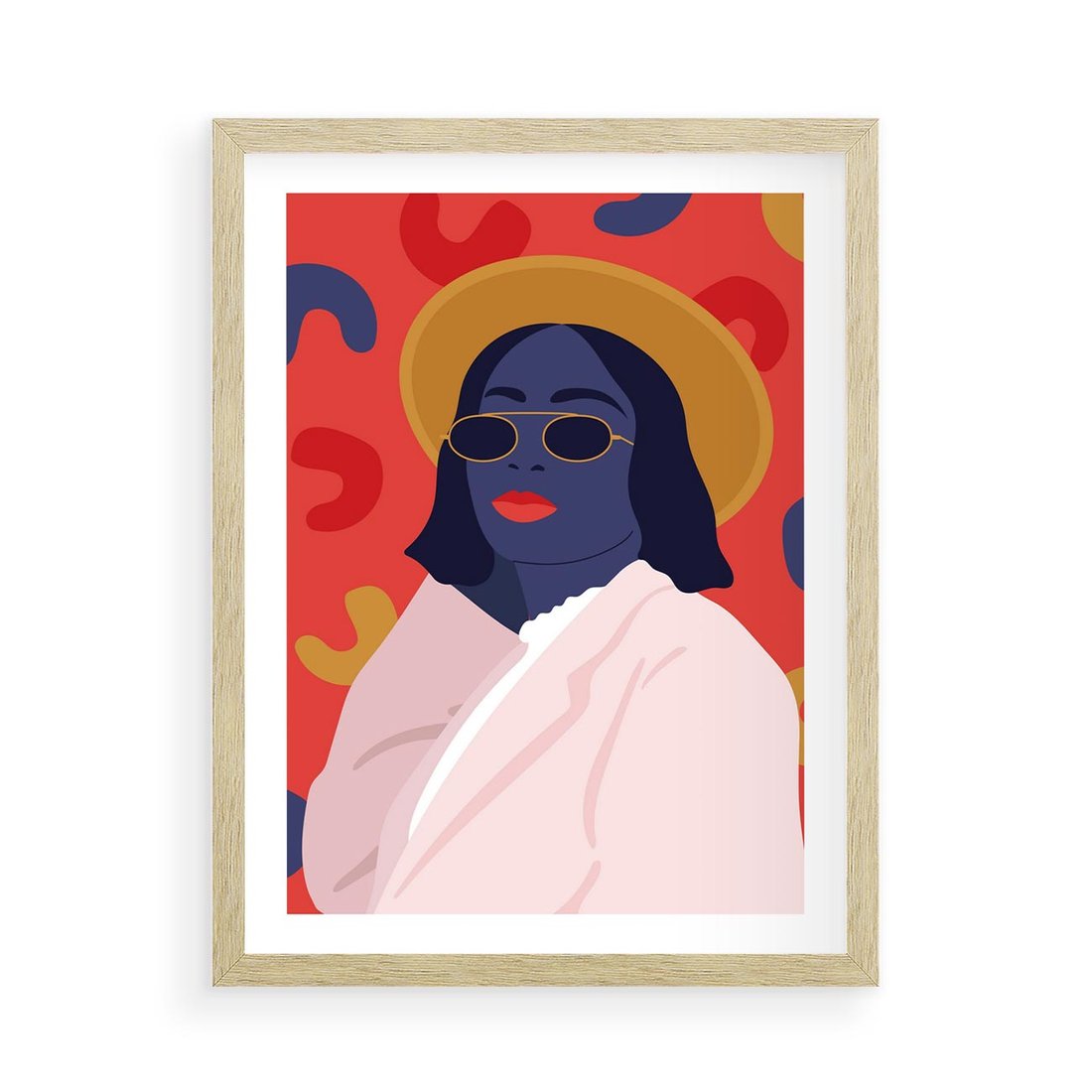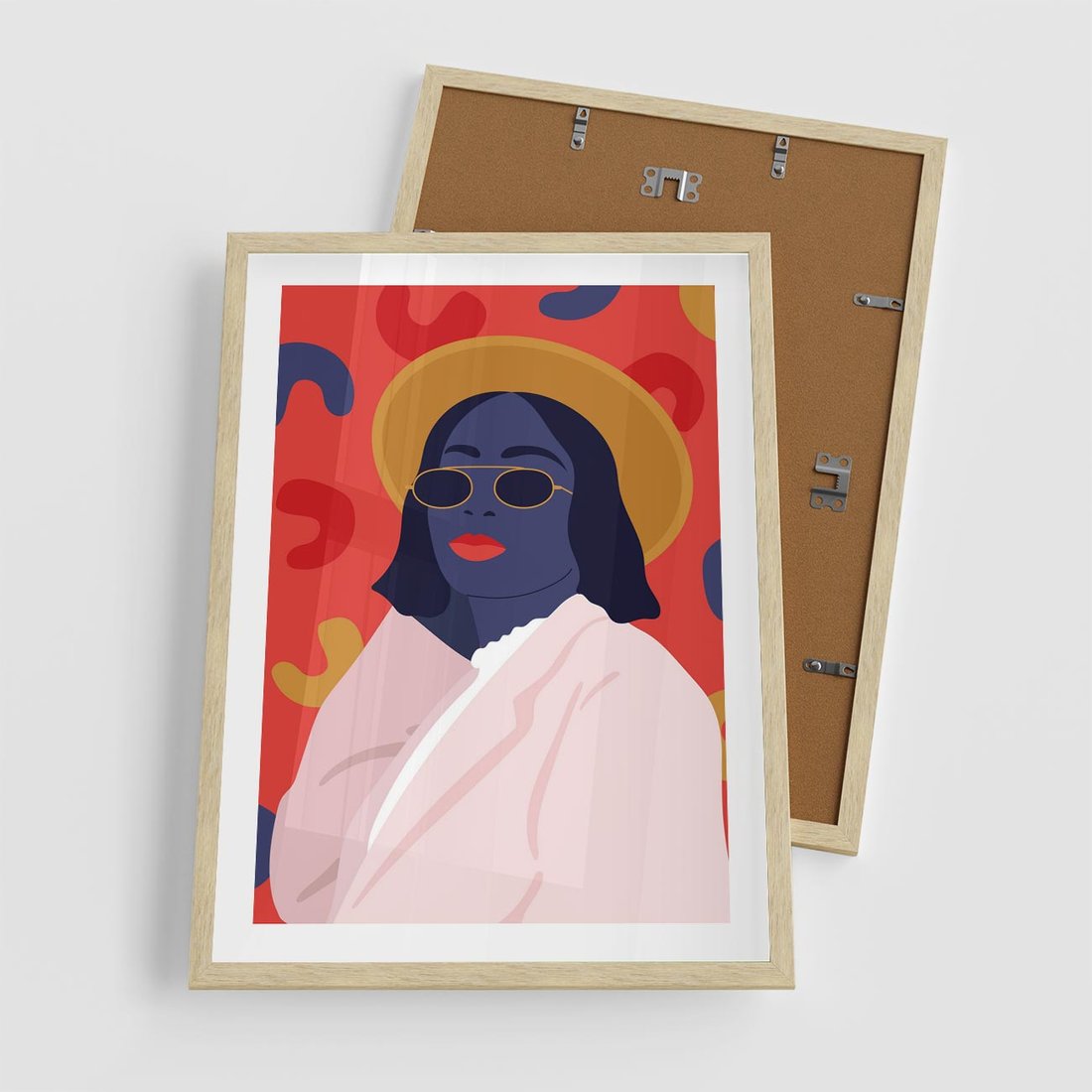 Nowoczesny plakat w stylu retro przedstawia kobietę w okularach słonecznych. Żywe kolory podkreślają jej styl i wyjątkowość, tworząc dynamiczną kompozycję pełną energii i osobowości.