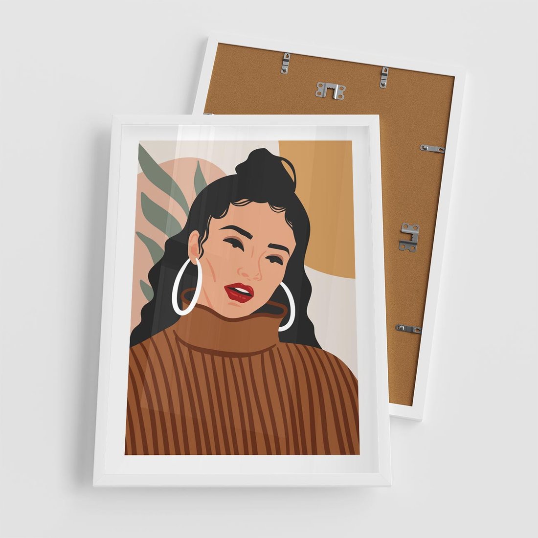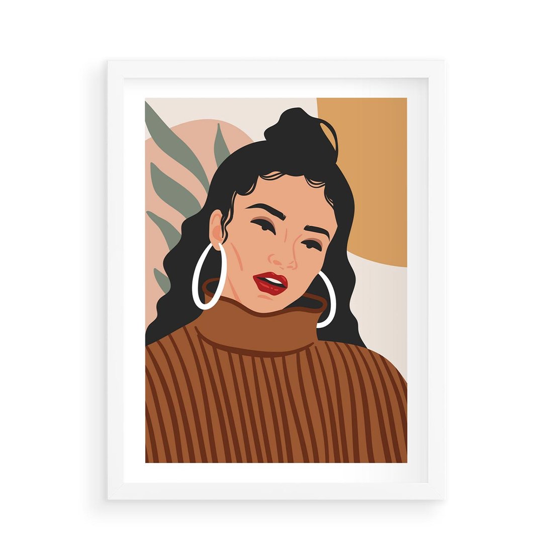 Nowoczesny plakat w stylu retro ukazuje elegancki portret kobiety w stonowanych kolorach. To połączenie klasyki z nowoczesnością, tworząc wyjątkową atmosferę artystycznego powiewu przeszłości i teraźniejszości.