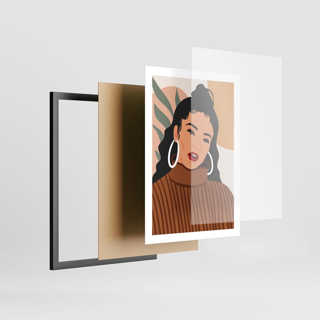 Nowoczesny plakat w stylu retro ukazuje elegancki portret kobiety w stonowanych kolorach. To połączenie klasyki z nowoczesnością, tworząc wyjątkową atmosferę artystycznego powiewu przeszłości i teraźniejszości.