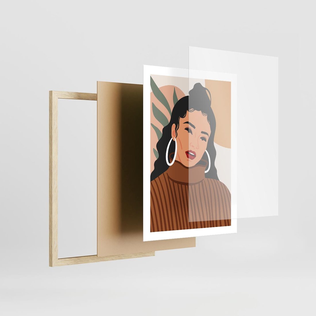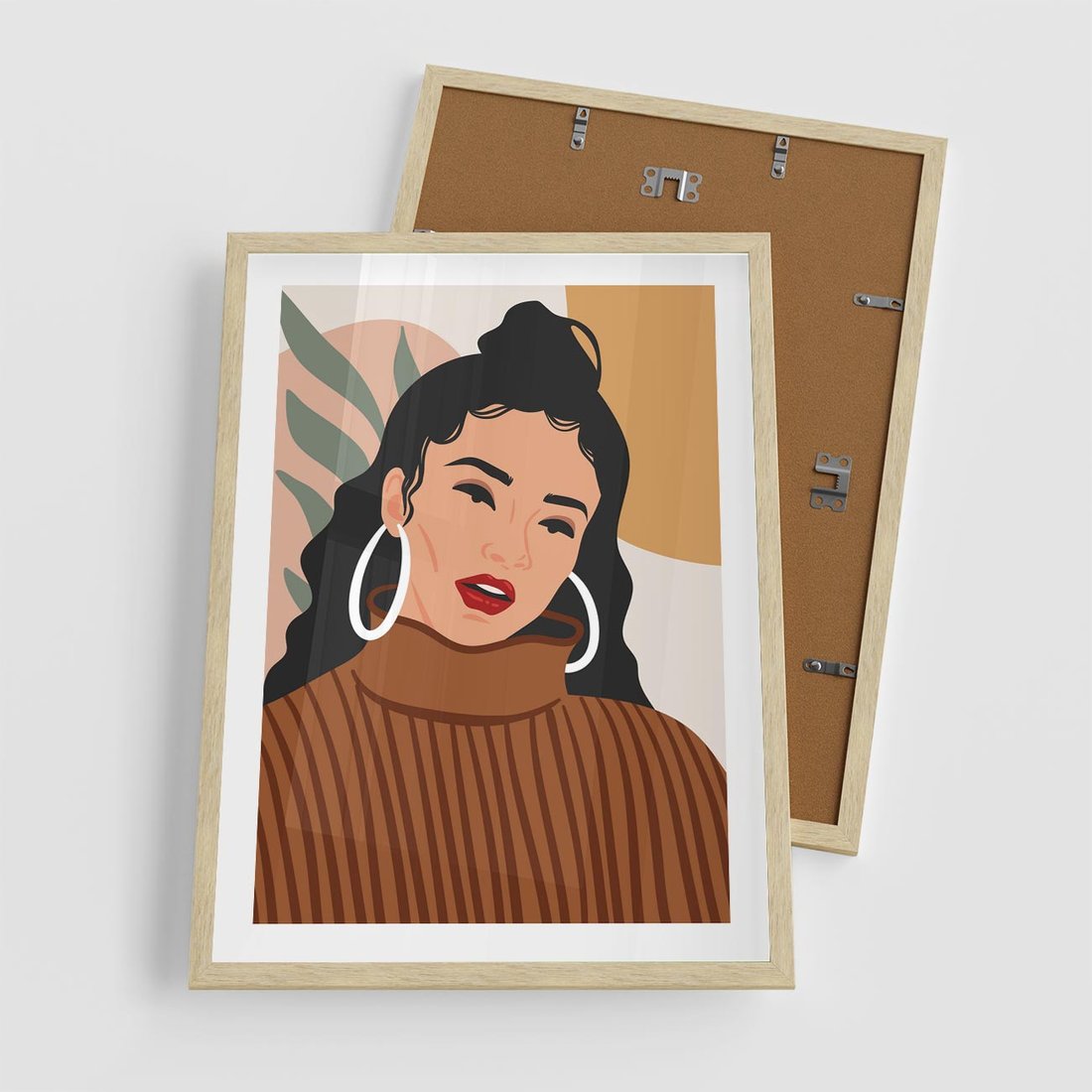 Nowoczesny plakat w stylu retro ukazuje elegancki portret kobiety w stonowanych kolorach. To połączenie klasyki z nowoczesnością, tworząc wyjątkową atmosferę artystycznego powiewu przeszłości i teraźniejszości.