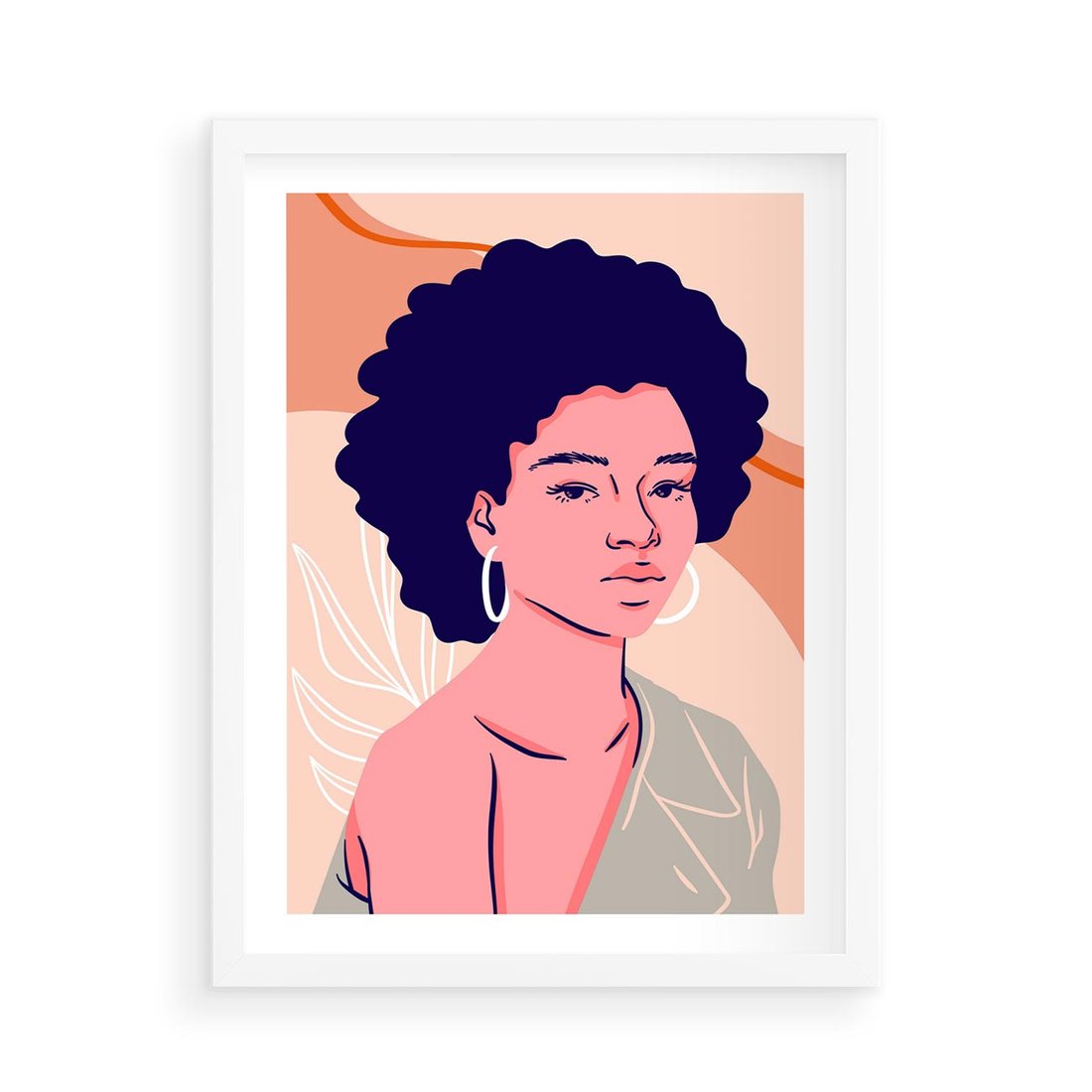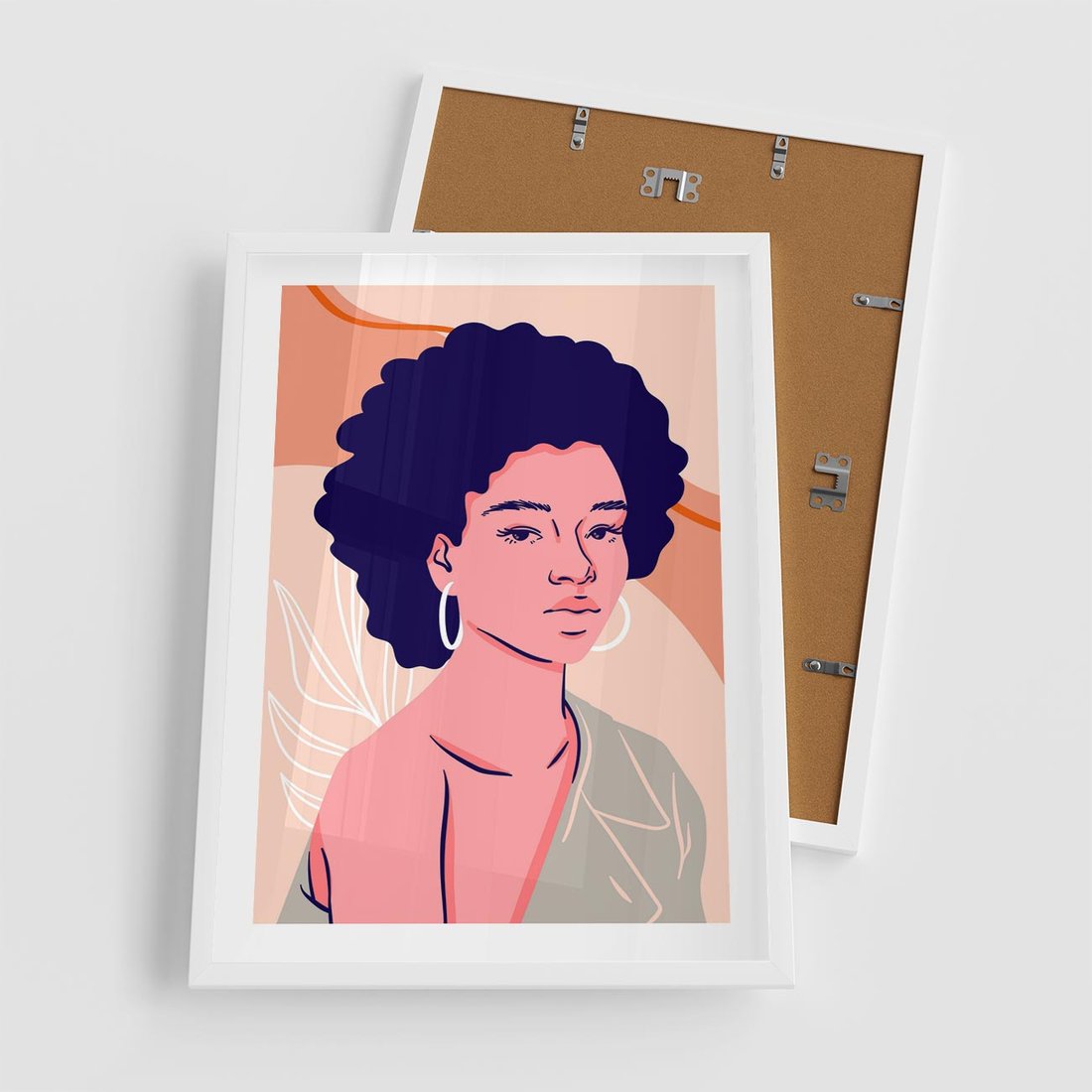 W stylowym plakacie o nowoczesnym wydźwięku retro widnieje portret kobiety w stonowanych kolorach. To połączenie klasycznego charakteru z nowoczesnością, tworzące wyrafinowaną i harmonijną kompozycję.