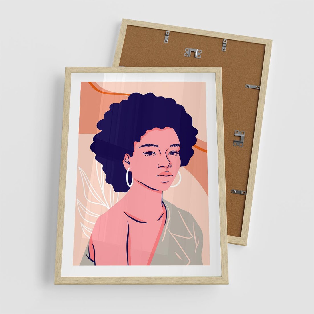 W stylowym plakacie o nowoczesnym wydźwięku retro widnieje portret kobiety w stonowanych kolorach. To połączenie klasycznego charakteru z nowoczesnością, tworzące wyrafinowaną i harmonijną kompozycję.