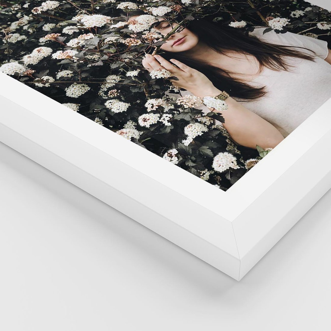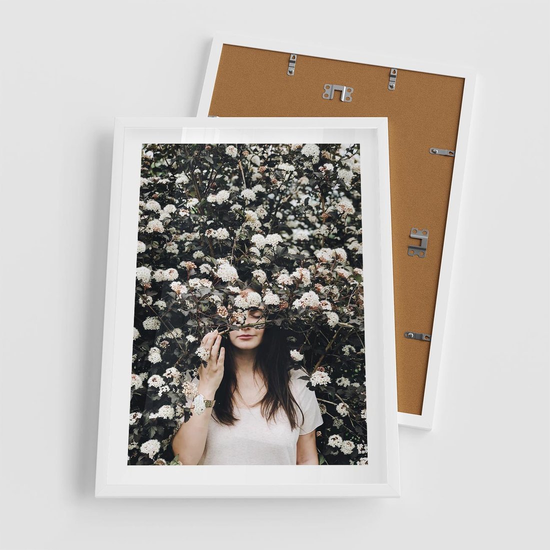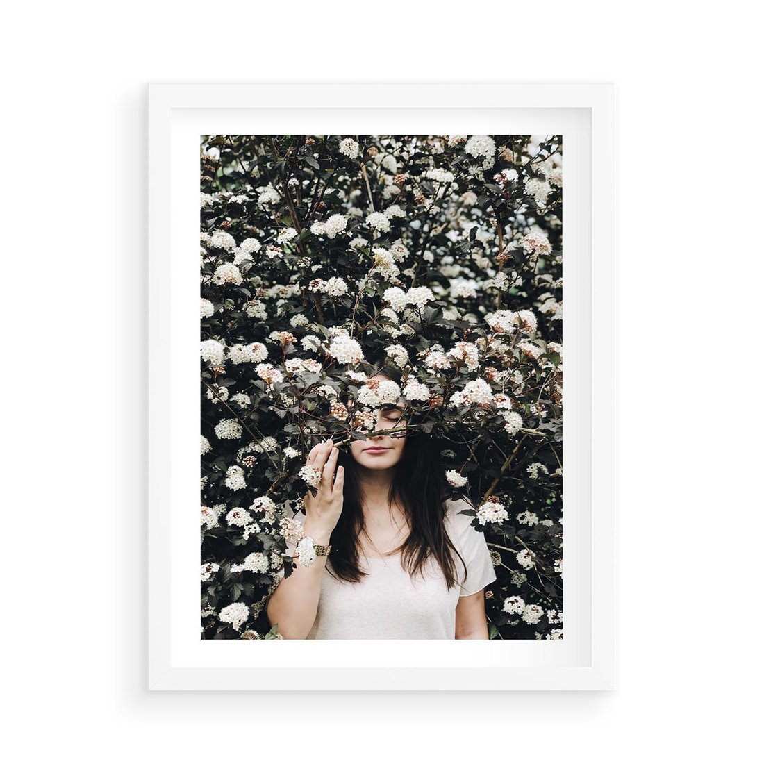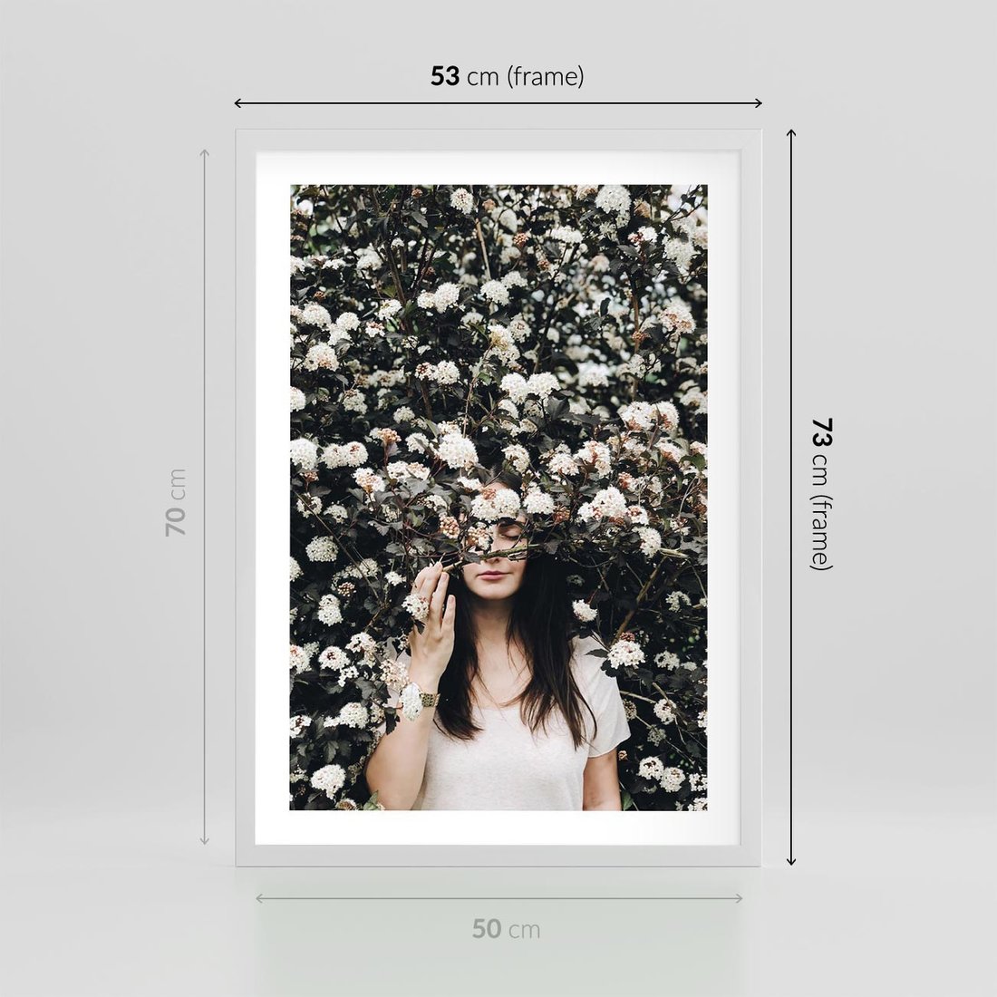 Plakat w ramie 50x70 - Kobieta w Krzewie Kwiatów - krzak z kwiatami, schowana za nim kobieta - rama biała