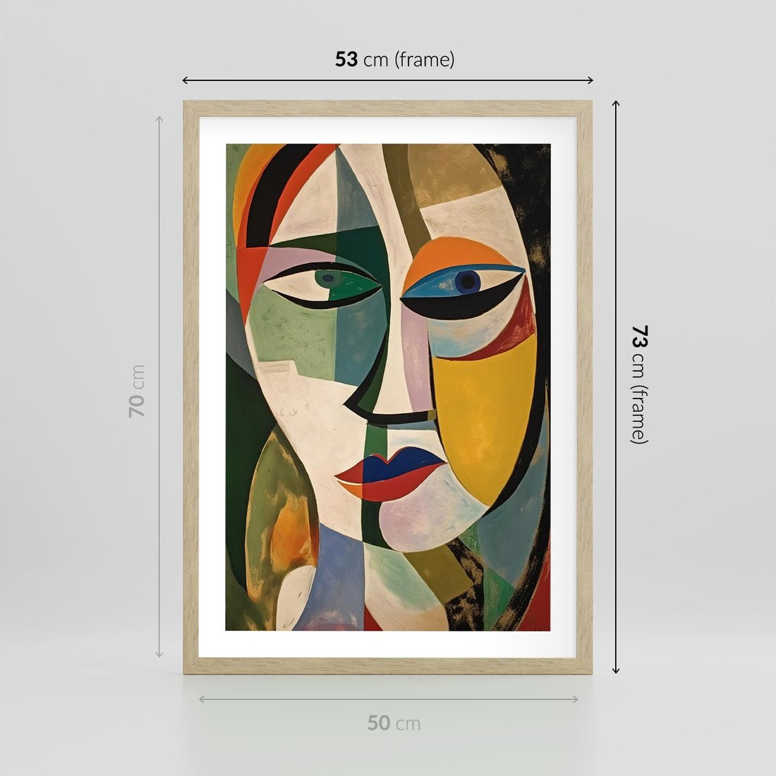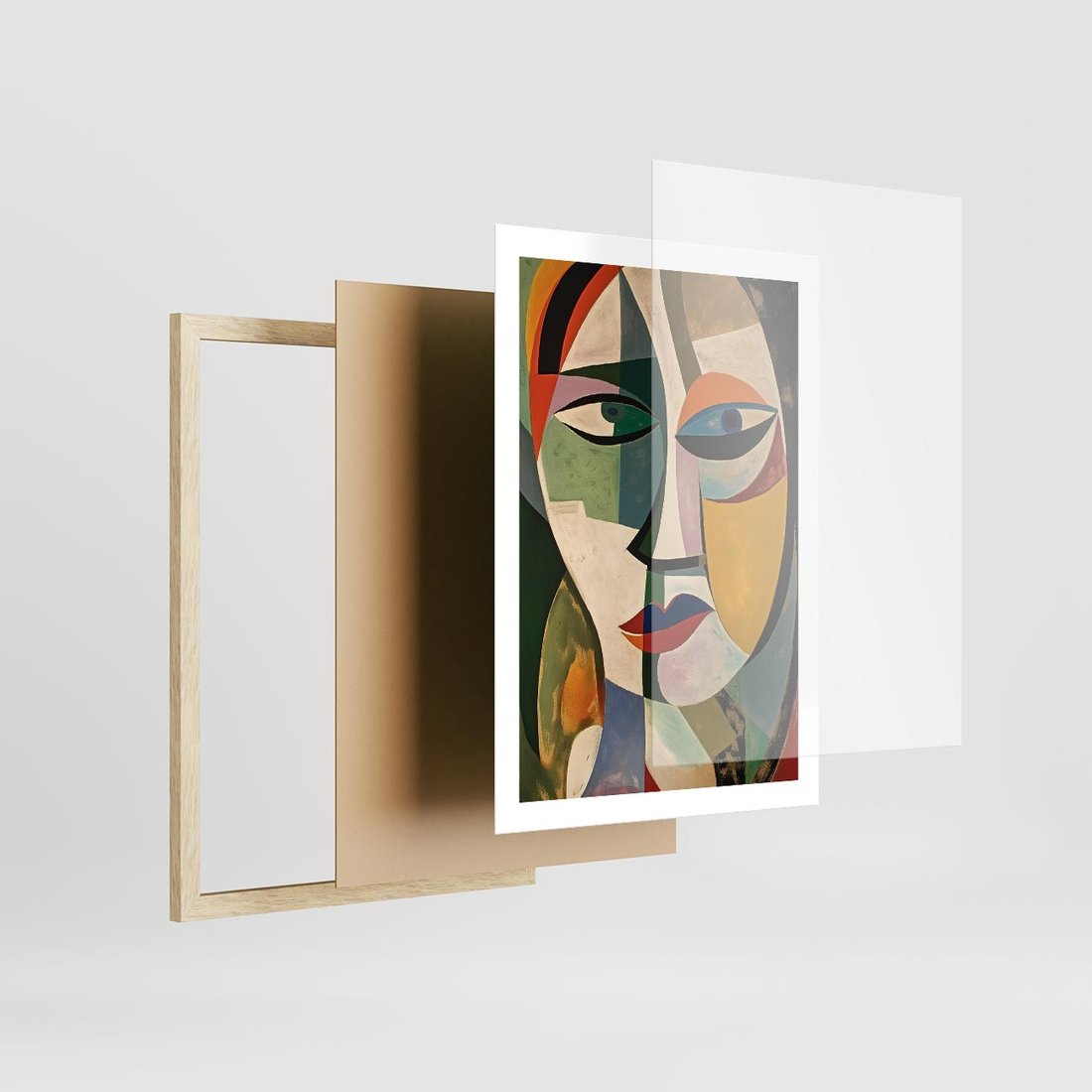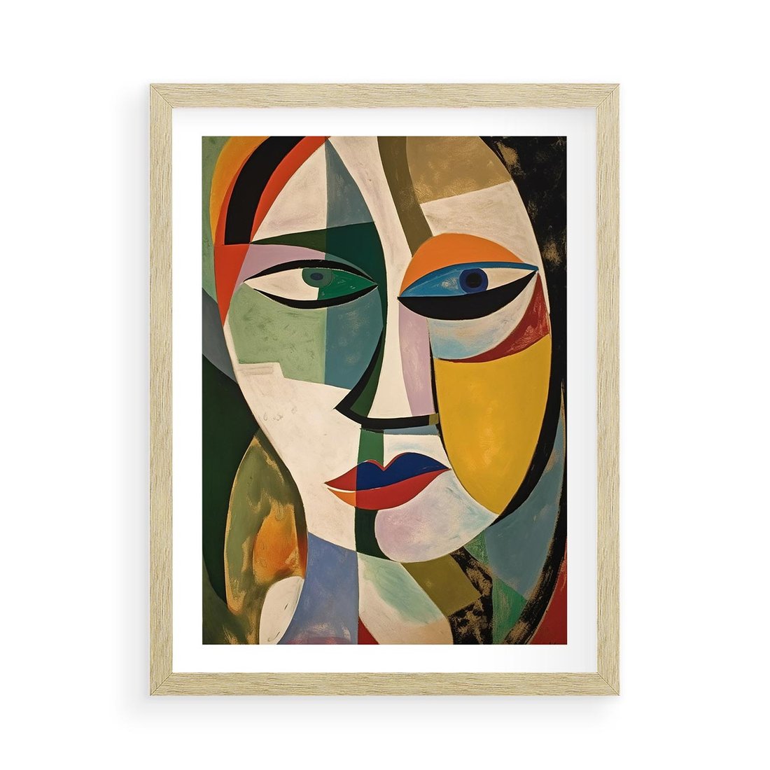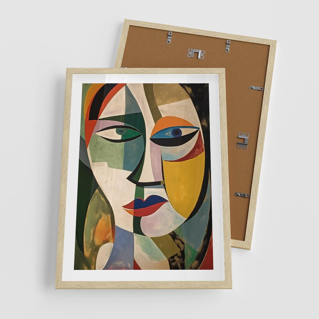 Ten abstrakcyjny obraz olejny przedstawia twarz kobiety w stylu nawiązującym do Picassa. Żywe i ekspresyjne kolory tworzą dynamiczną kompozycję, ukazującą emocje i indywidualność. To unikalne dzieło sztuki wyróżni się w każdym wnętrzu.