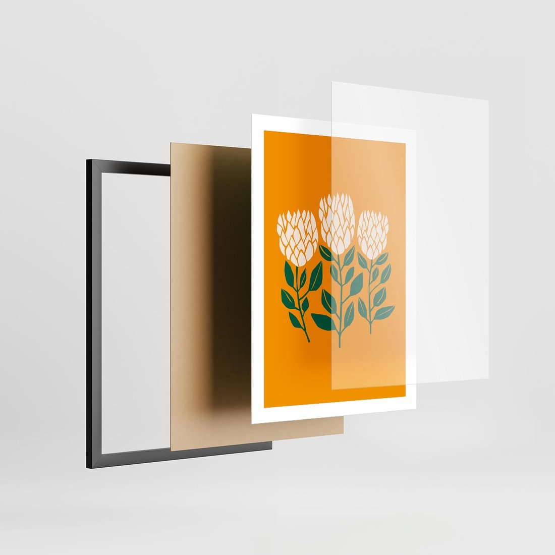 Ten nowoczesny plakat prezentuje abstrakcyjną kwiatową kompozycję na intensywnym, żółtym tle. Sztuka ta wprowadza optymizm i wibracje do Twojego salonu, tworząc pełne energii i wyrazistości otoczenie, które przyciąga uwagę i dodaje charakteru przestrzeni.