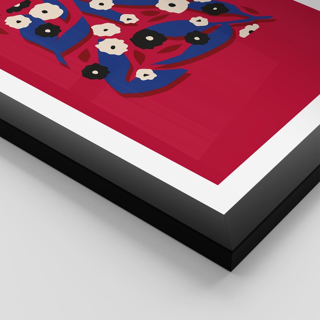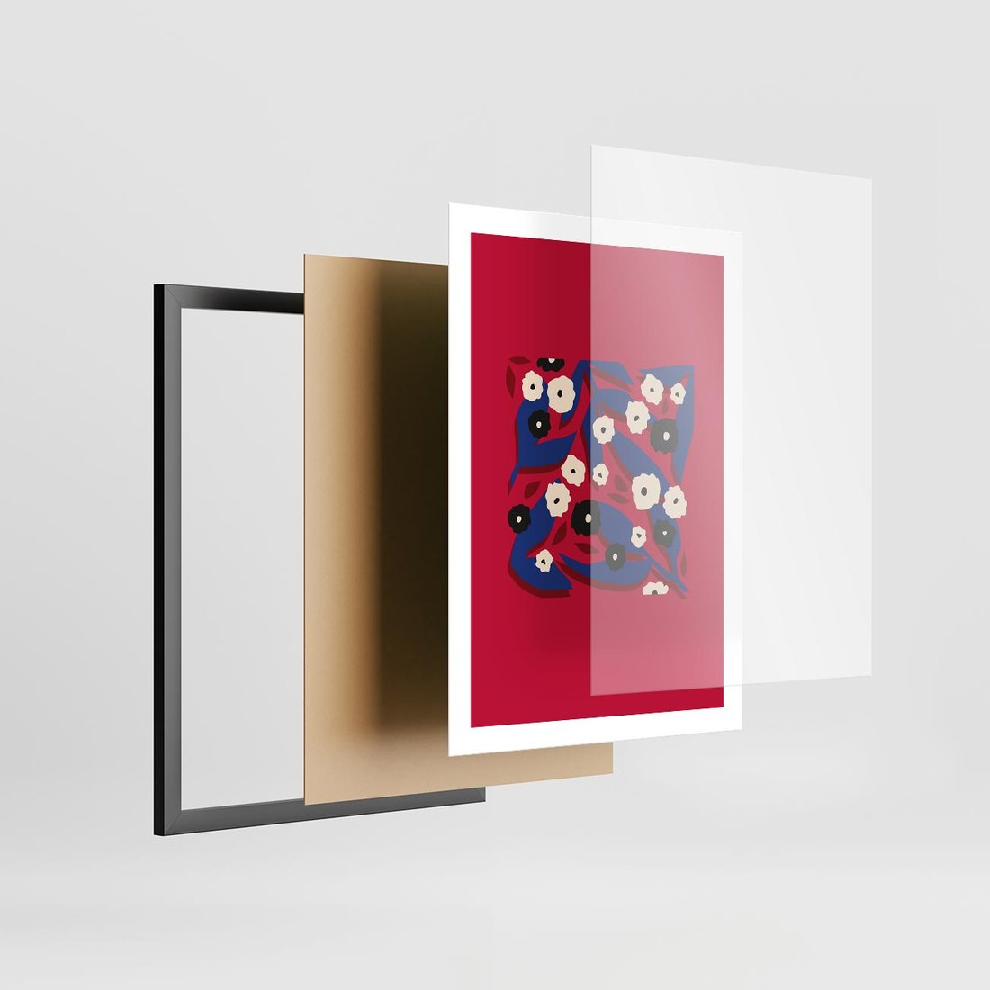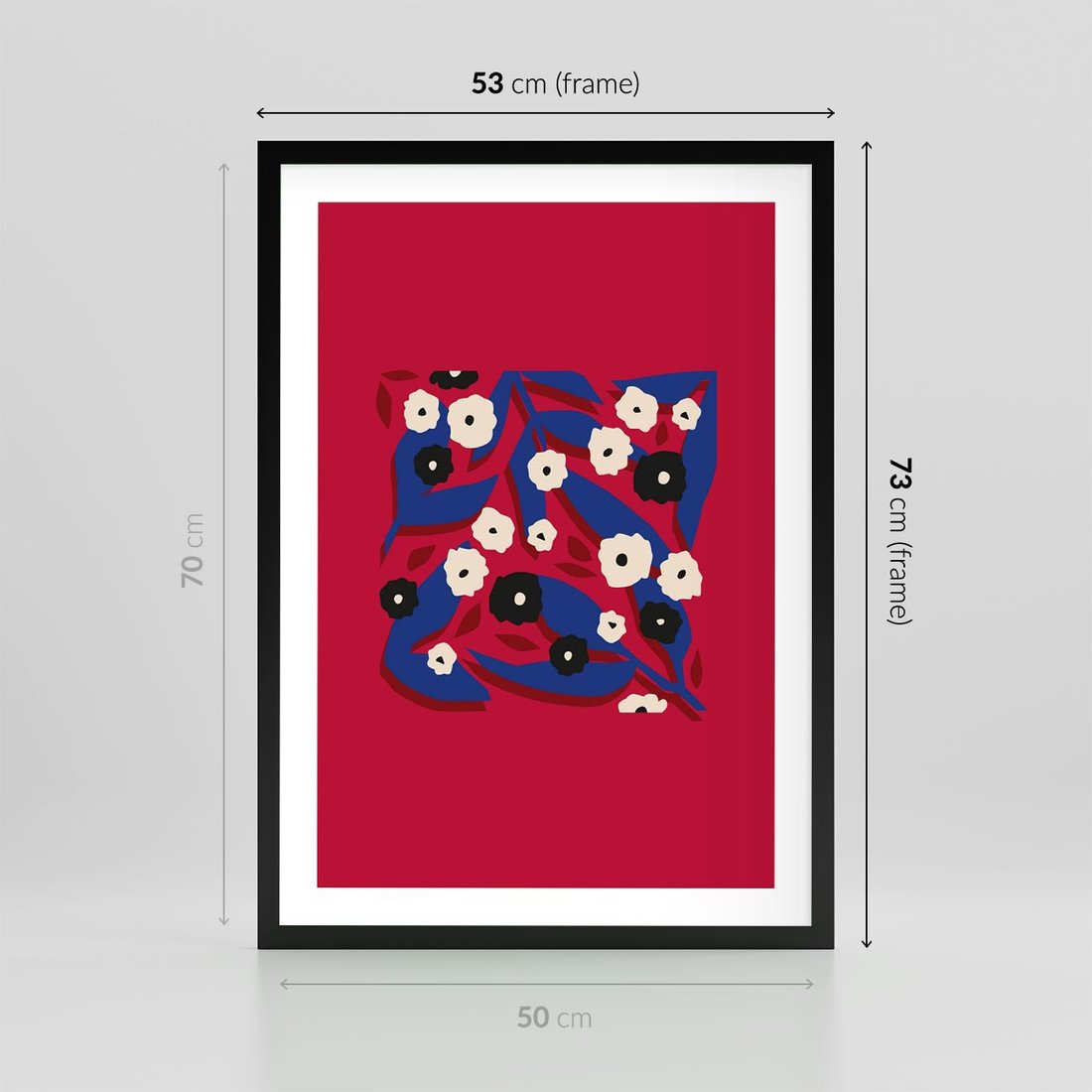 Plakat w ramie 50x70 - Kolorowe Przenikanie - abstrakcyjna kwiatowa kompozycja, czerwone mocne tło - rama czarna