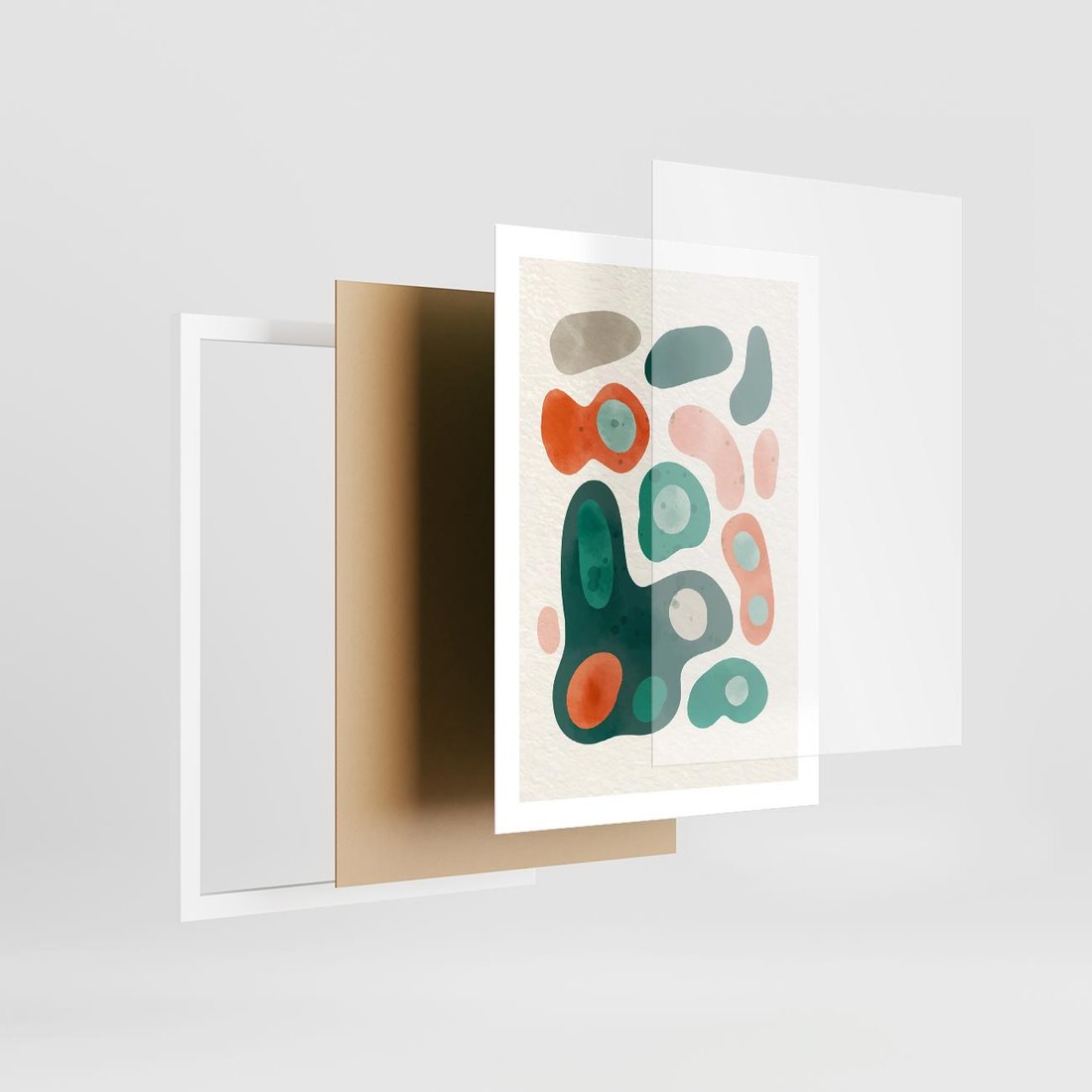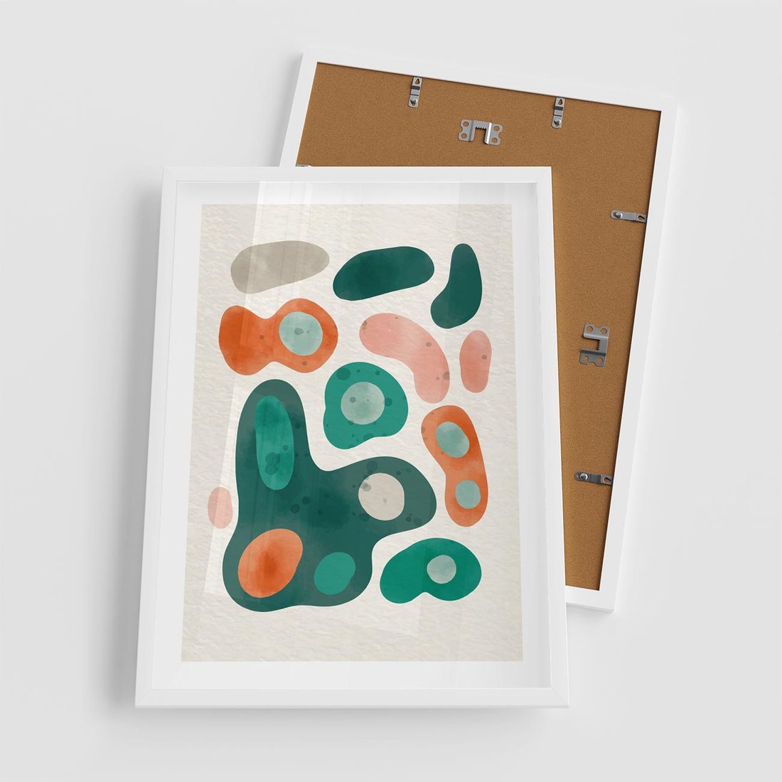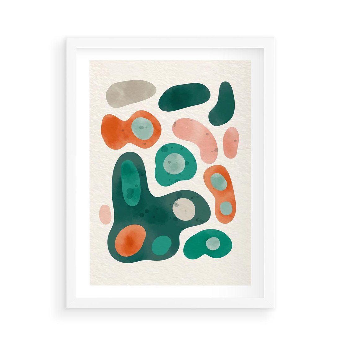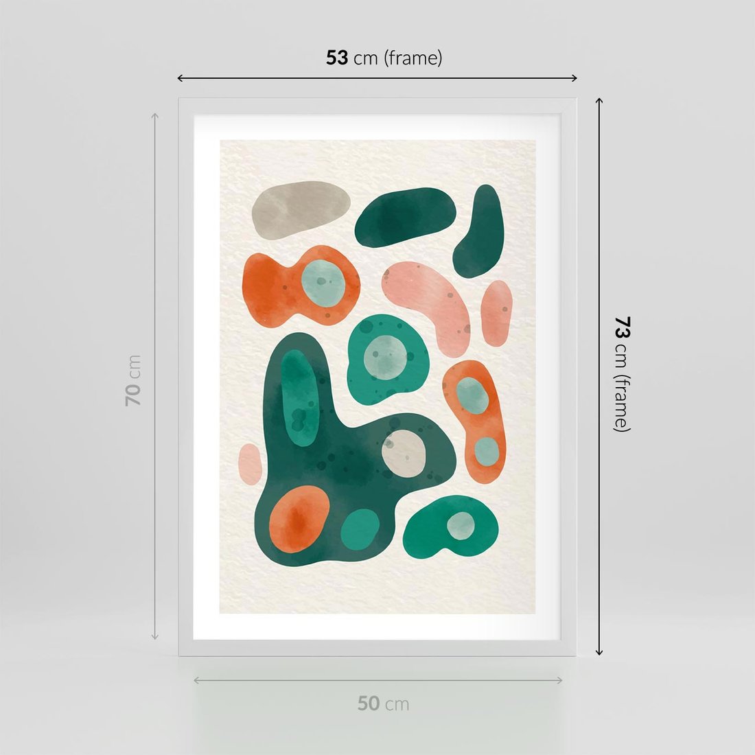 Plakat w ramie 50x70 - Kolorowe Przenikanie - przypadkowe abstrakcyjne plamy, pomarańczowy i zielony - rama biała