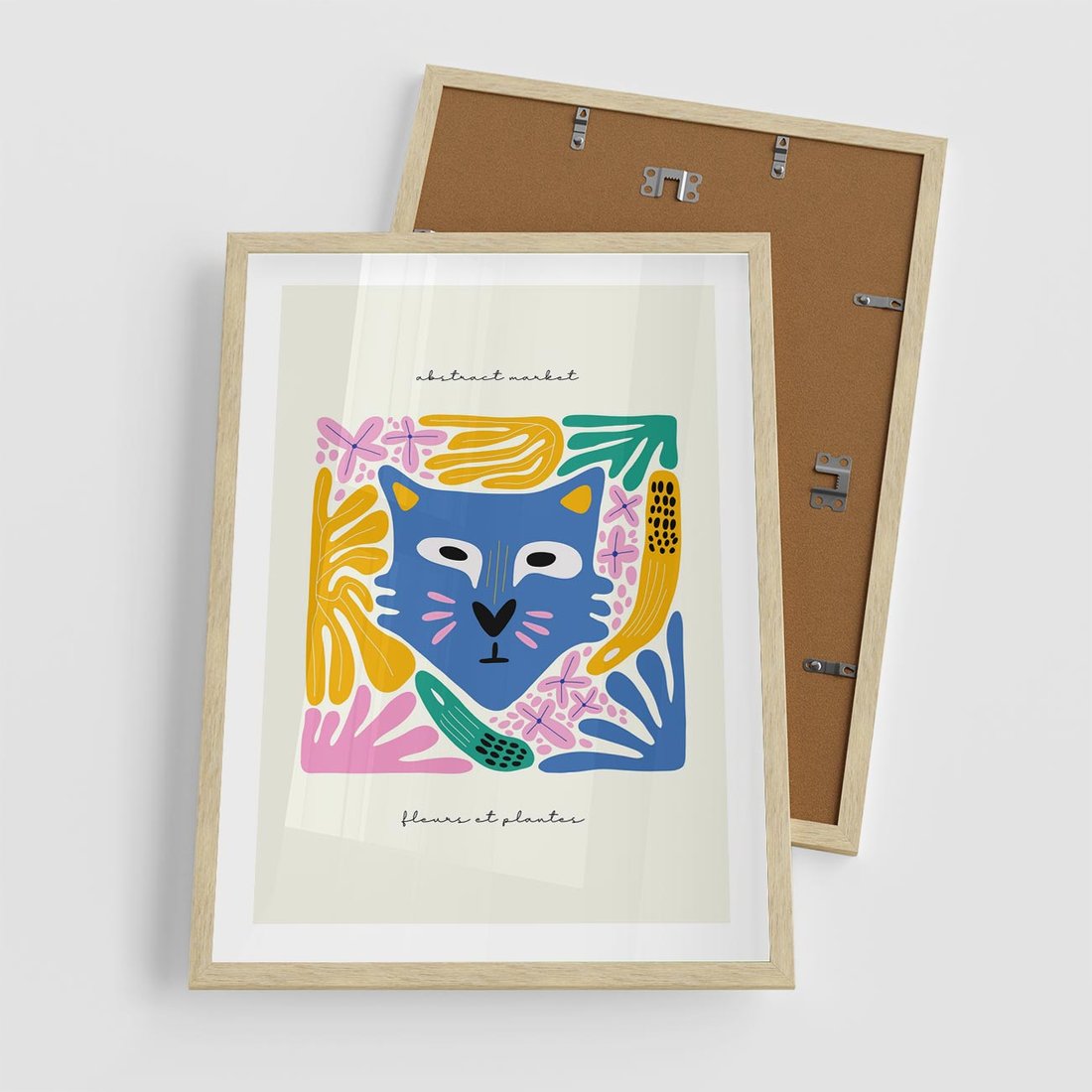 Ten abstrakcyjny plakat przenosi nas w świat eklektycznej sztuki, przedstawiając niebieskiego kota w otoczeniu pastelowych kolorów. Doskonale nadaje się jako ozdoba do salonu, dodając przestrzeni niezwykłego uroku i wyjątkowej atmosfery artystycznego zróżnicowania.
