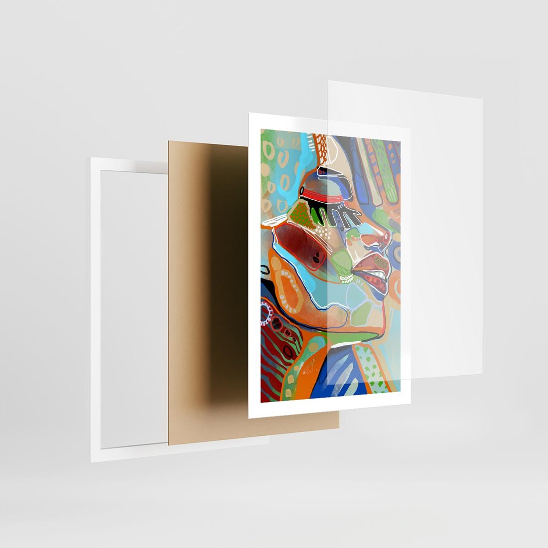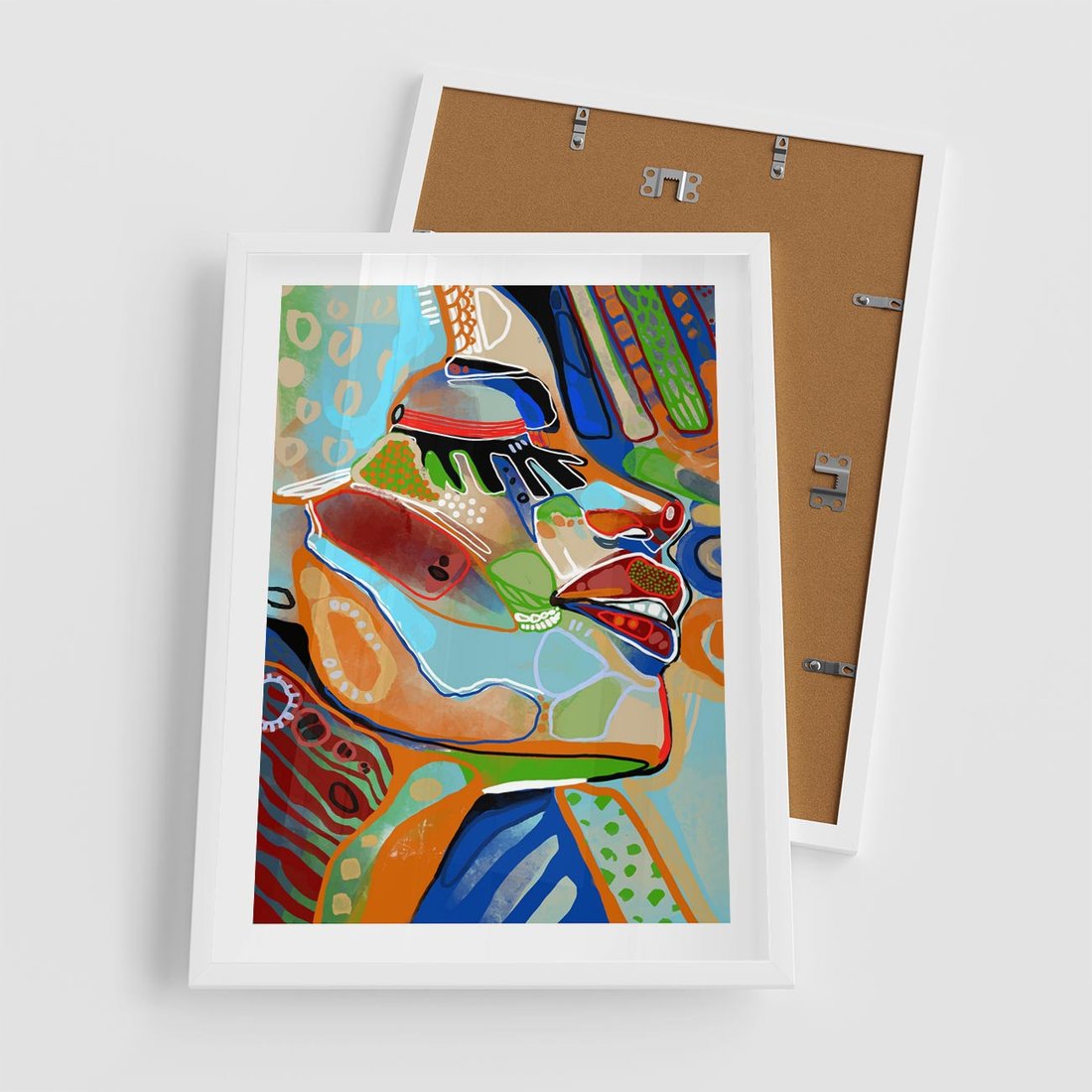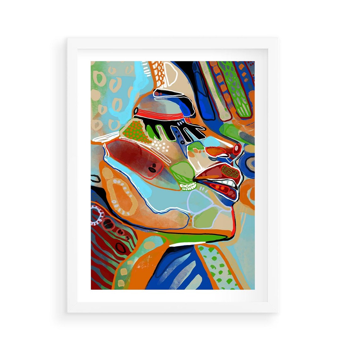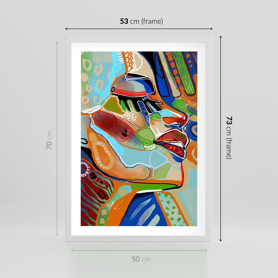 Plakat w ramie 50x70 - Kolorowe Wnętrza Kształtów - abstrakcyjny portret kobiety, twarz - rama biała