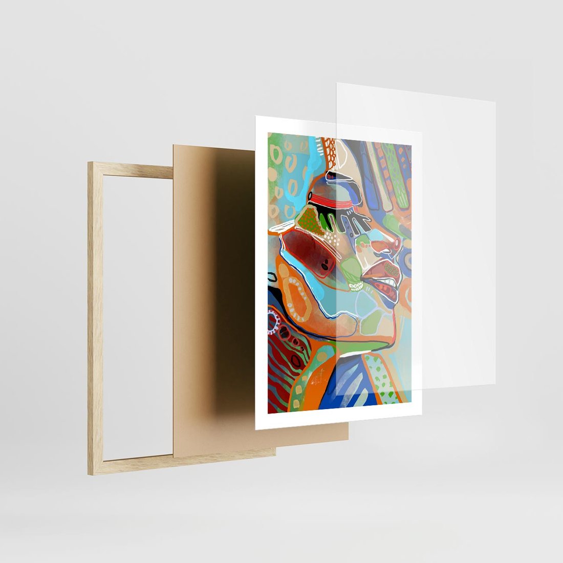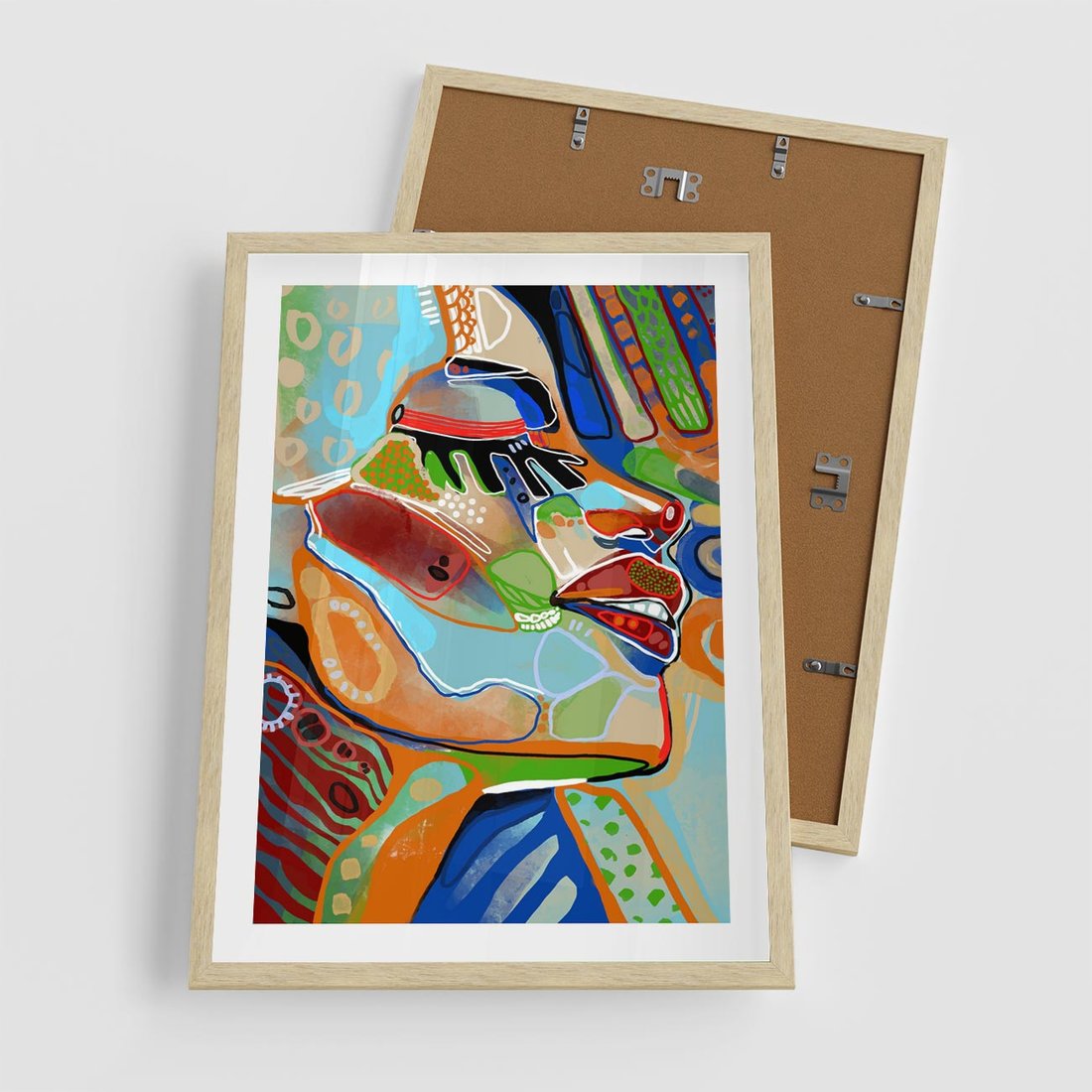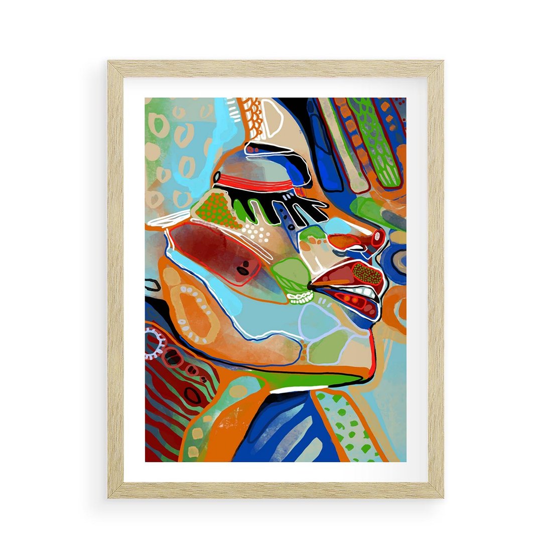 Plakat w ramie 50x70 - Kolorowe Wnętrza Kształtów - abstrakcyjny portret kobiety, twarz - rama drewno