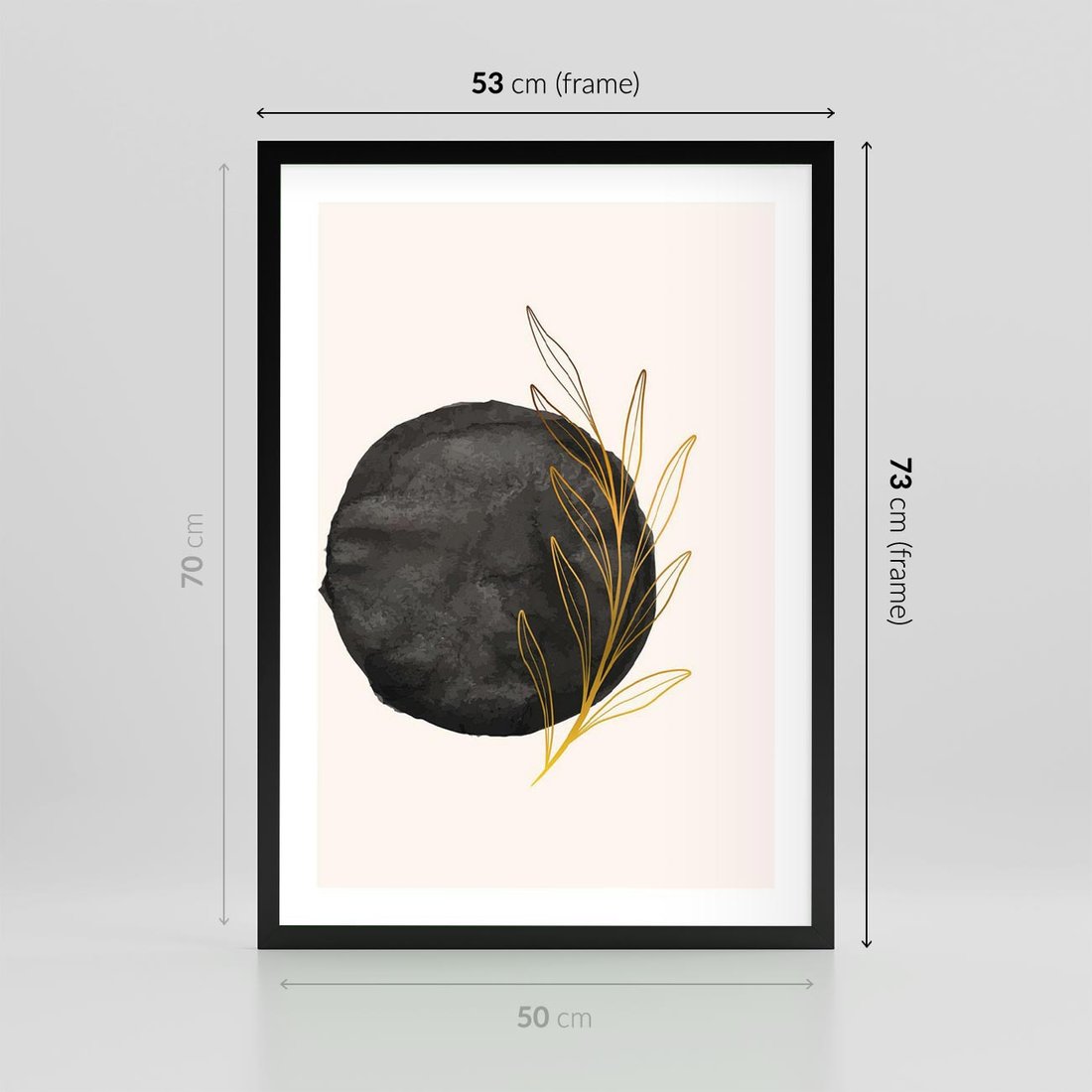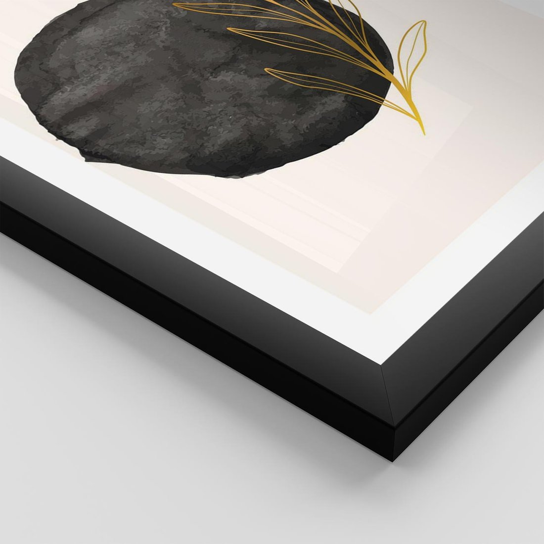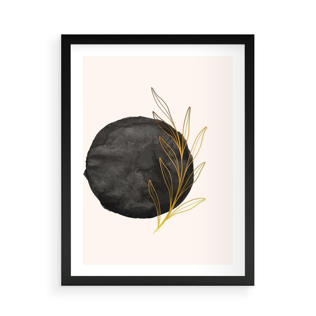 To minimalistyczna grafika, w której dominuje czarna plama, a złota gałązka dodaje delikatnego kontrastu. Ta kompozycja przyciąga uwagę swoją prostotą i elegancją.