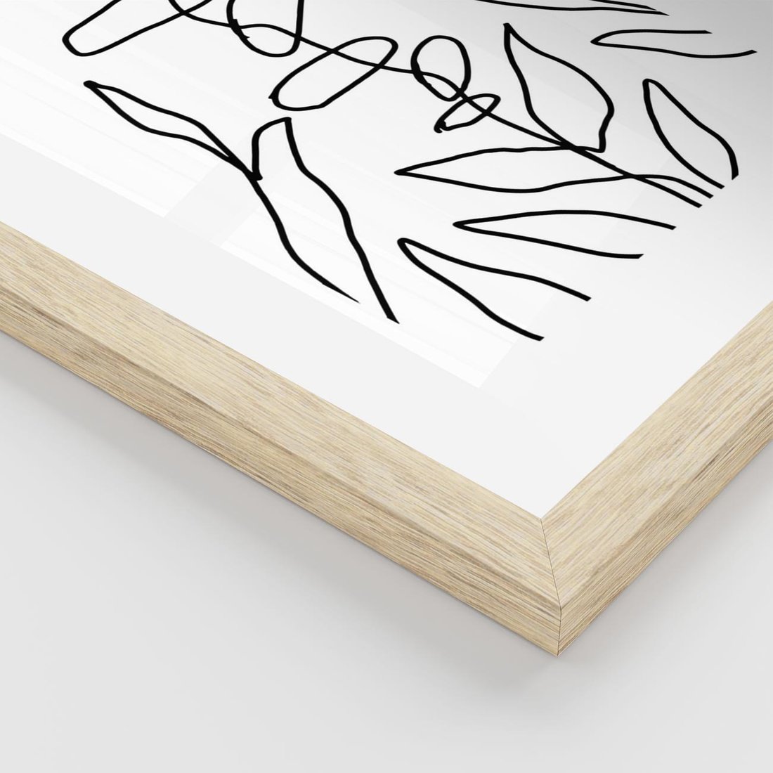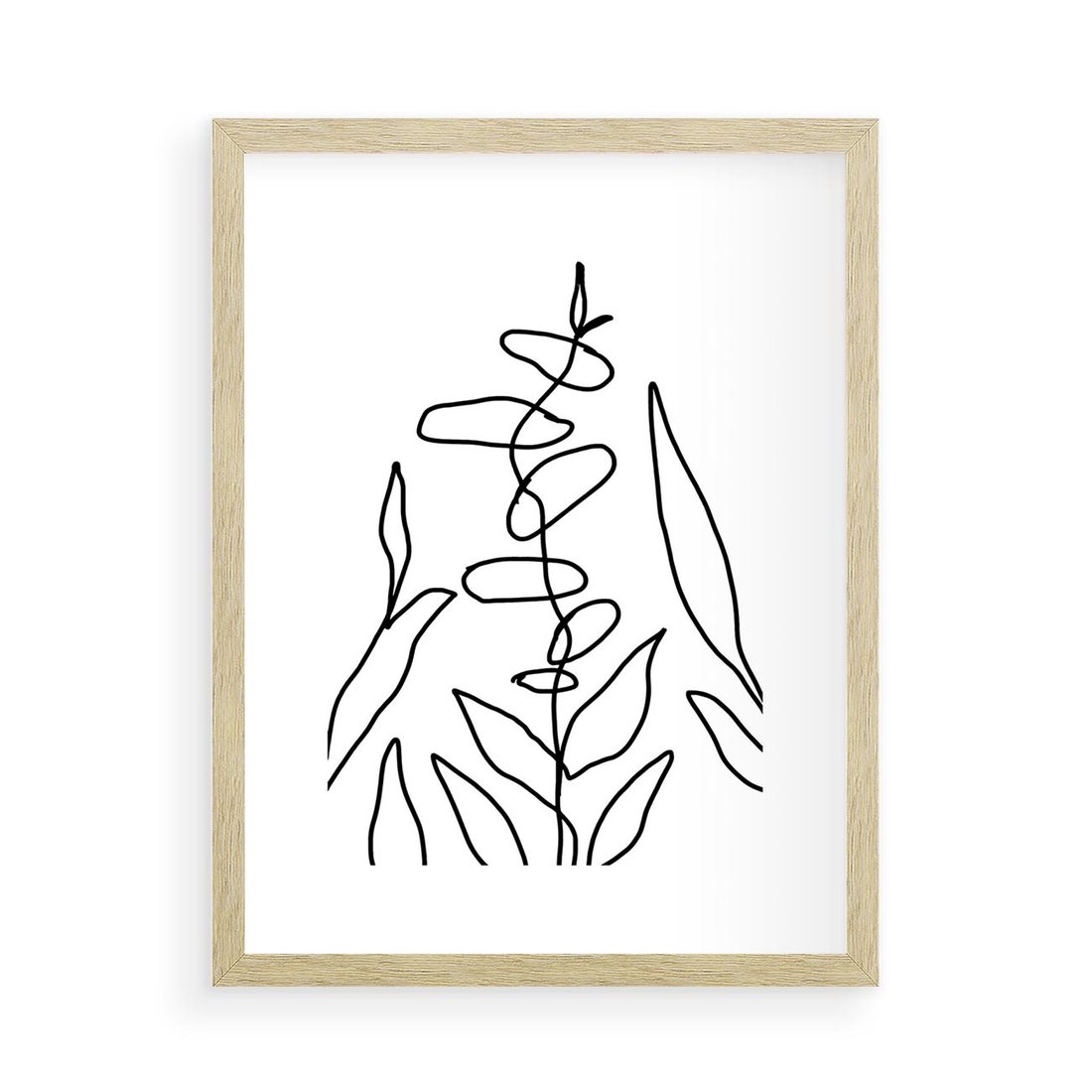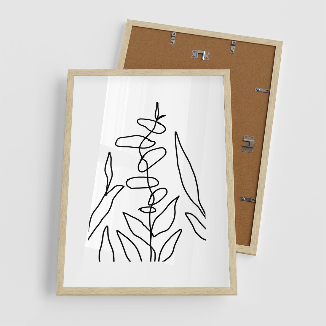 Czarny szkic liści na jasnym tle wprowadza mroczny minimalizm do przestrzeni, tworząc kontrast i tajemniczą atmosferę.