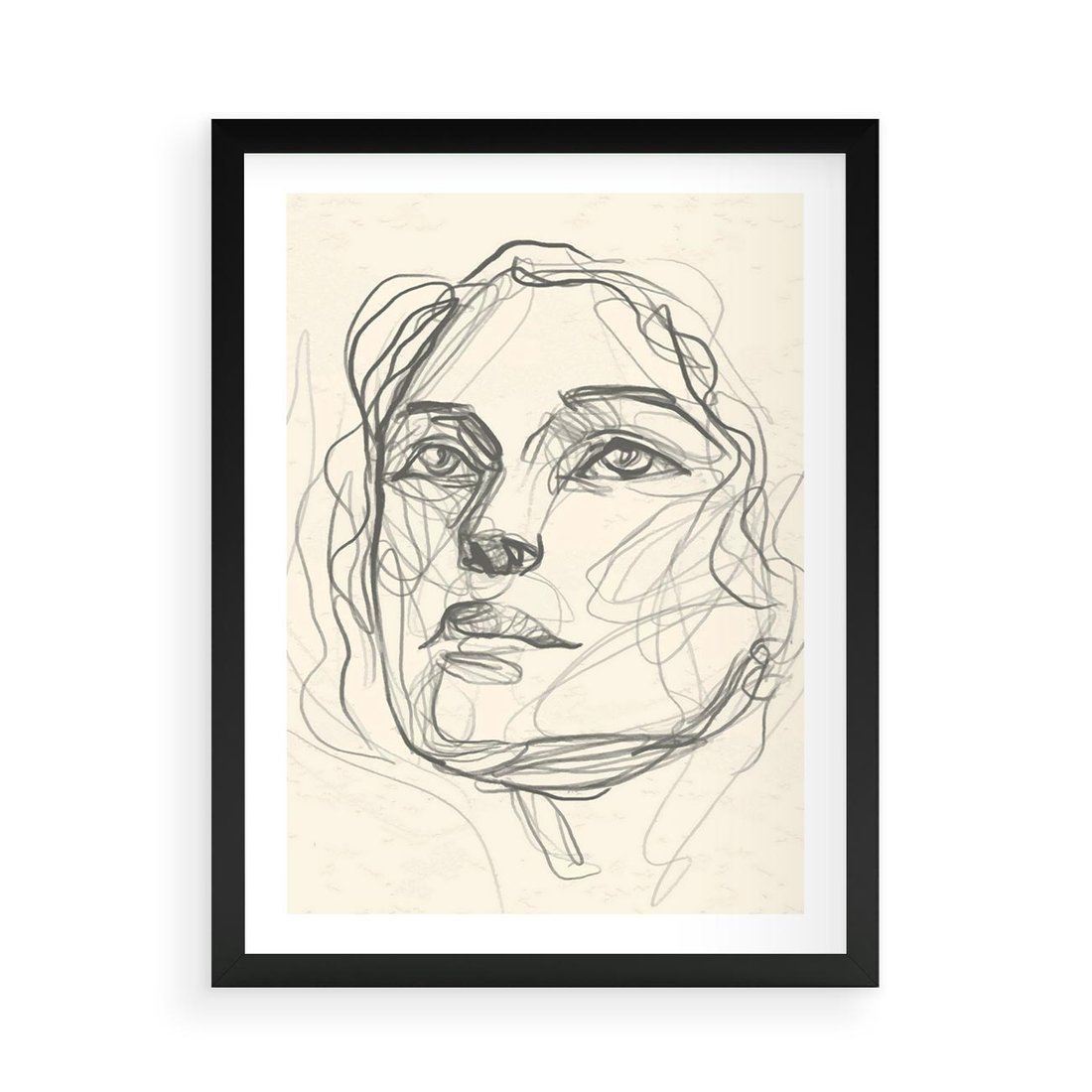 Minimalistyczny szkic twarzy kobiety na plakacie emanuje delikatnością i wyrafinowanym stylem, idealny do dodania subtelnej klasy do przestrzeni.