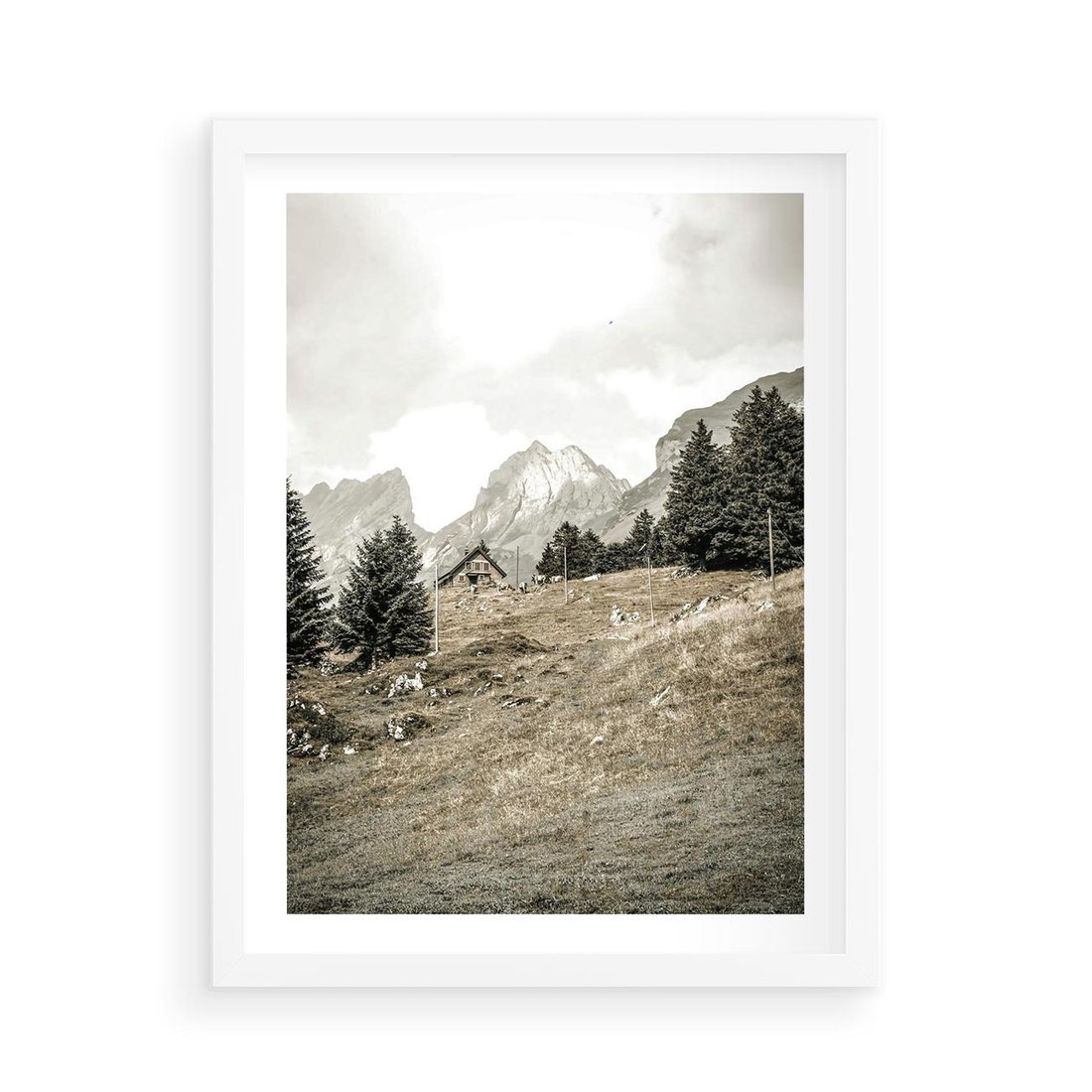 Plakat w ramie 50x70 - Krajobraz Sepii: Domek w Górach - domek w górach, góry - rama biała