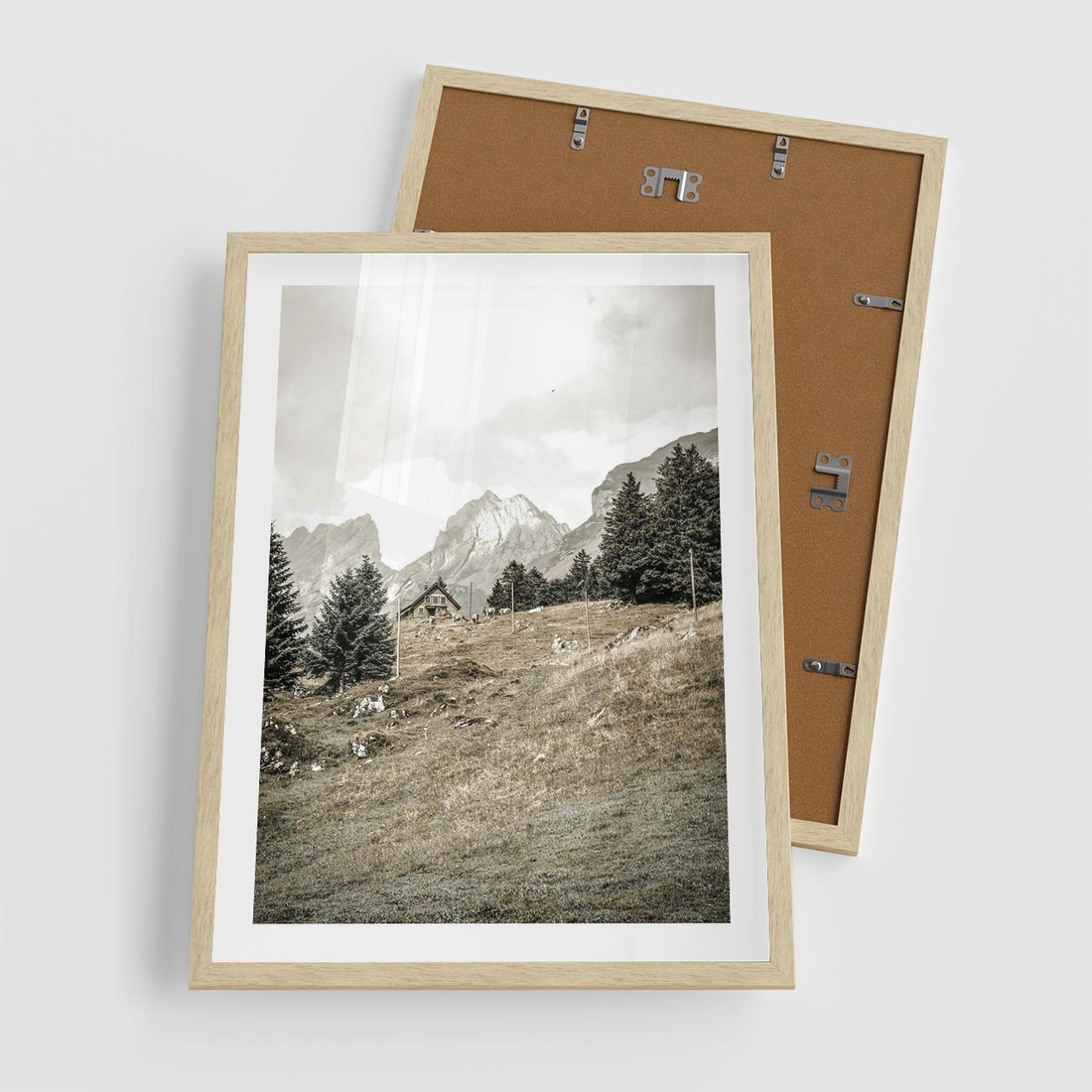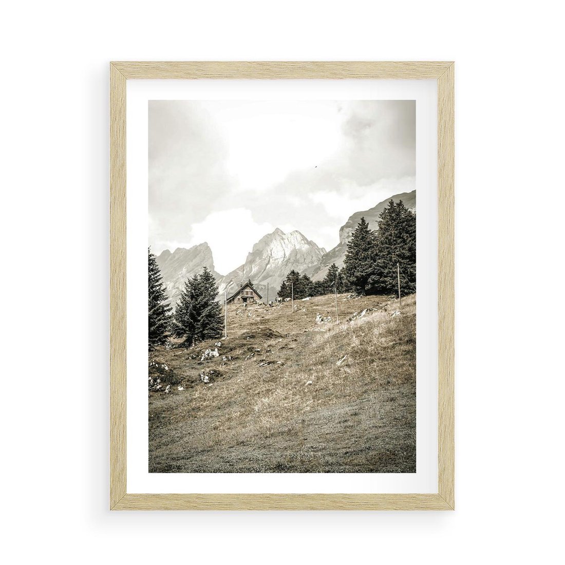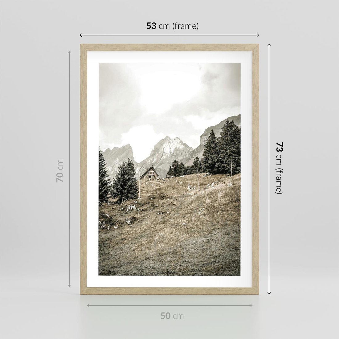Plakat w ramie 50x70 - Krajobraz Sepii: Domek w Górach - domek w górach, góry - rama drewno