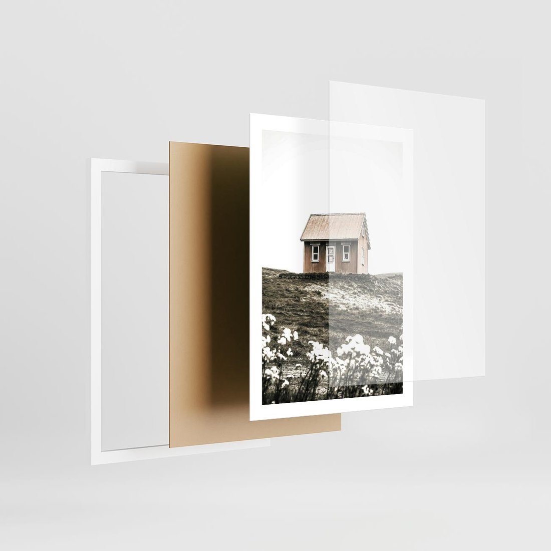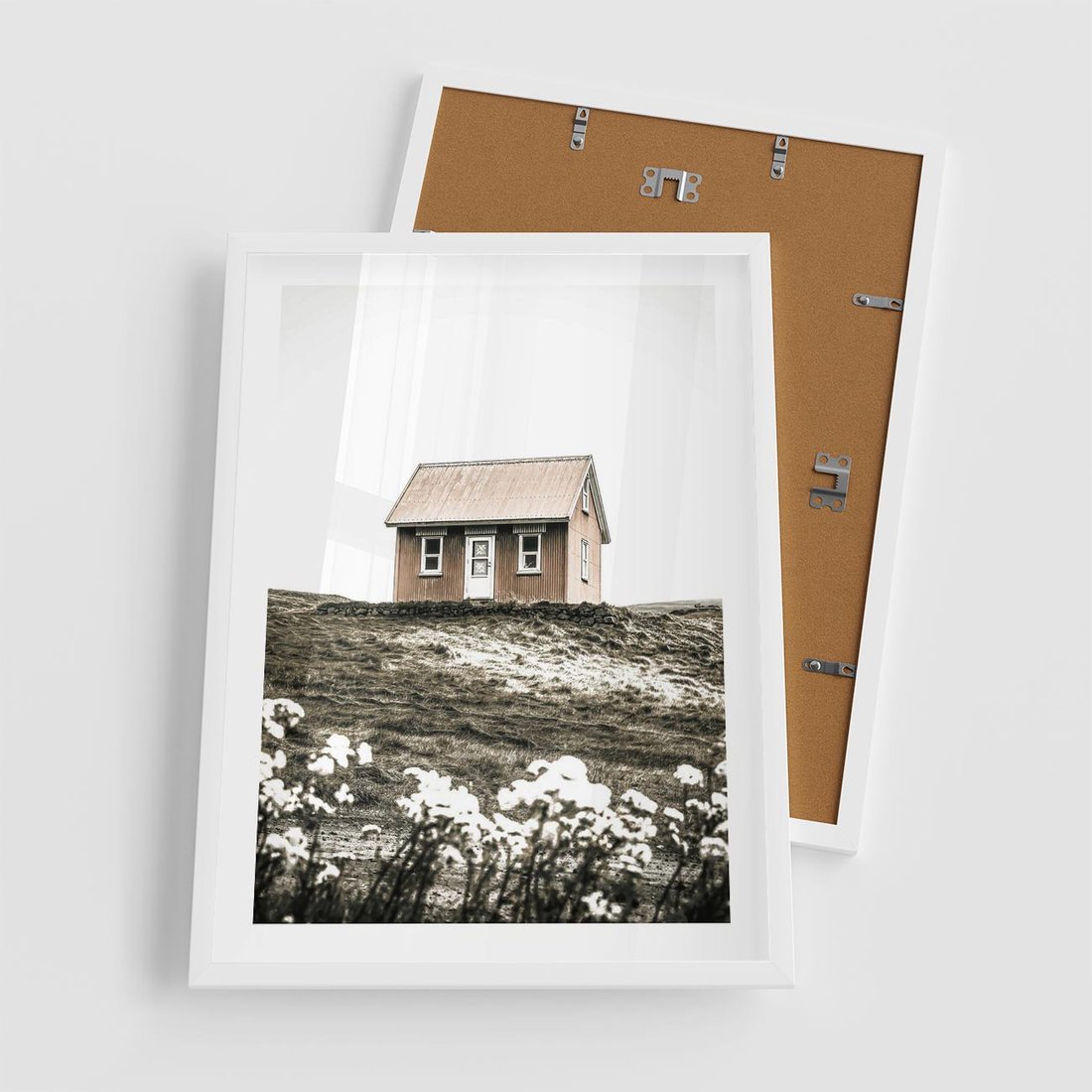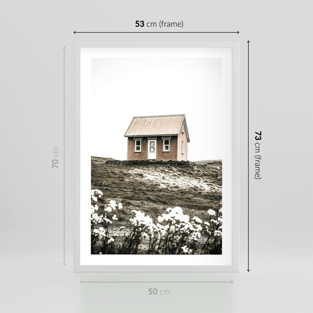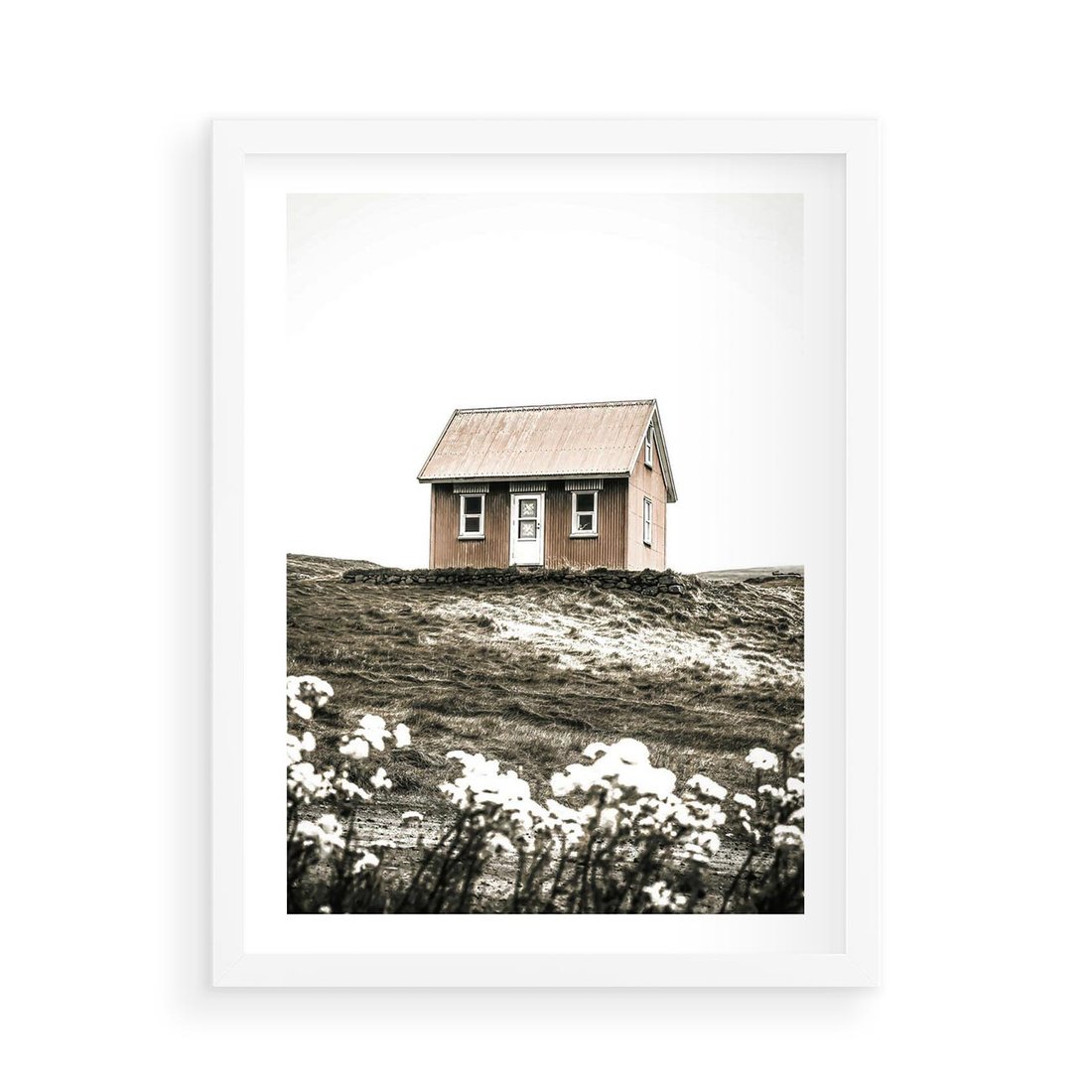 Plakat w ramie 50x70 - Krajobraz z Przeszłości: Kwitnąca Łąka w Sepii - domek na wzgórzu, kwitnąca łąka - rama biała