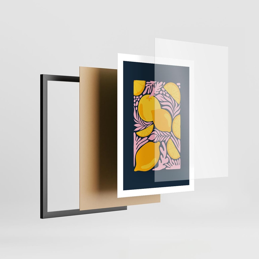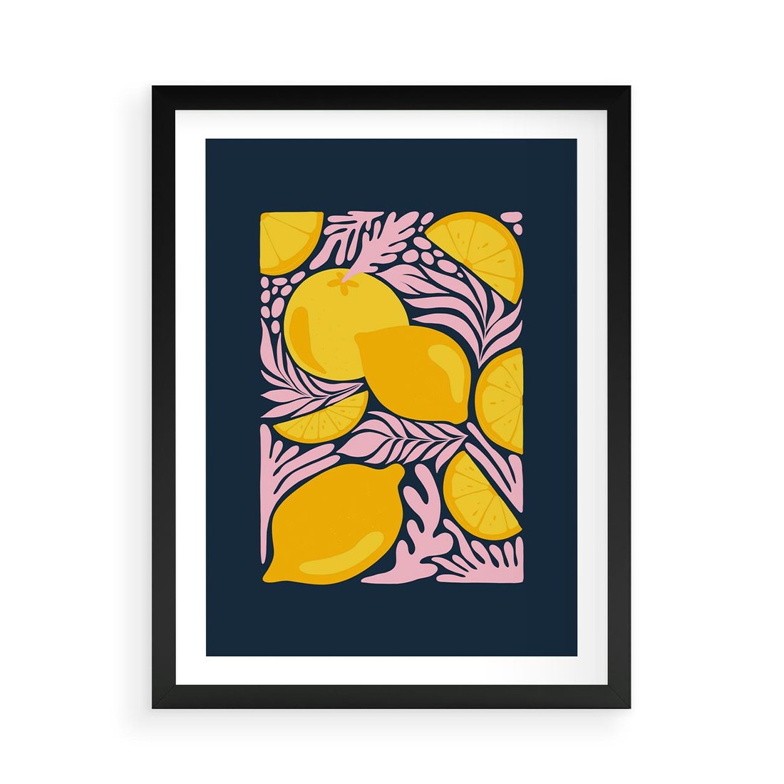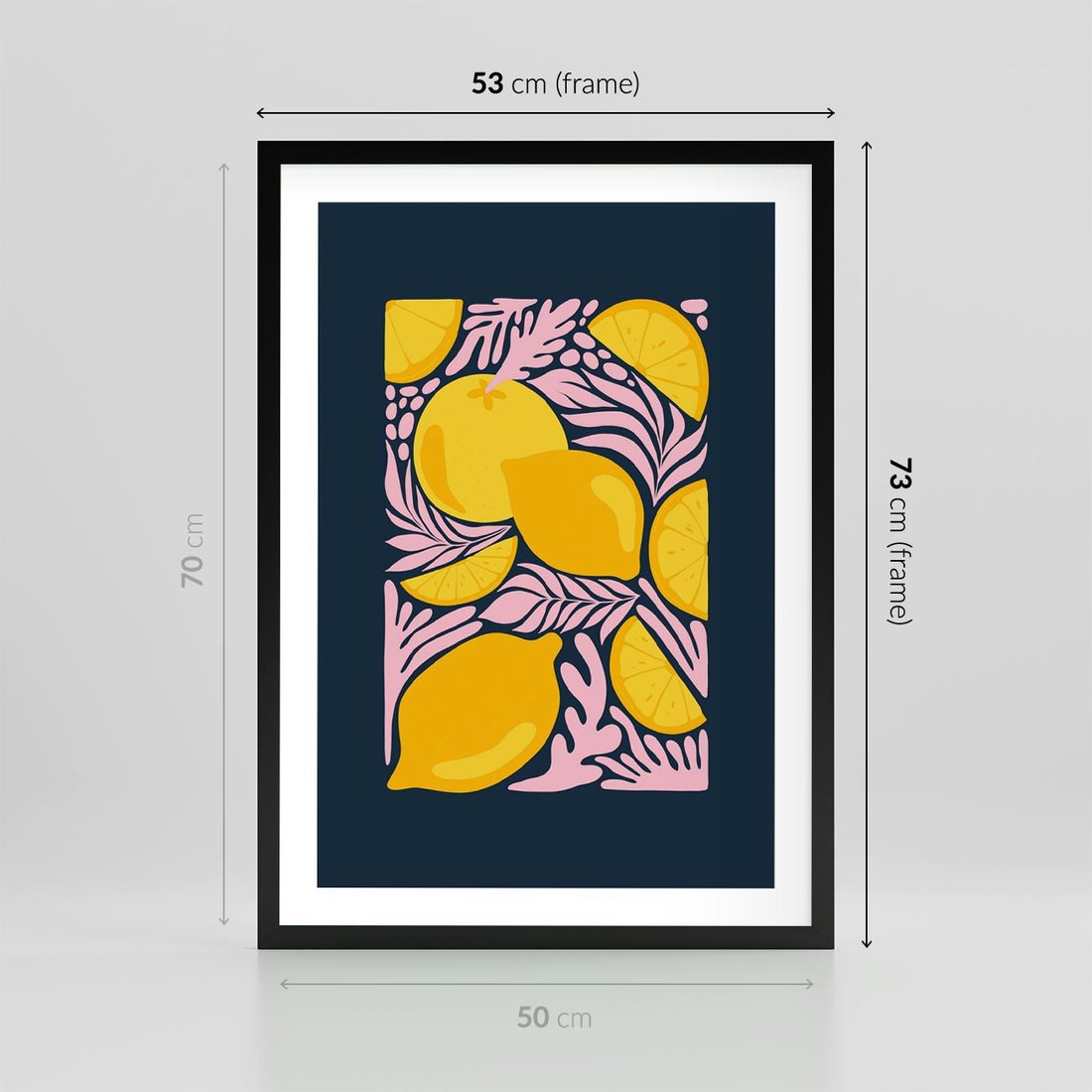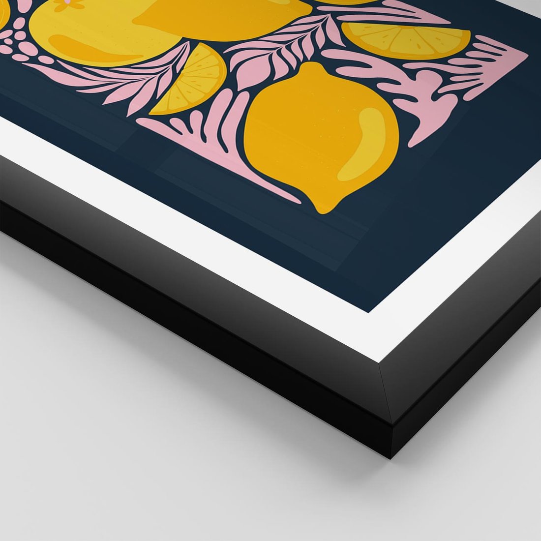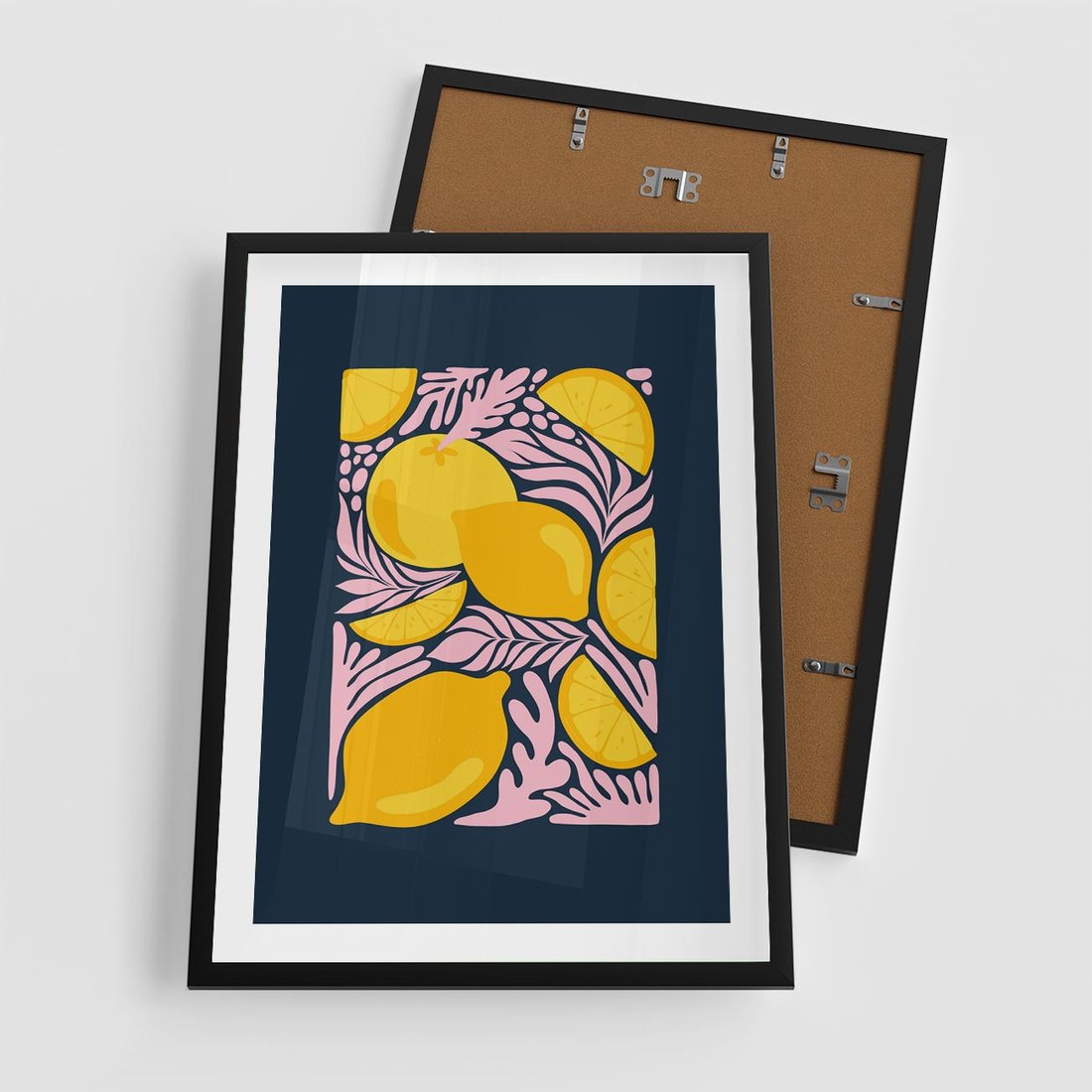 Ta nowoczesna kompozycja zestawia soczyste cytryny i liście na eleganckim granatowym tle. Sztuka ta wprowadza energetyczną świeżość i harmonię natury do przestrzeni, tworząc dynamiczną i stylową wizję.