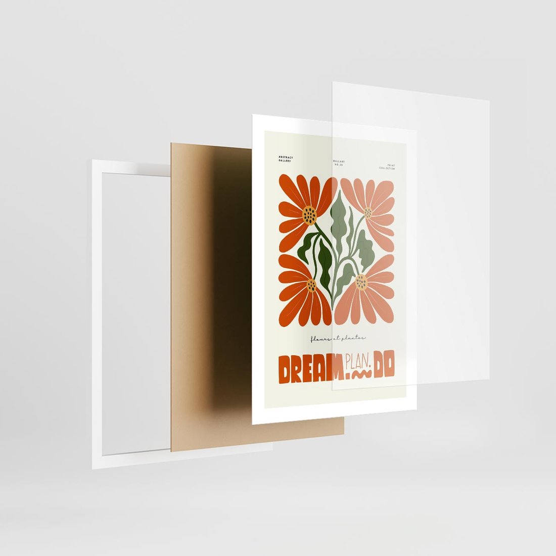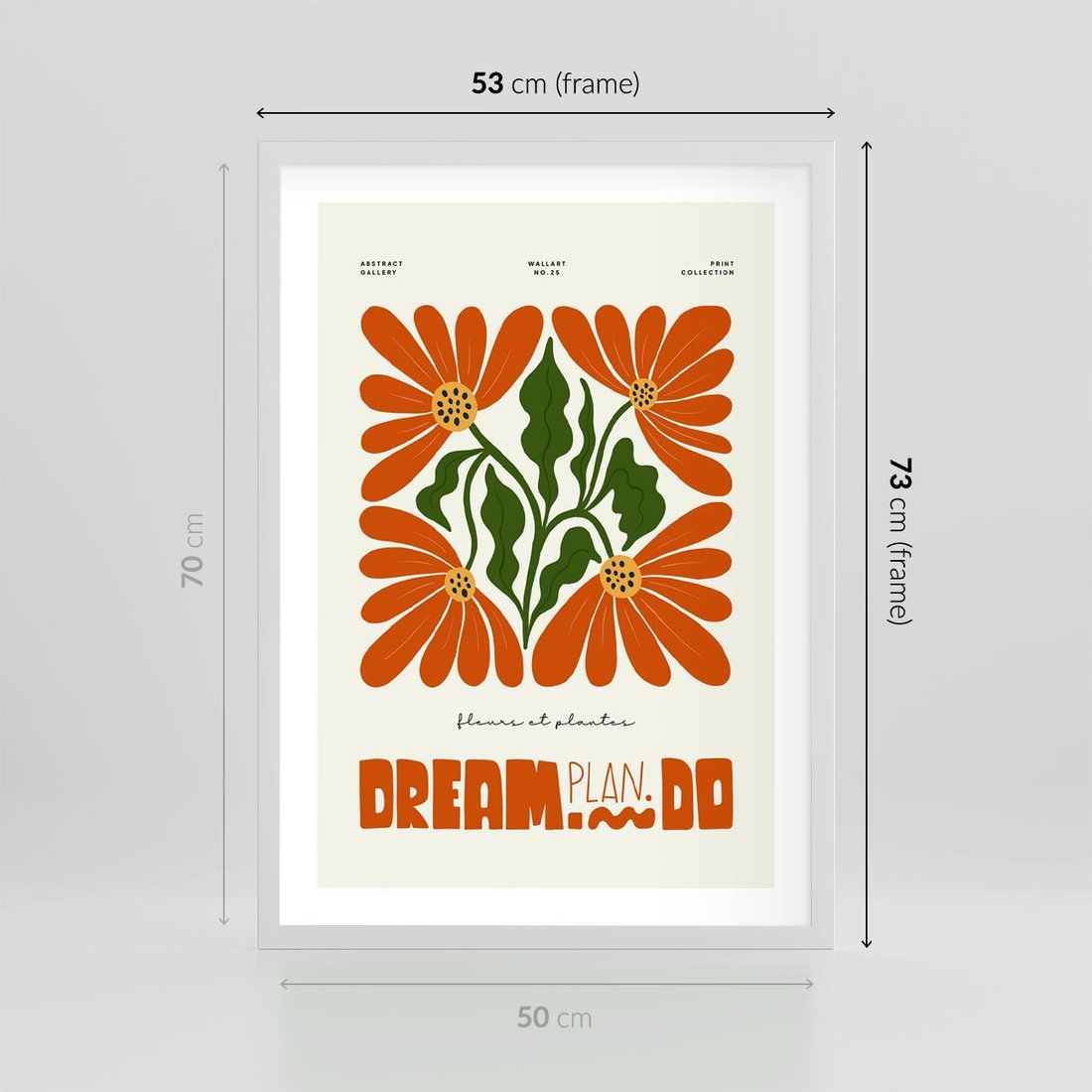 Ta nowoczesna sztuka w abstrakcyjnym stylu ożywia przestrzeń kolorowymi kwiatowymi motywami. Wyjątkowa typografia dodaje głębi i wyraża siłę wyrazu w tej pełnej energii kompozycji.