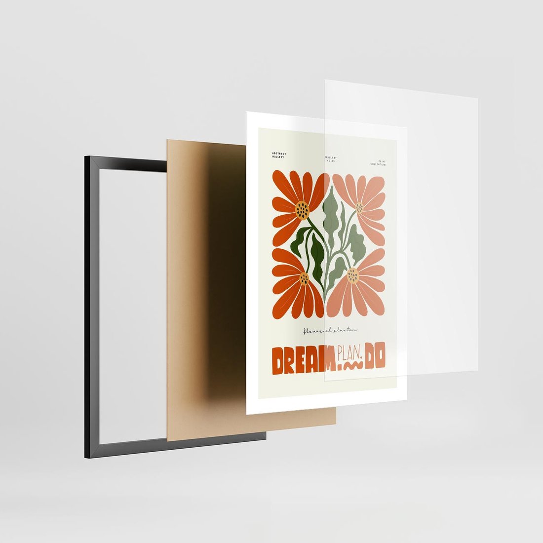 Ta nowoczesna sztuka w abstrakcyjnym stylu ożywia przestrzeń kolorowymi kwiatowymi motywami. Wyjątkowa typografia dodaje głębi i wyraża siłę wyrazu w tej pełnej energii kompozycji.