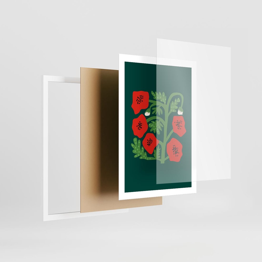 Ten nowoczesny plakat prezentuje abstrakcyjną kwiatową kompozycję na głębokim, zielonym tle. Sztuka ta wnosi witalność i harmonię natury do Twojego salonu, tworząc przestrzeń pełną życia i inspiracji, która zachęca do wewnętrznej refleksji i wyciszenia.