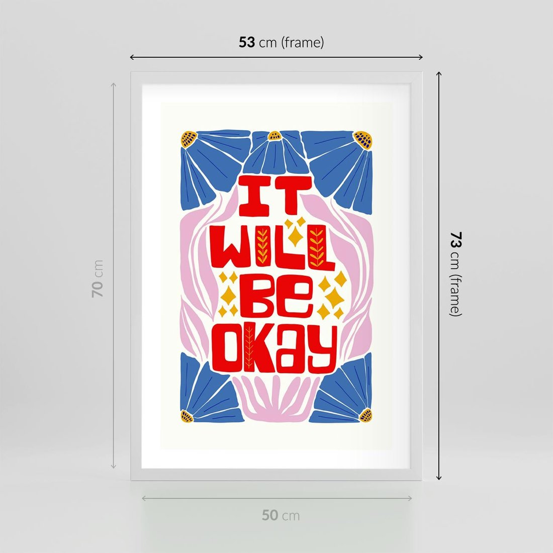 Plakat w ramie 50x70 - Kwiatowa Ekstaza - czerwona pozytywna typografia, kwiatowa kompozycja - rama biała