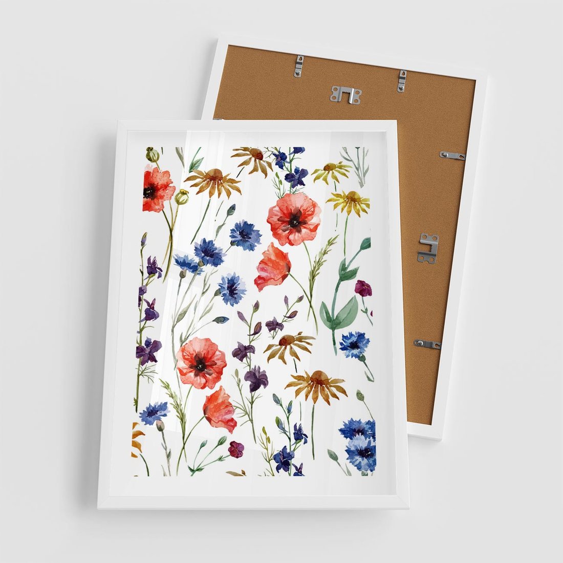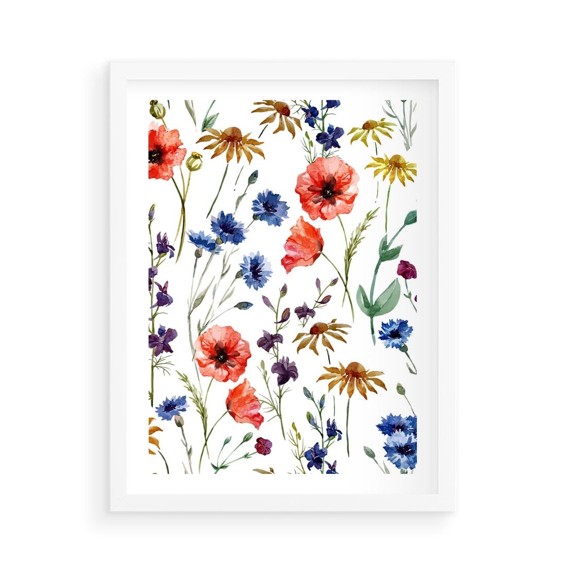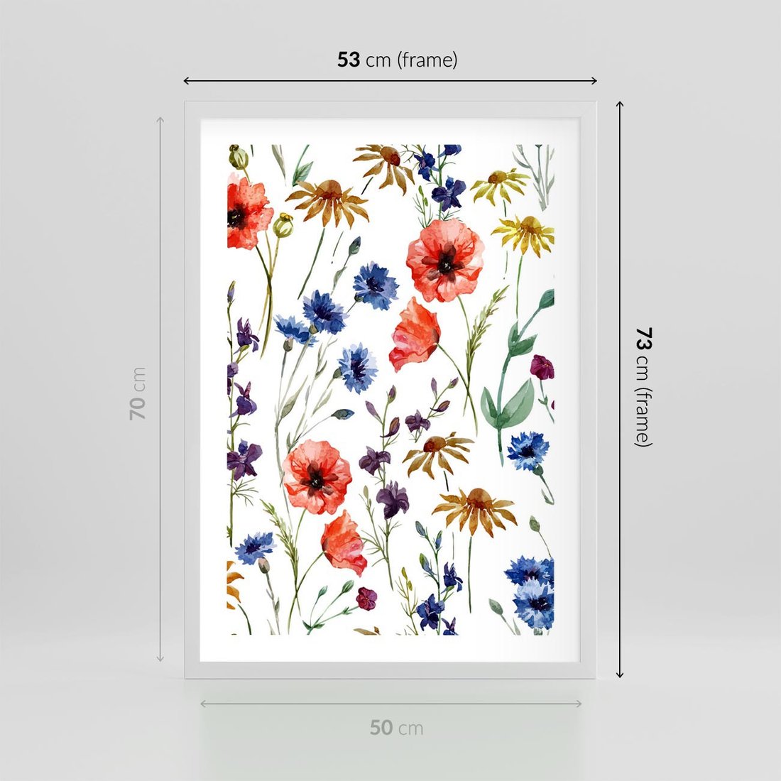 Plakat w ramie 50x70 - Kwiatowe radości na łące - kwiaty, łączka - rama biała